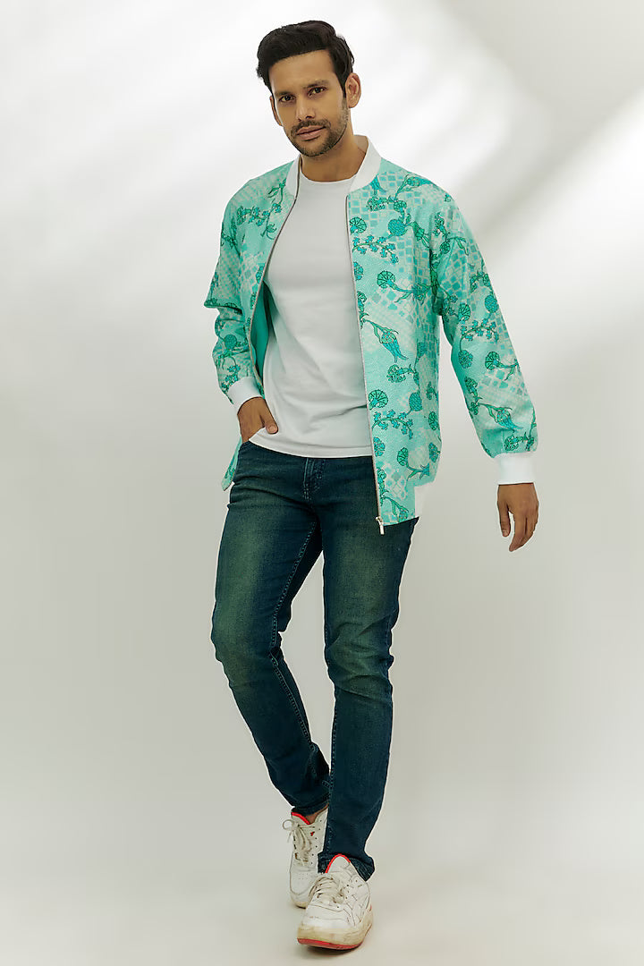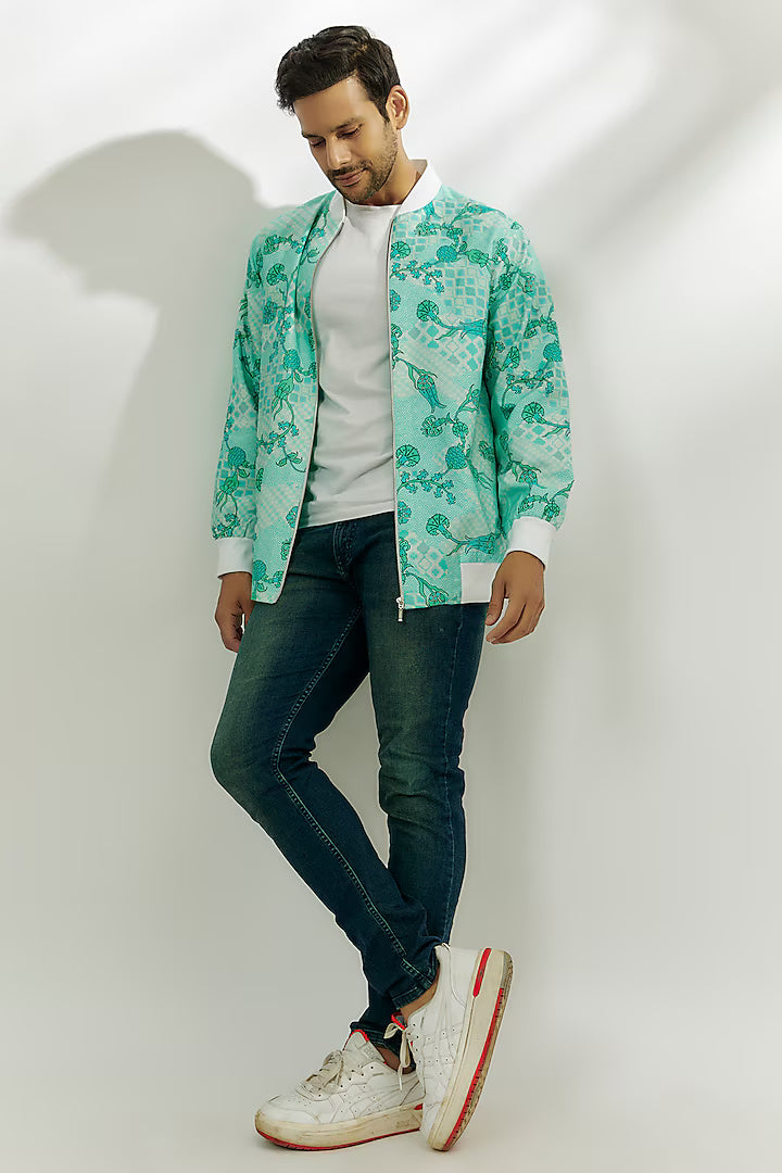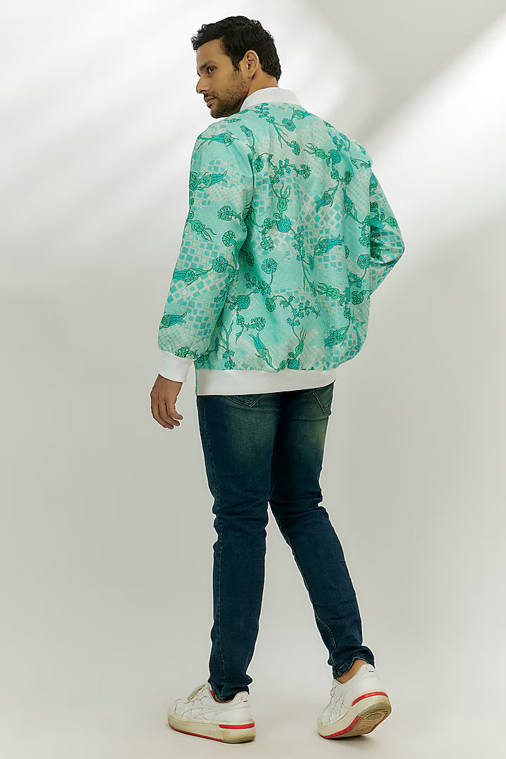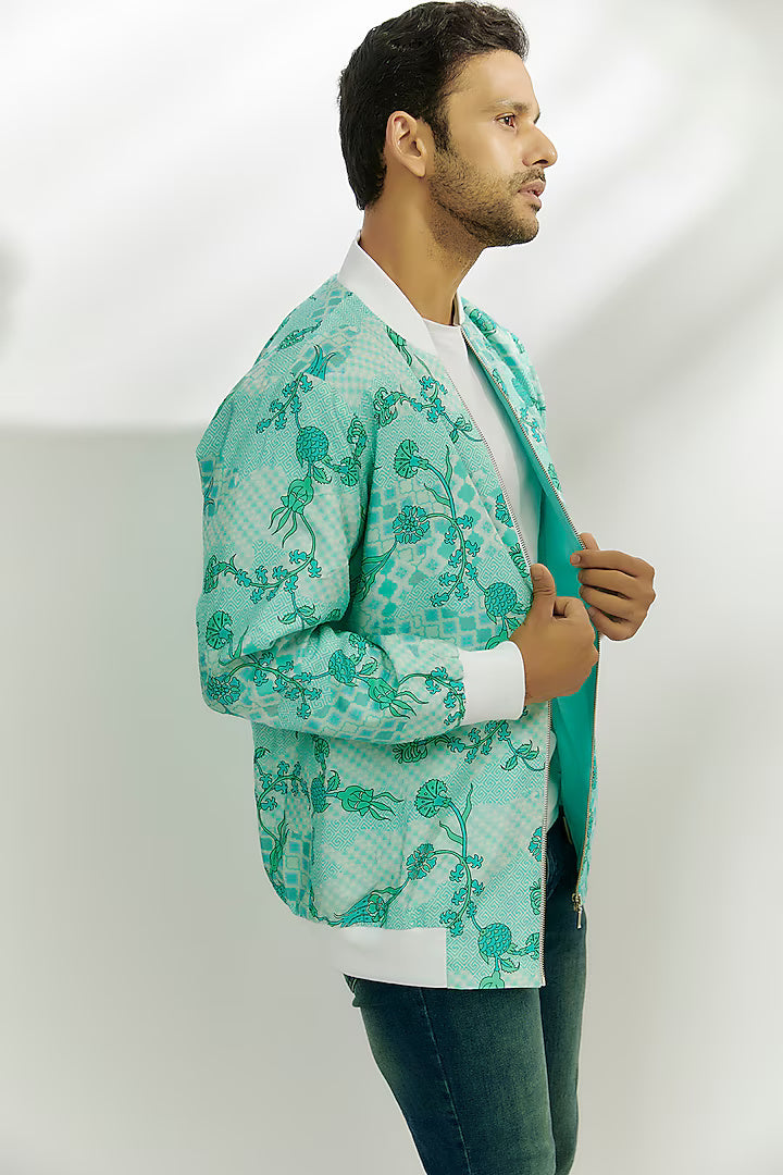 Umar Cyan Blue Viscose Dupion Digital Printed Bomber Jacket