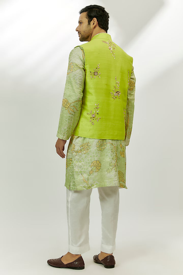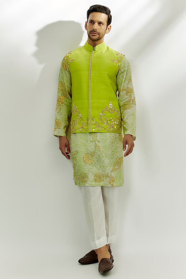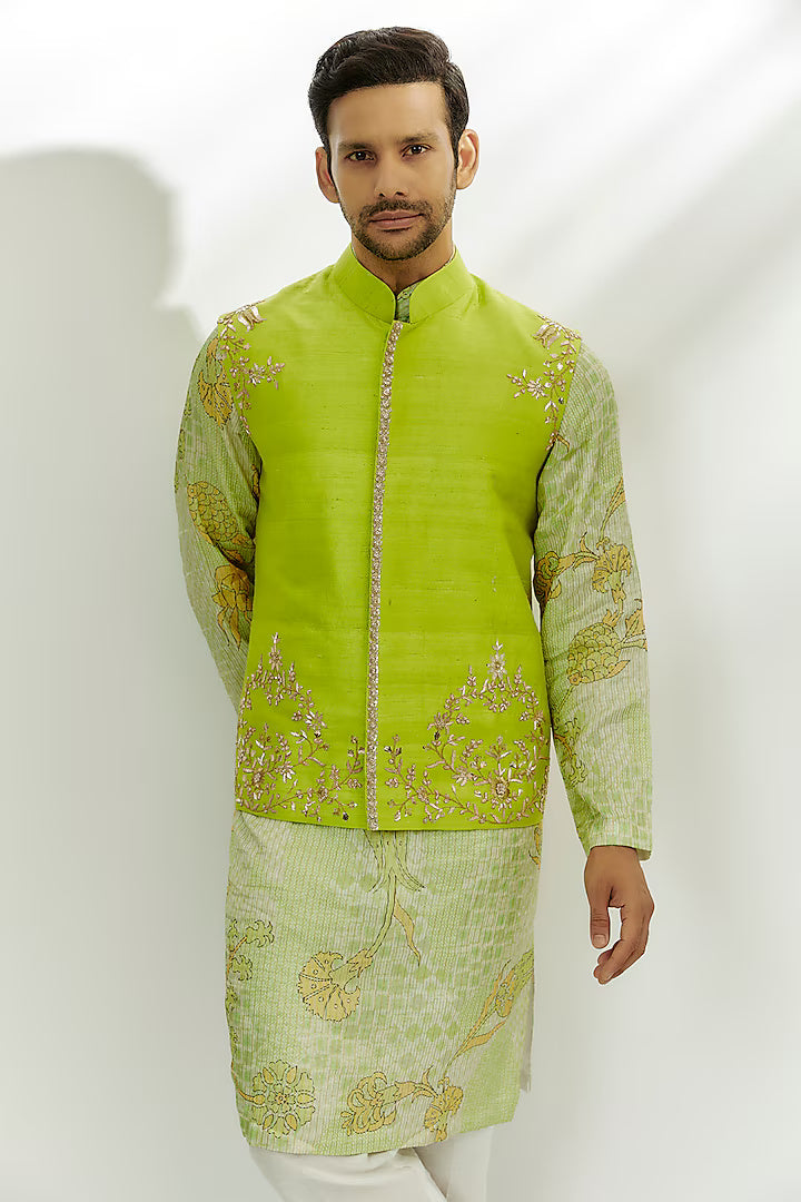 Vasik Lime Green Raw Silk Zardosi & Thread Embroidered Bundi Jacket Set