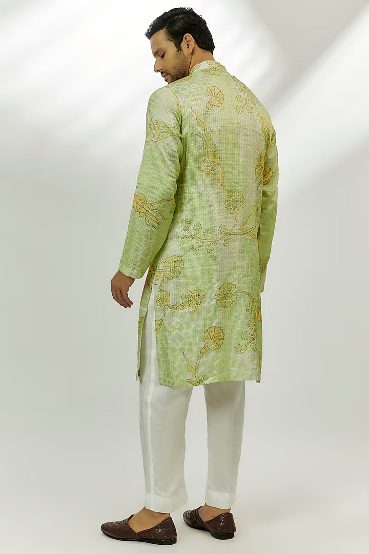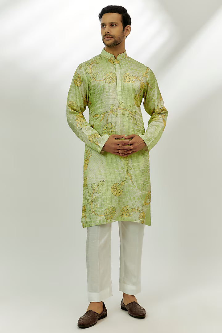 Aiyub Lime Green Chanderi Tissue Silk Zardosi & Thread Embroidered Kurta