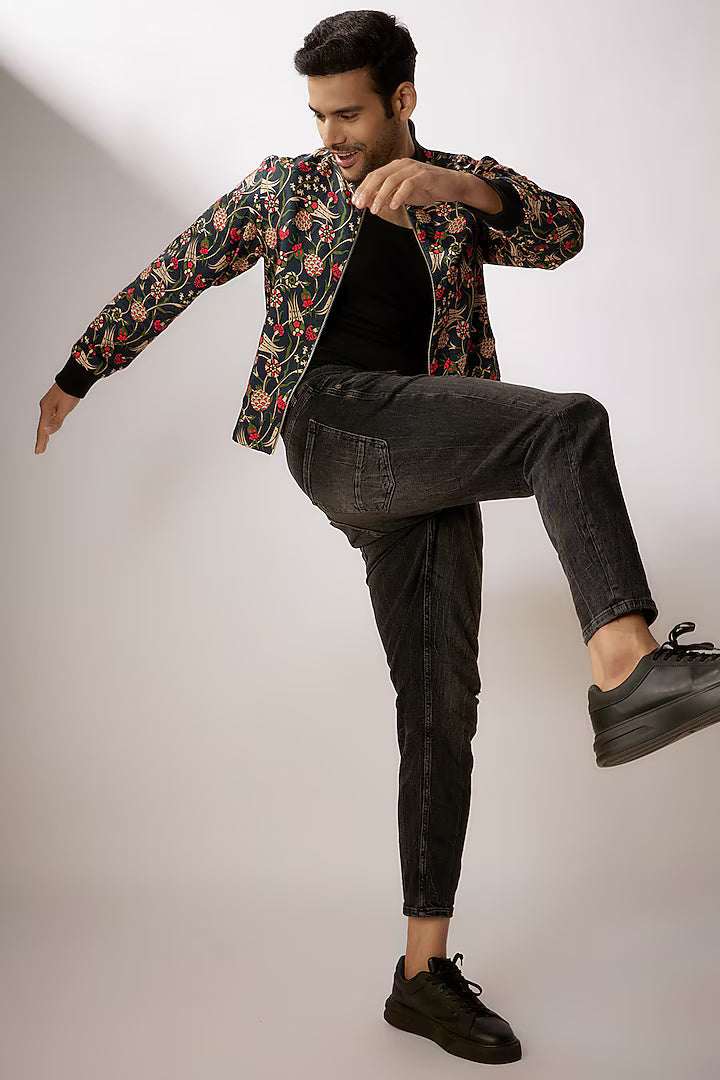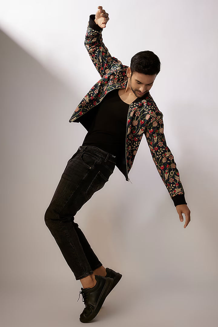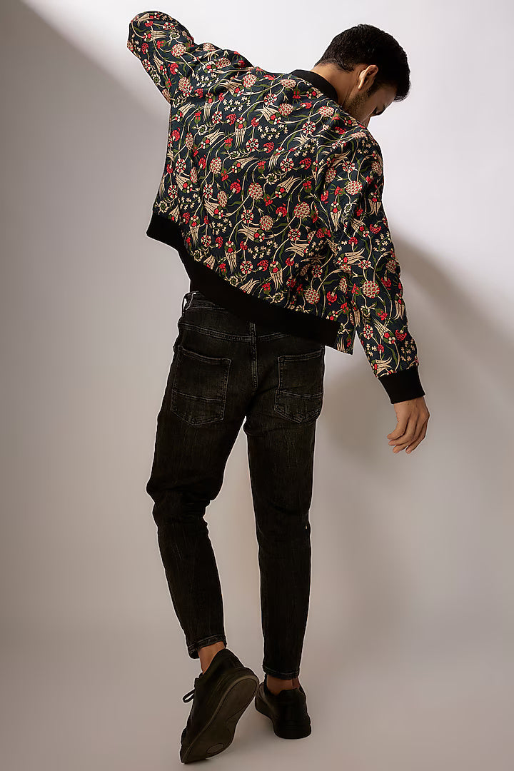Zuhair Dark Blue Dupion Silk Digital Printed Bomber Jacket