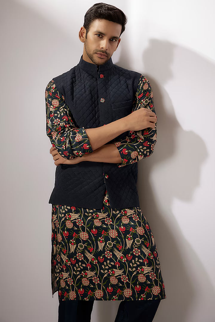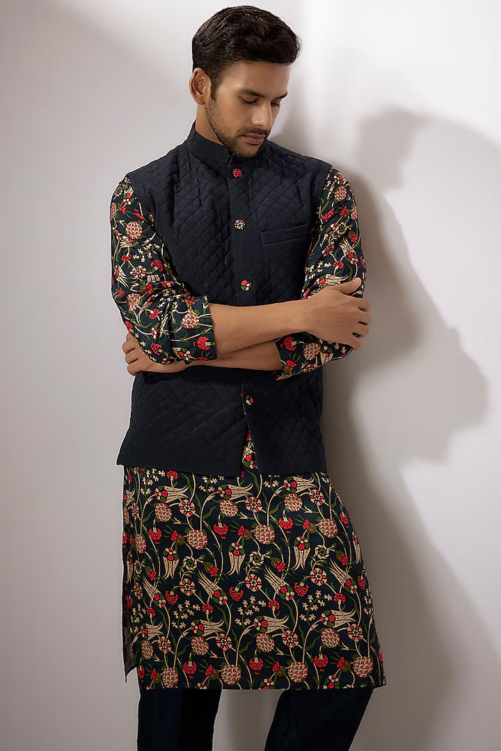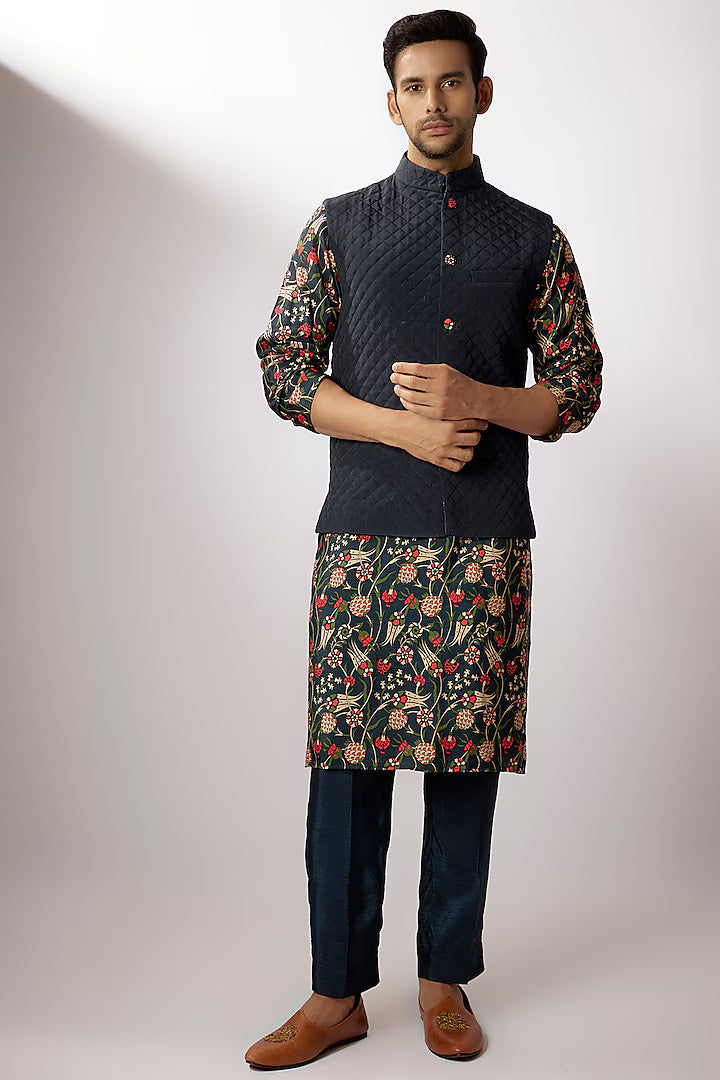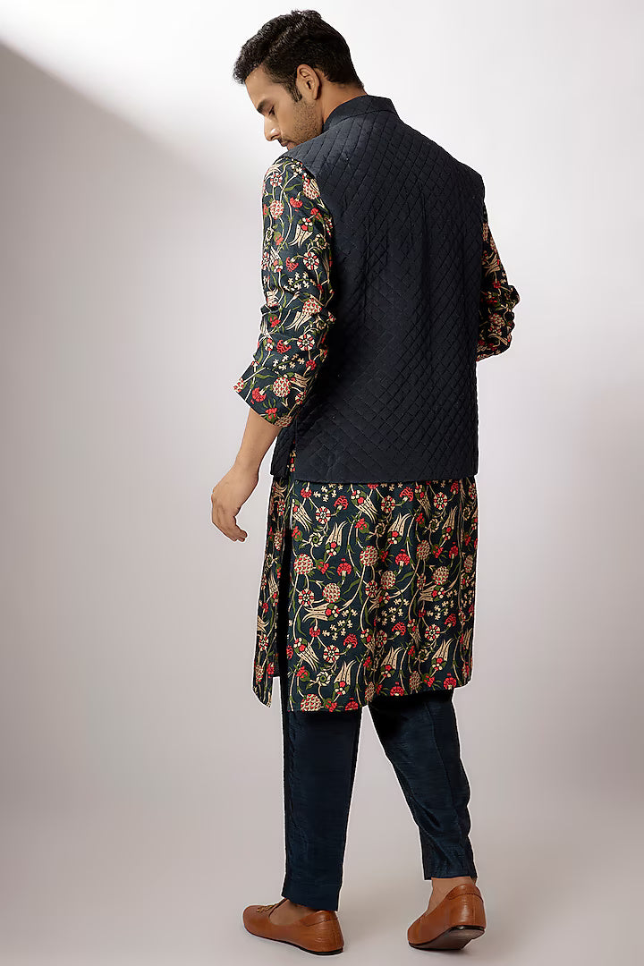 Moosa Dark Blue Dupion Silk Digital Printed Bundi Jacket Set
