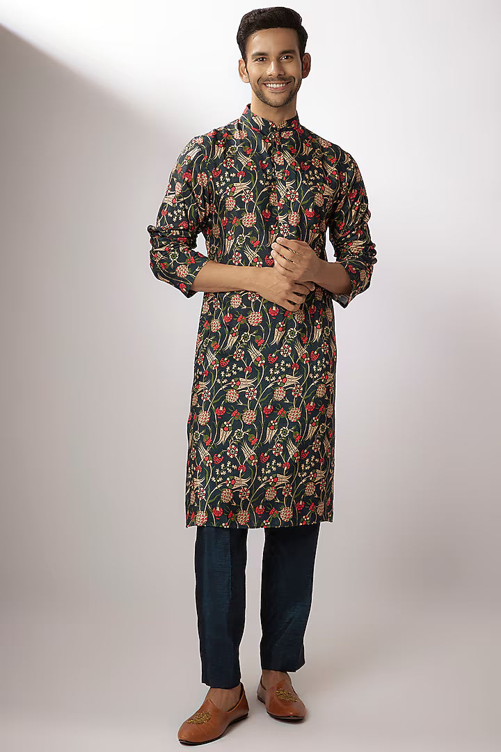 Aziz Dark Blue & Red Dupion Silk Digital Printed Kurta Set