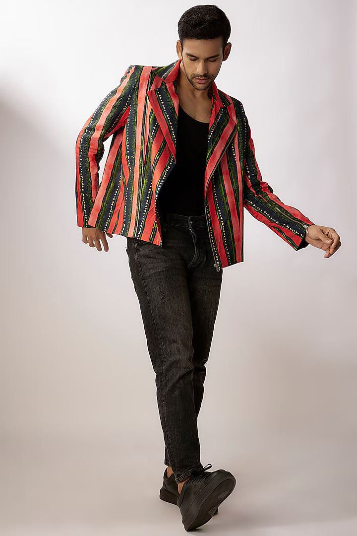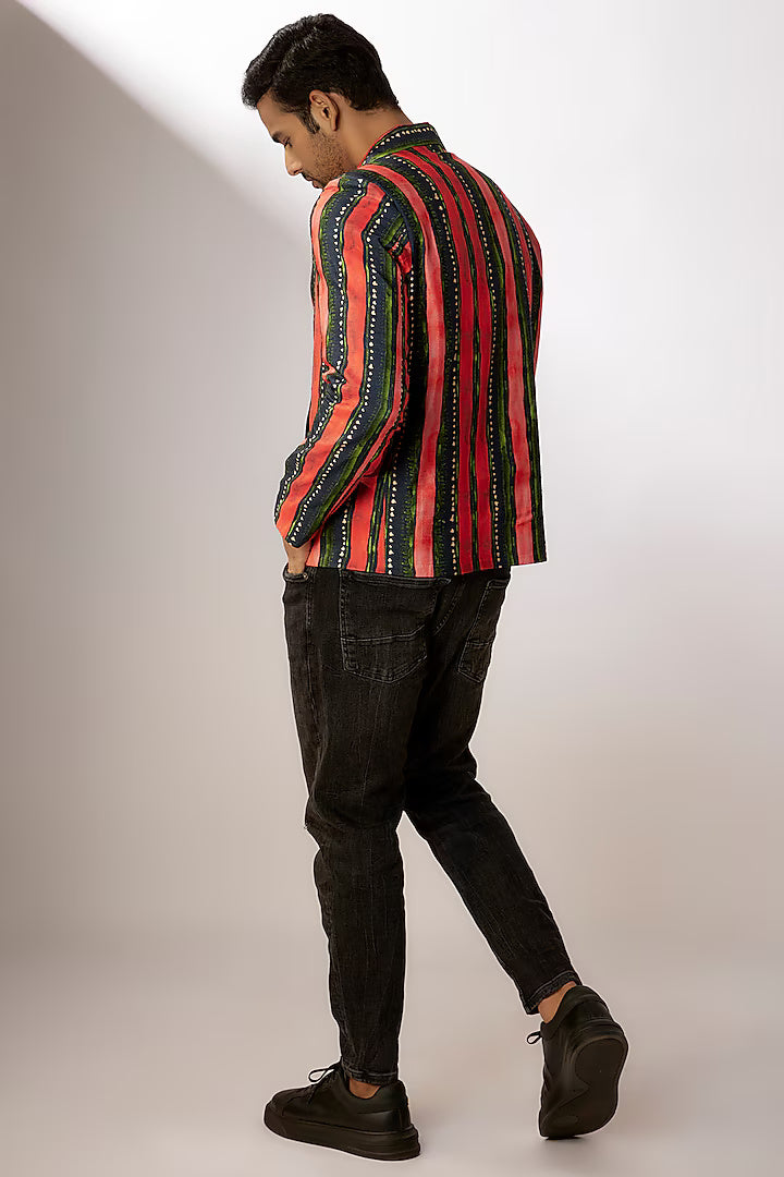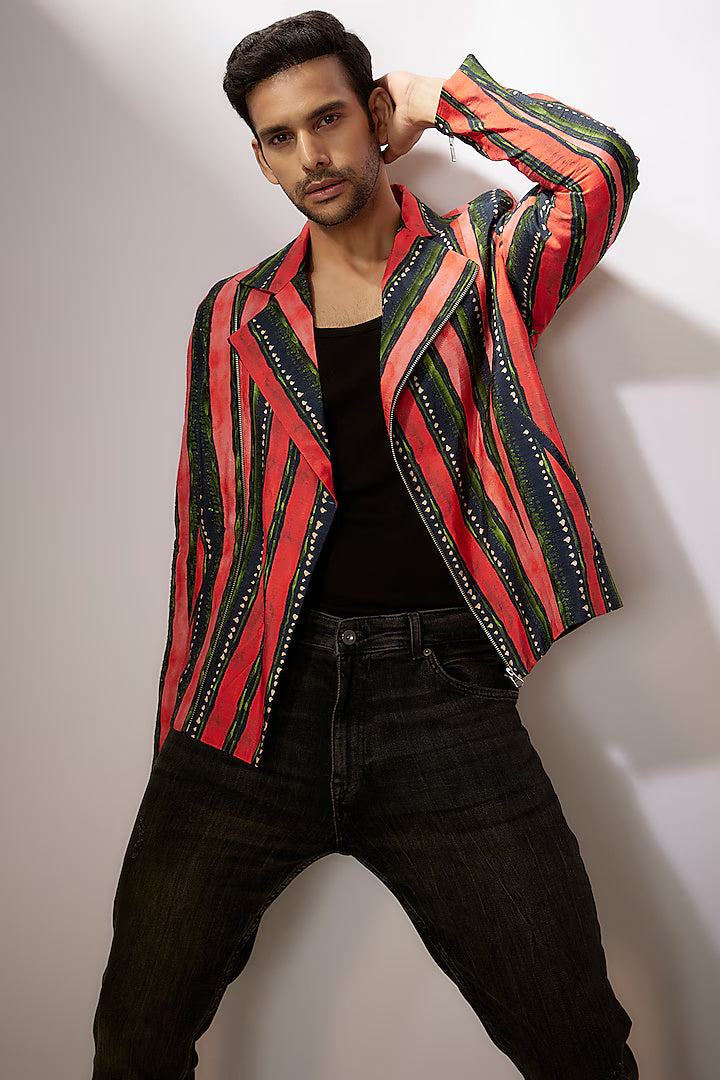 Noman Dark Blue & Red Dupion Silk Digital Stripes Printed Jacket