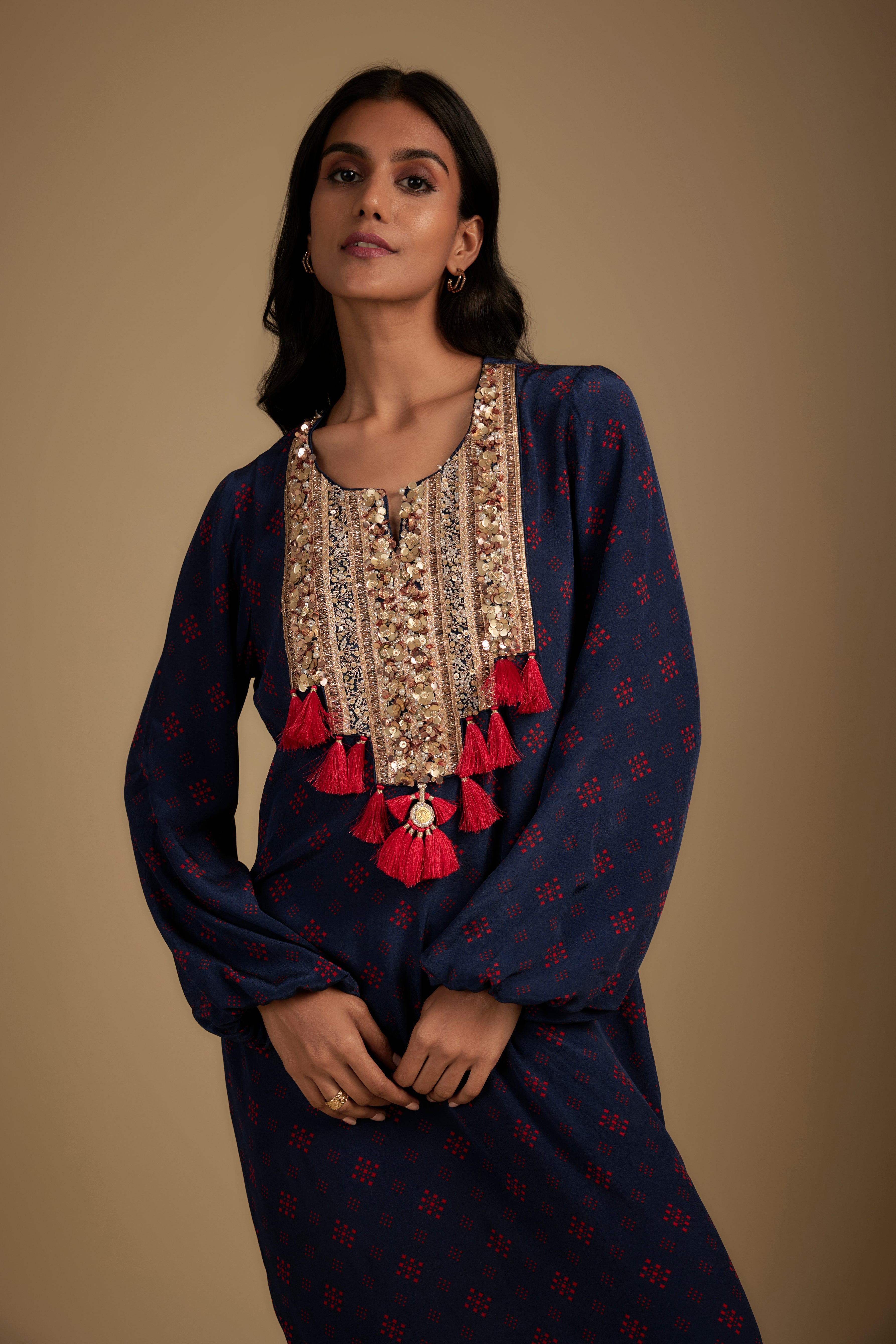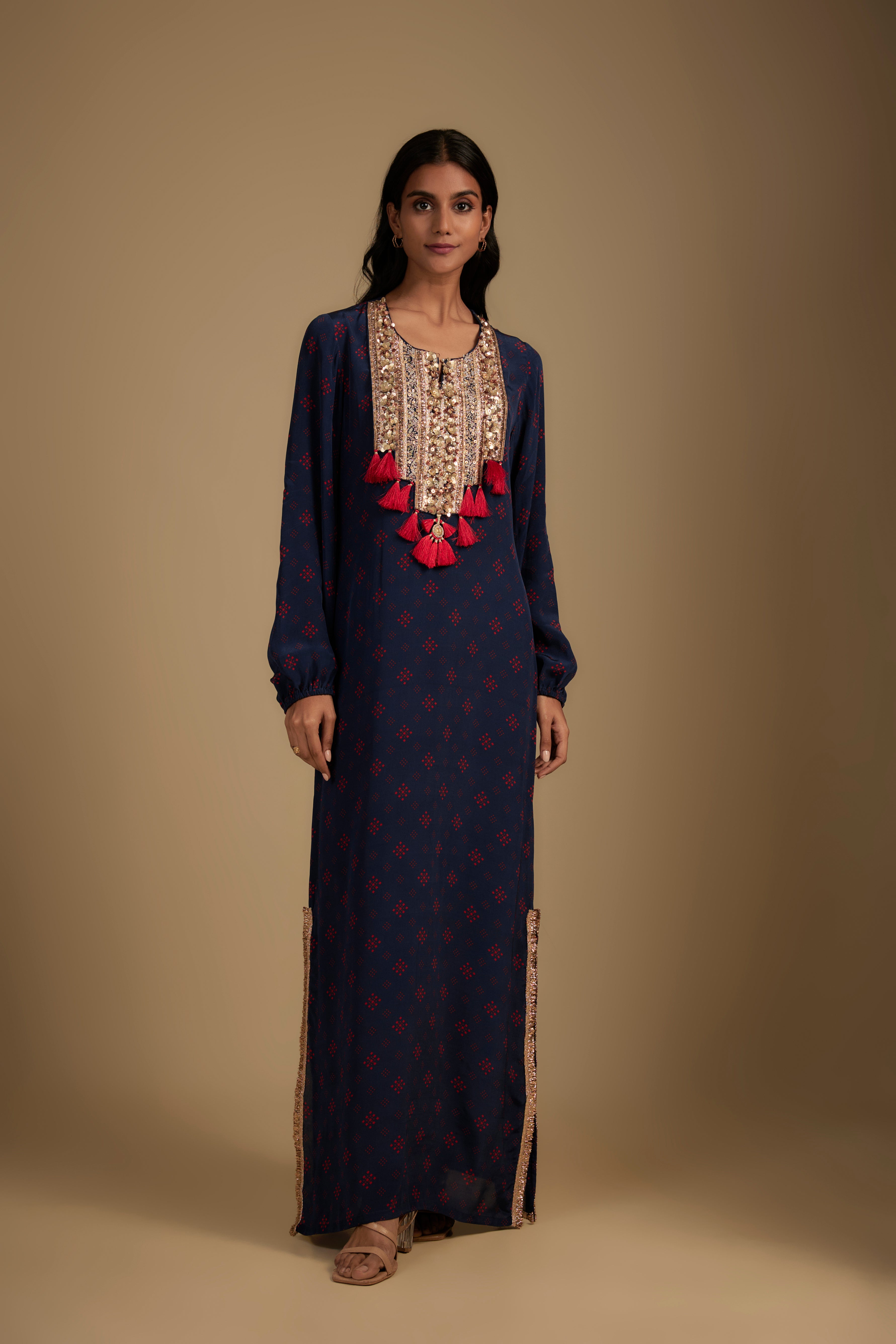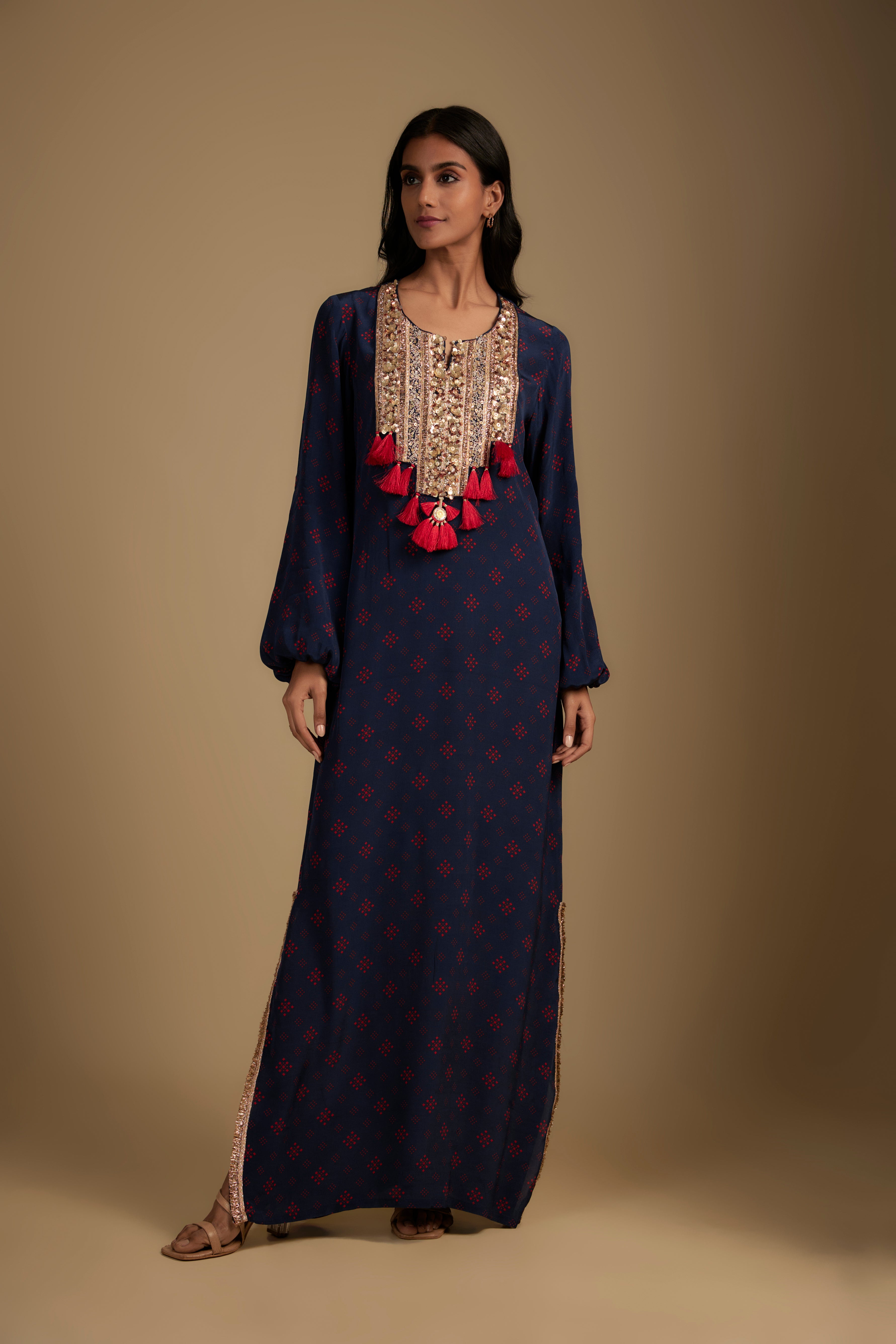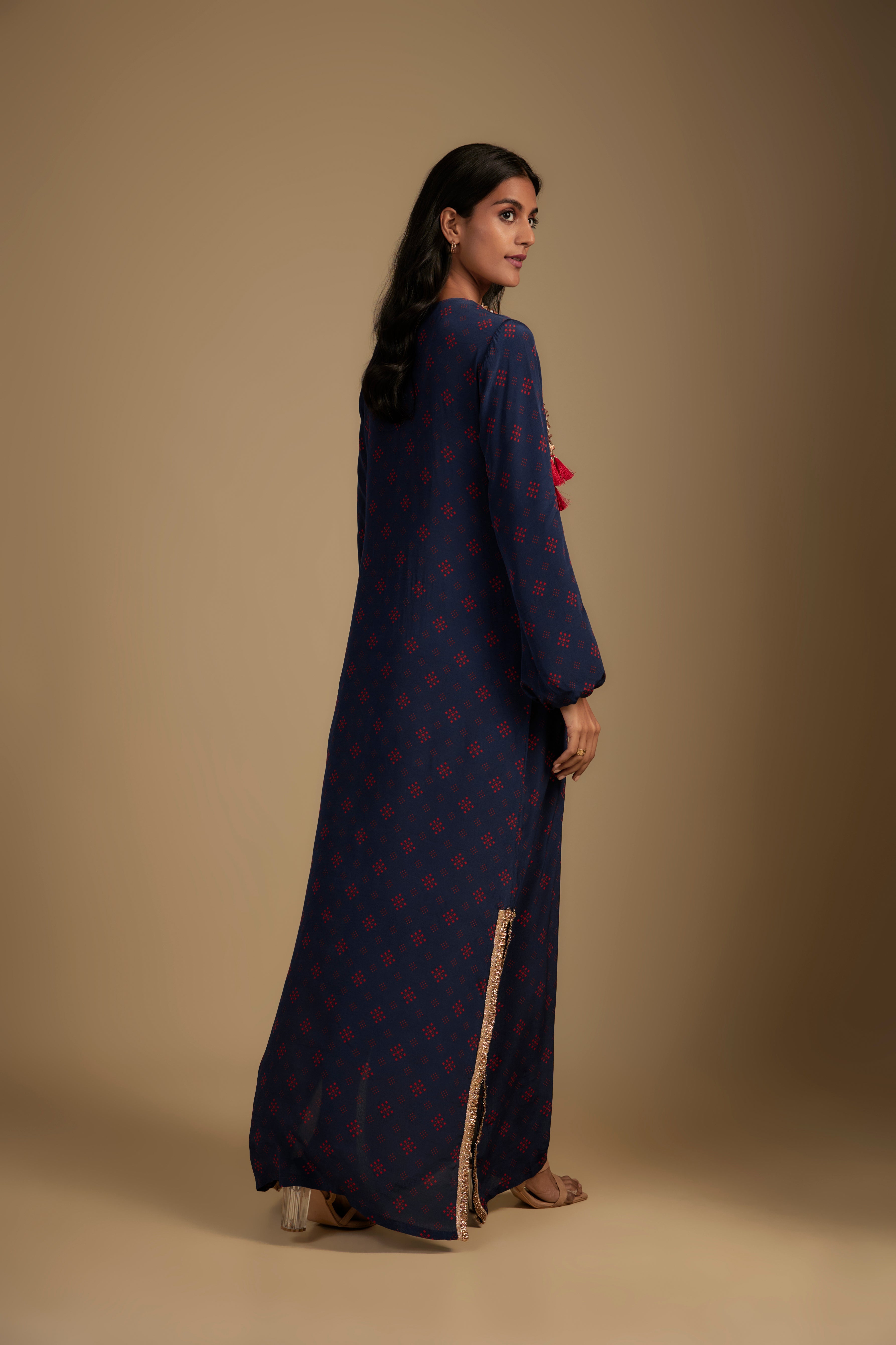 Featuring a blue printed Kaftan in crepe base with embroidered yoke & tassels with side slits.
