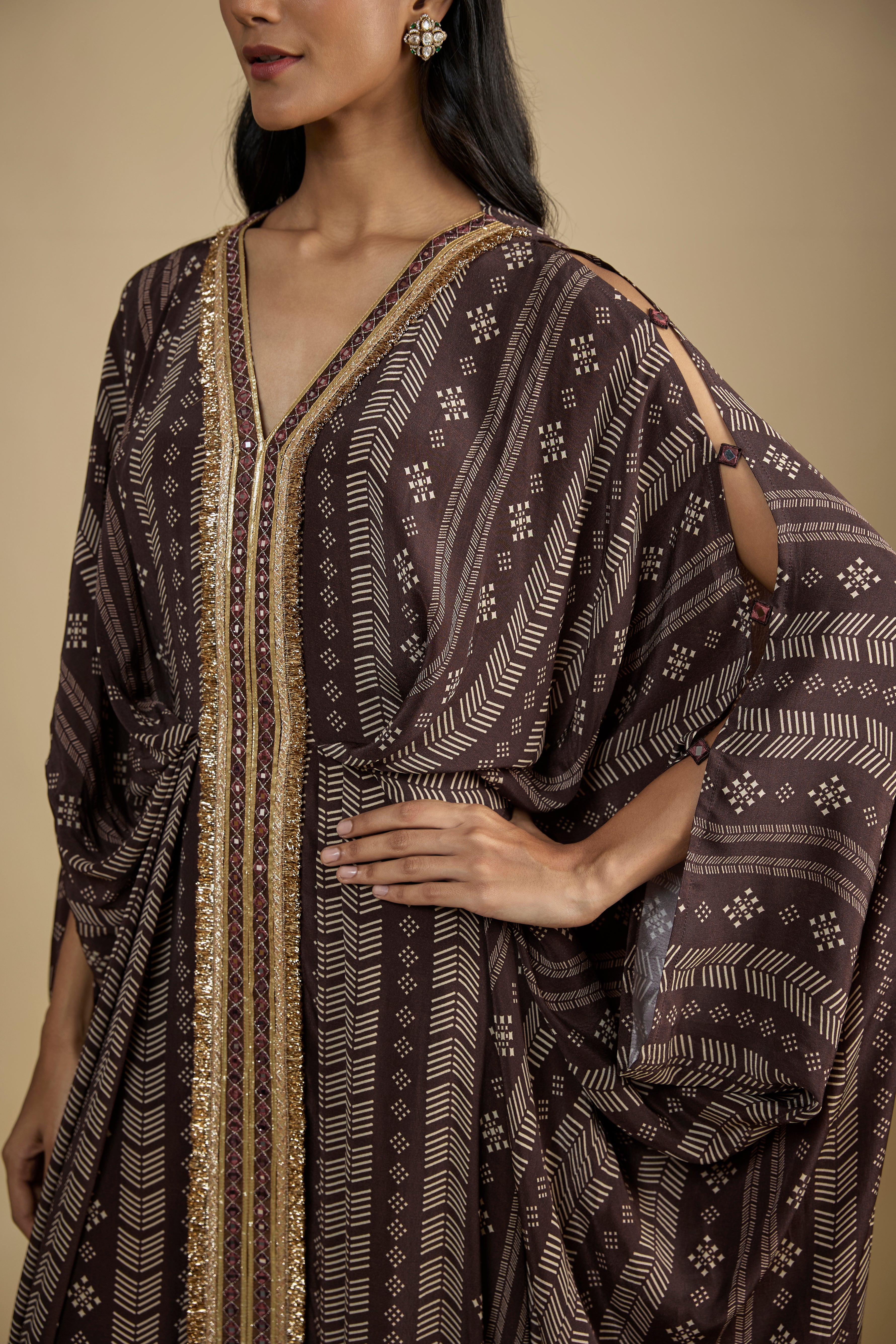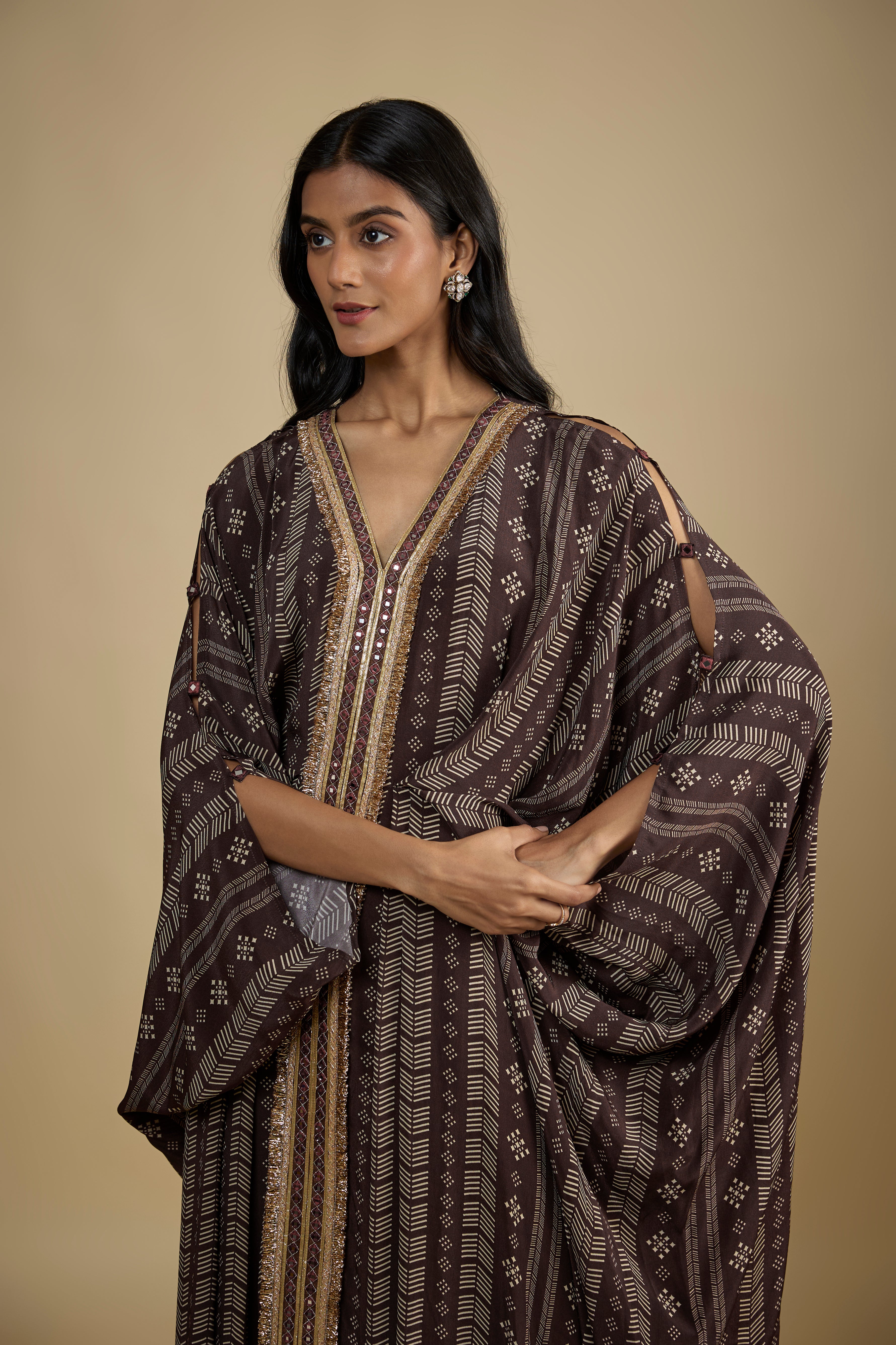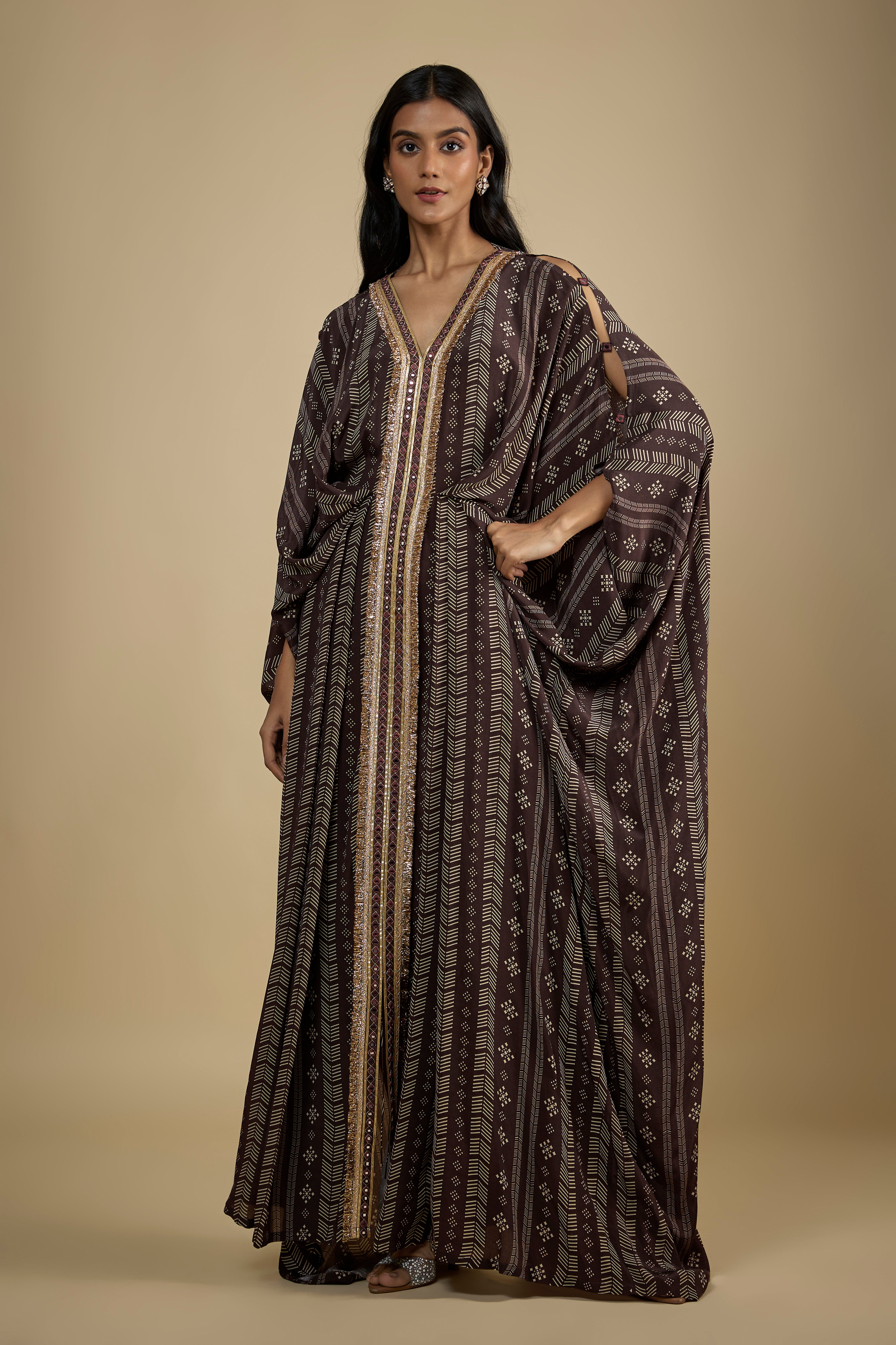 Featuring a brown crepe printed kaftan with mirror and gota work embroidery.