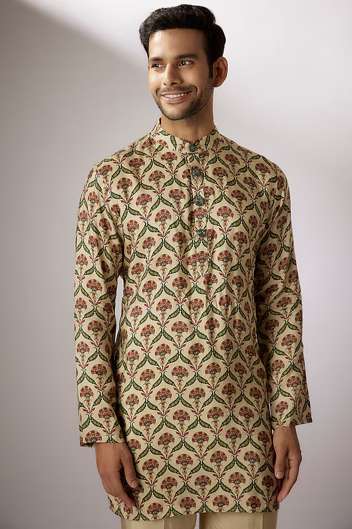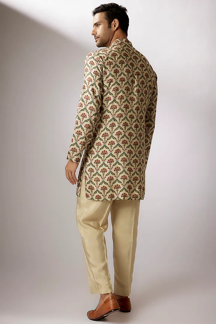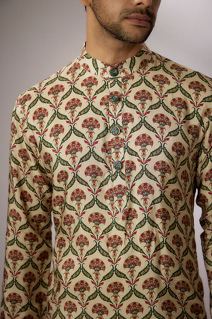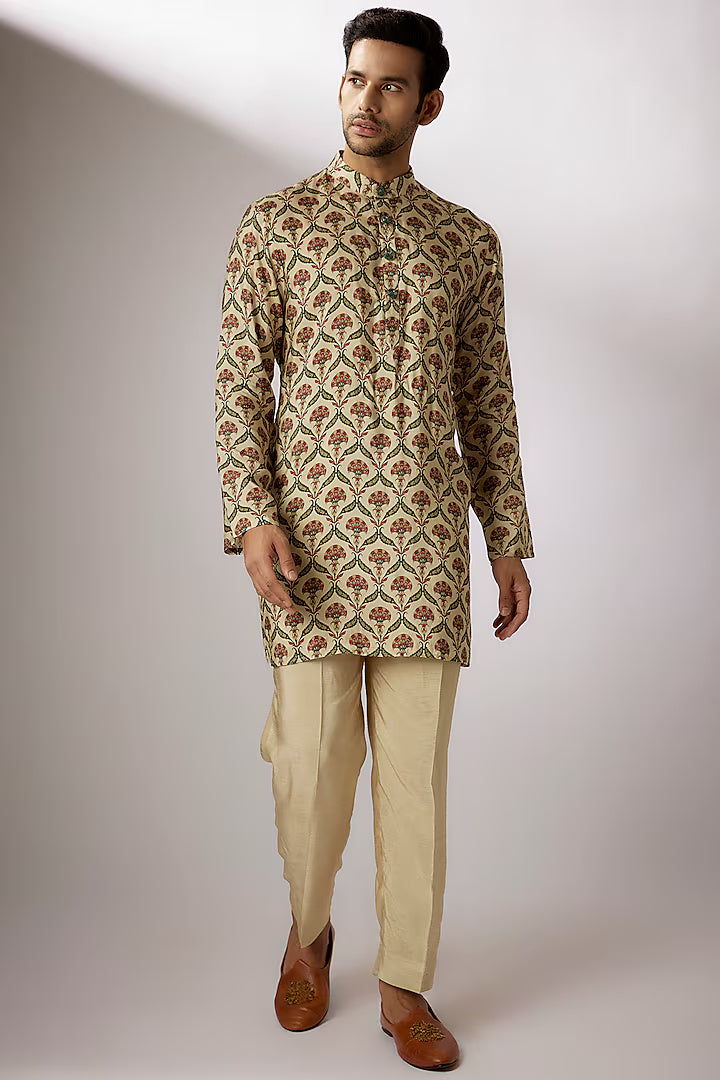 Featuring a beige kurta in dupion silk base with digital print. It is paired with pants. Perfect wear for any festive occasion or sangeet ceremony.