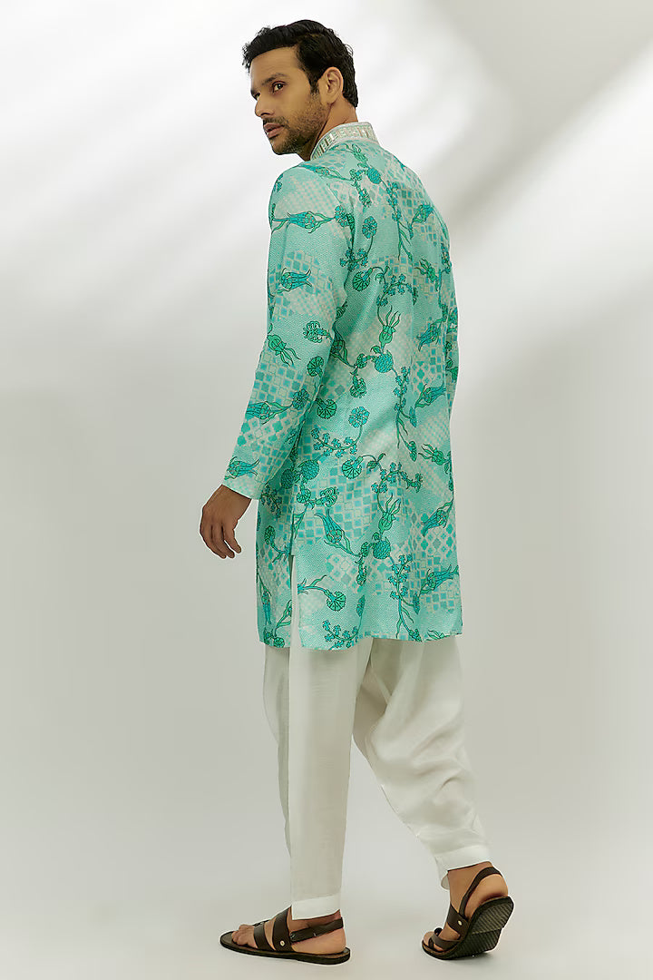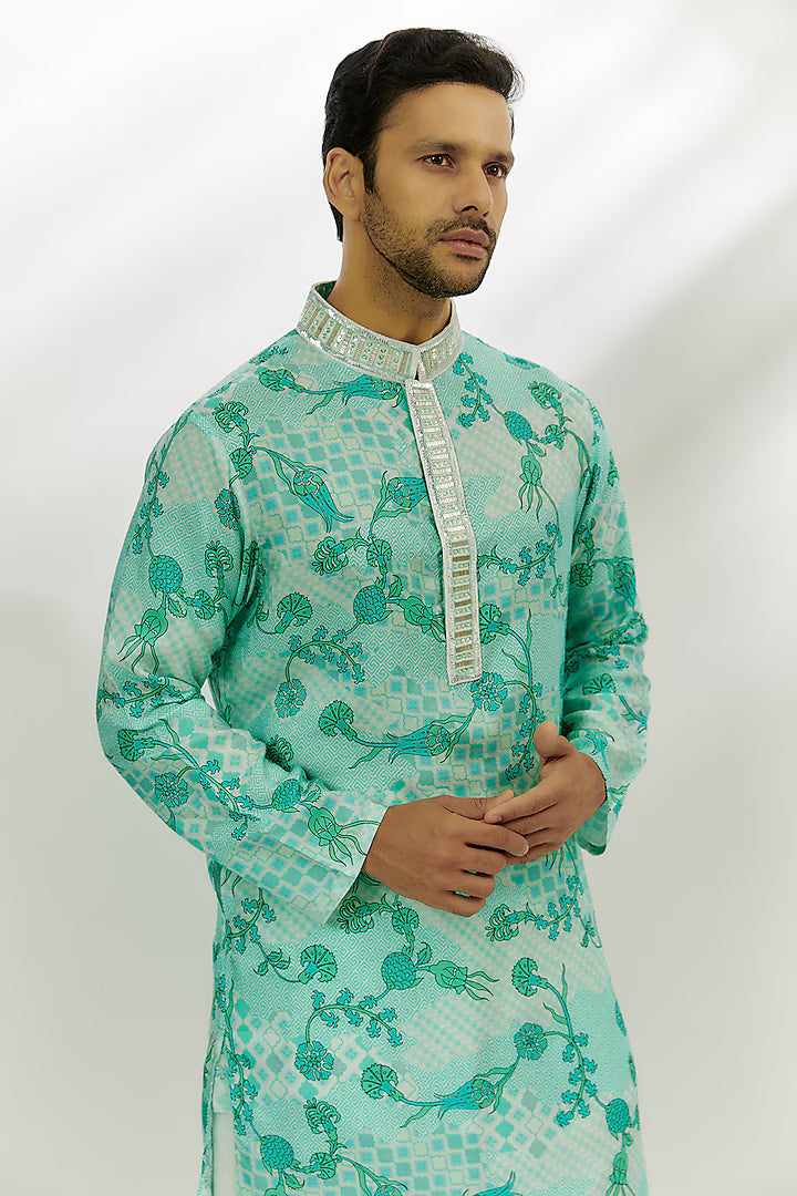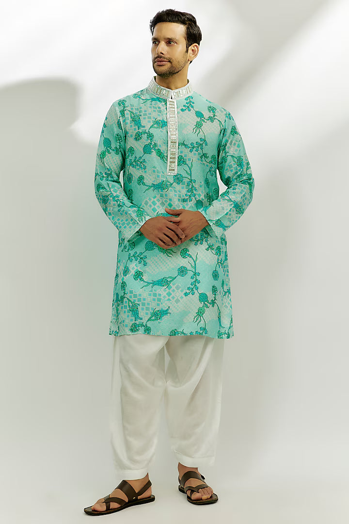 Featuring a cyan blue kurta in viscose dupion base with digital print, sequins and zardosi hand embroidery. Perfect wear for festive occasions.