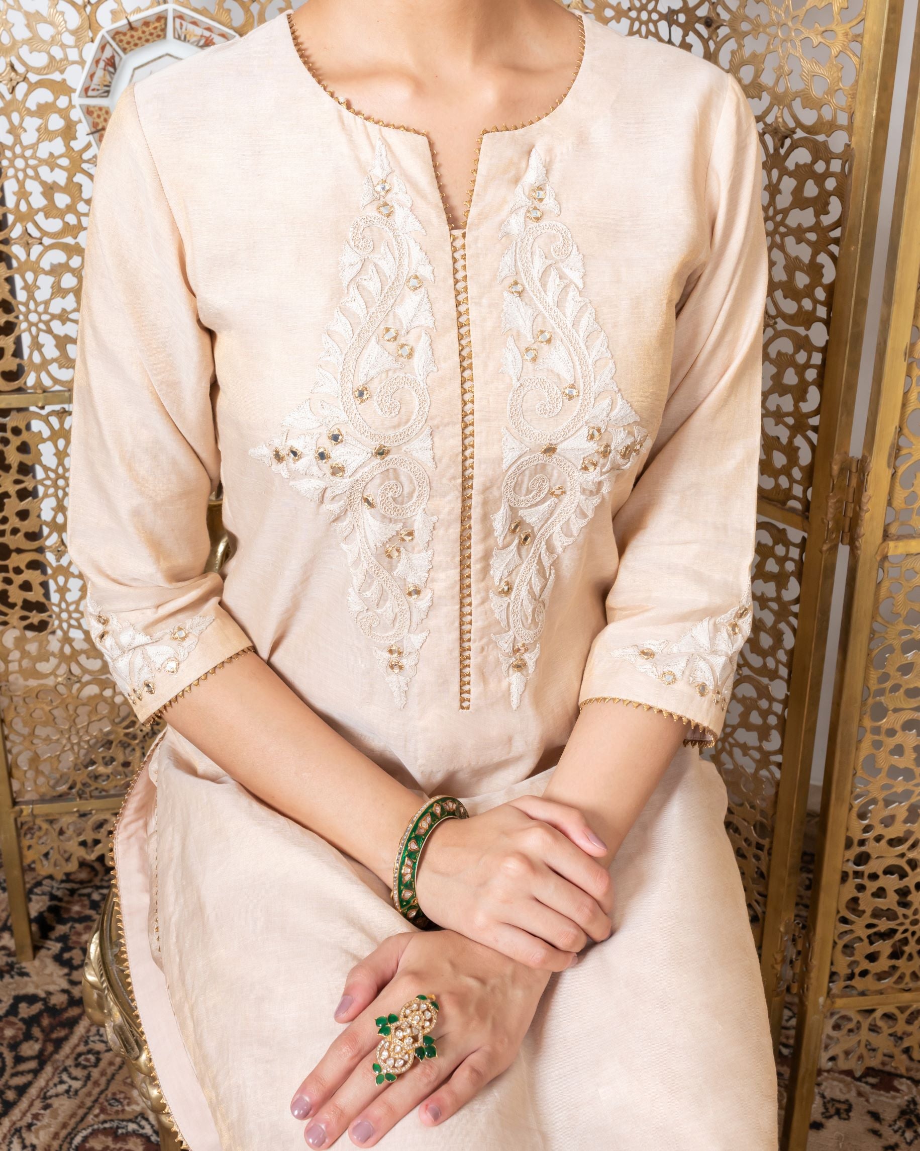 Beige embroidered kurta in chanderi fabric and straight pants in dupion silk. Comes with matching embroidered dupatta in net fabric.