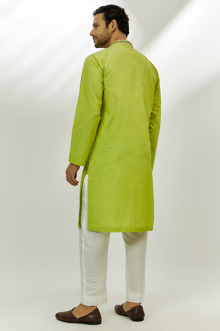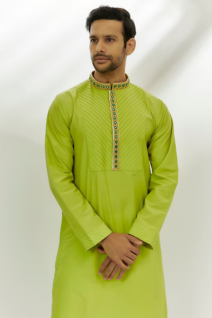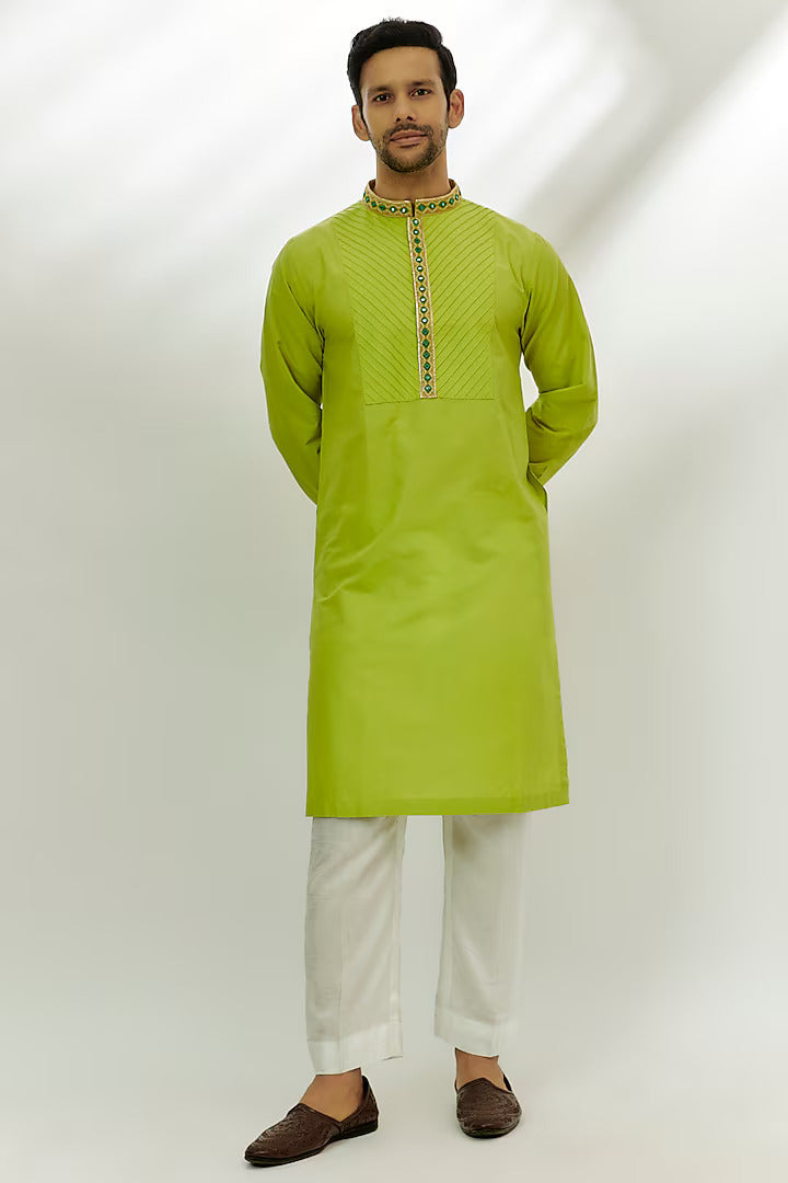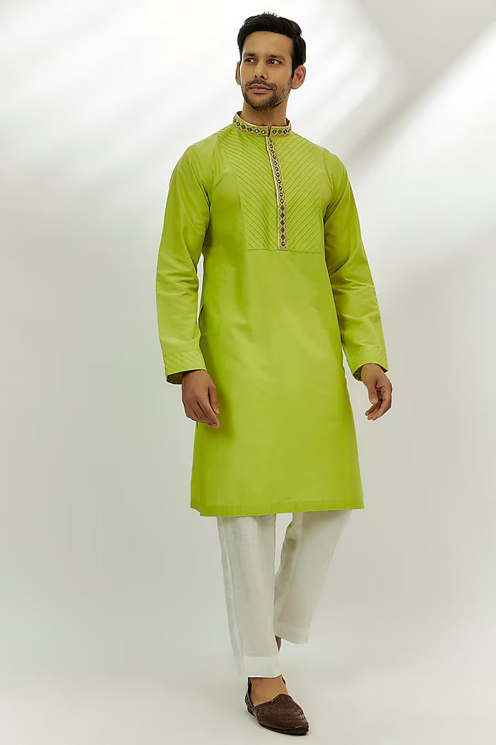Featuring a lime green kurta in cotton silk base with mirror work, resham, thread and gota patti embroidery. Perfect wear for festive occasions.