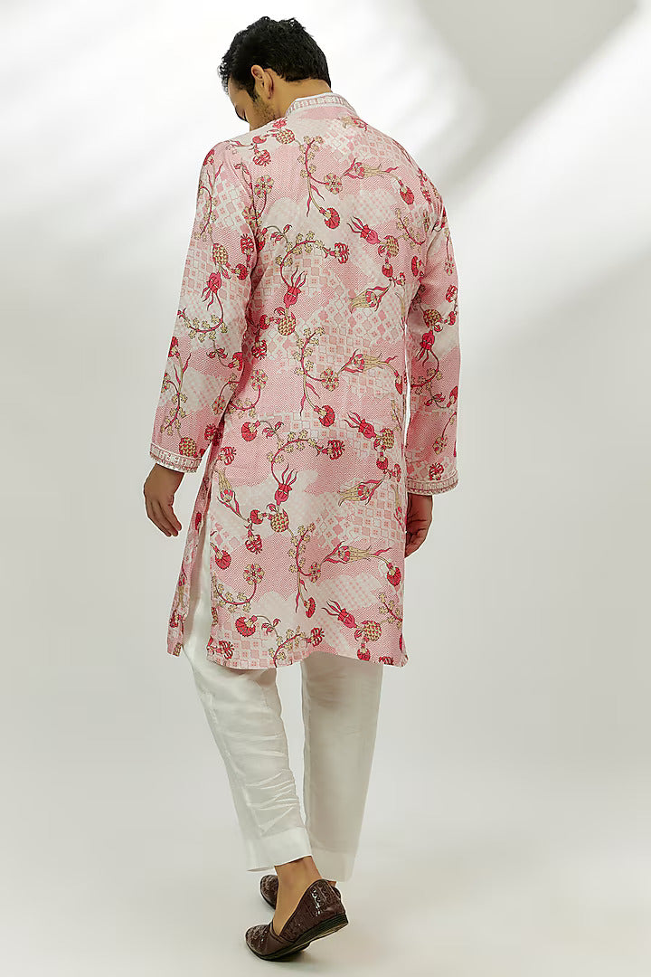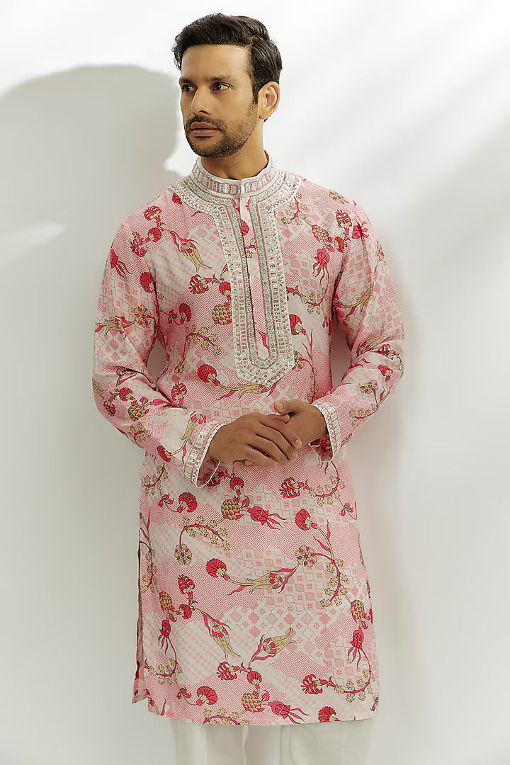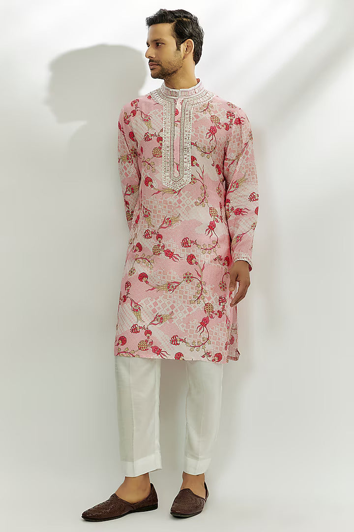Featuring a pastel pink kurta in viscose dupion silk base with sequins and zardosi hand embroidery. Perfect wear for festive occasions.