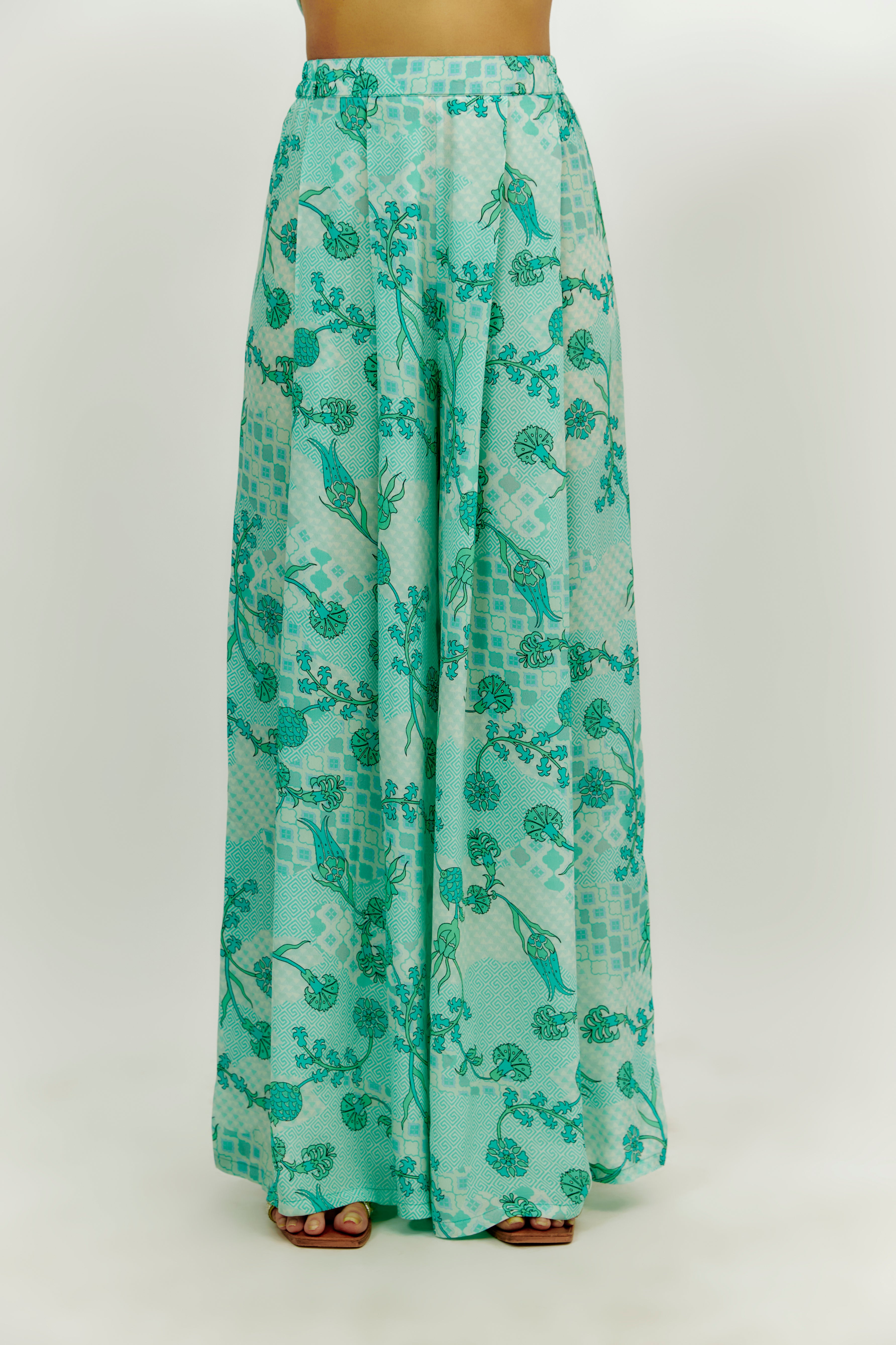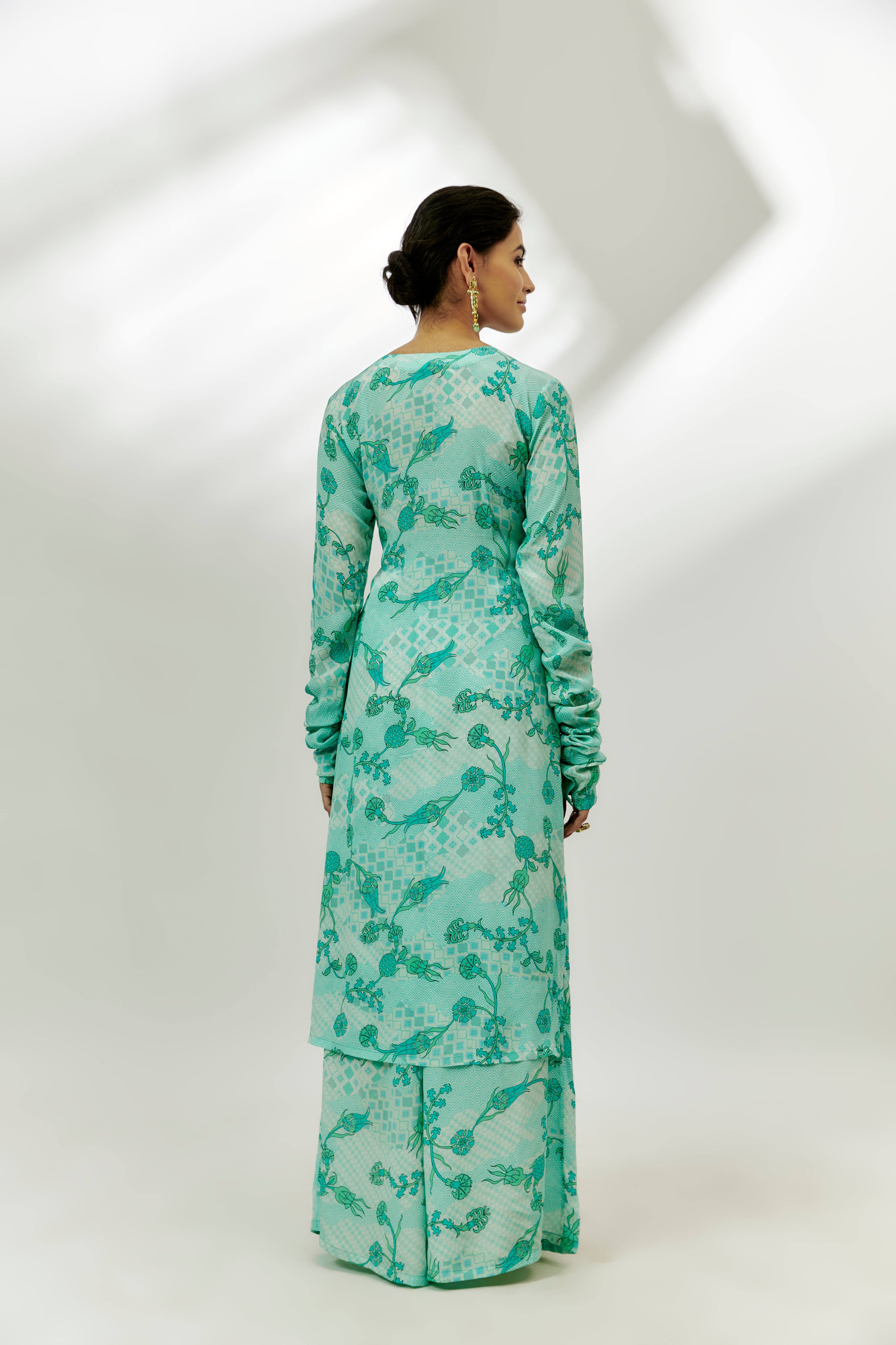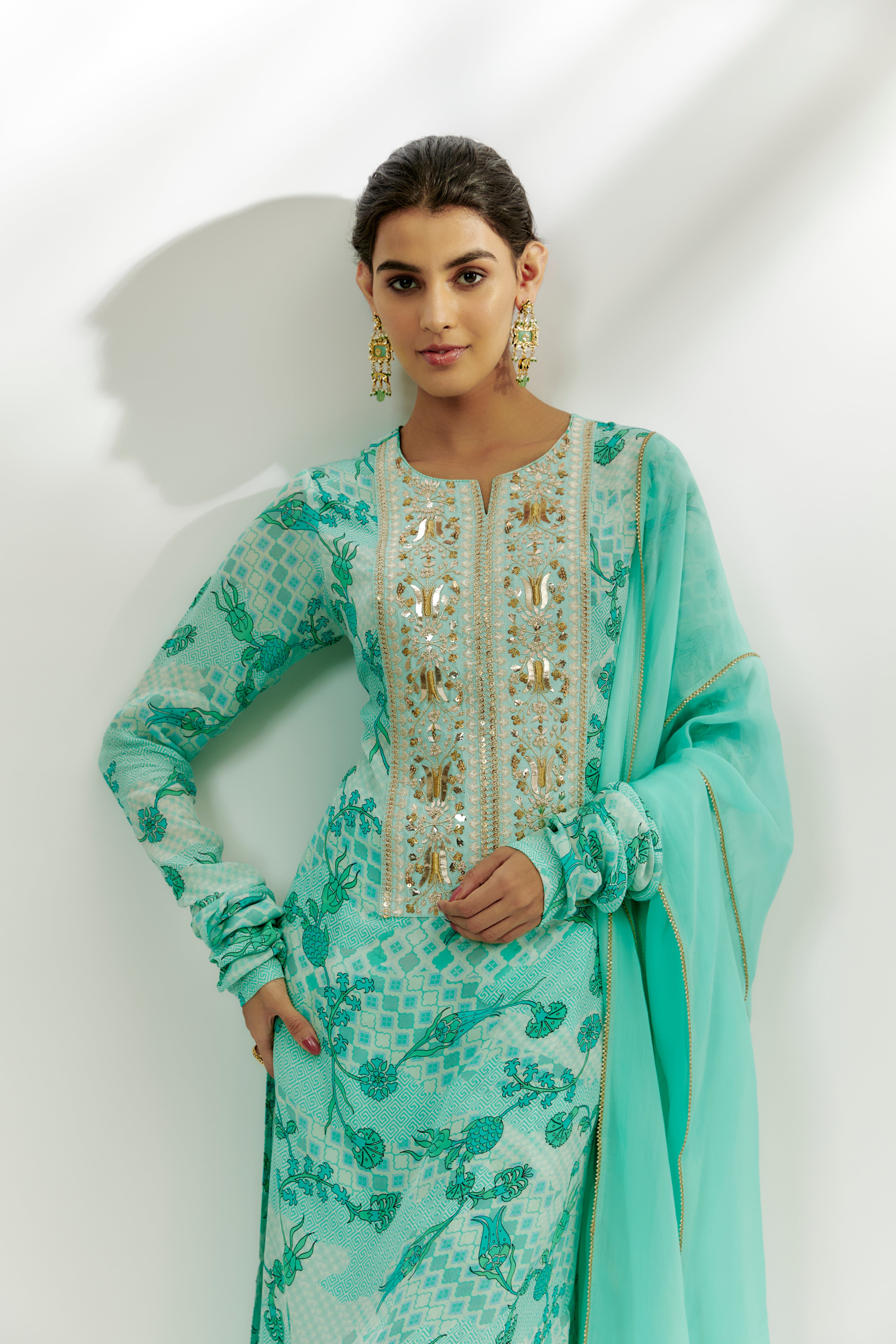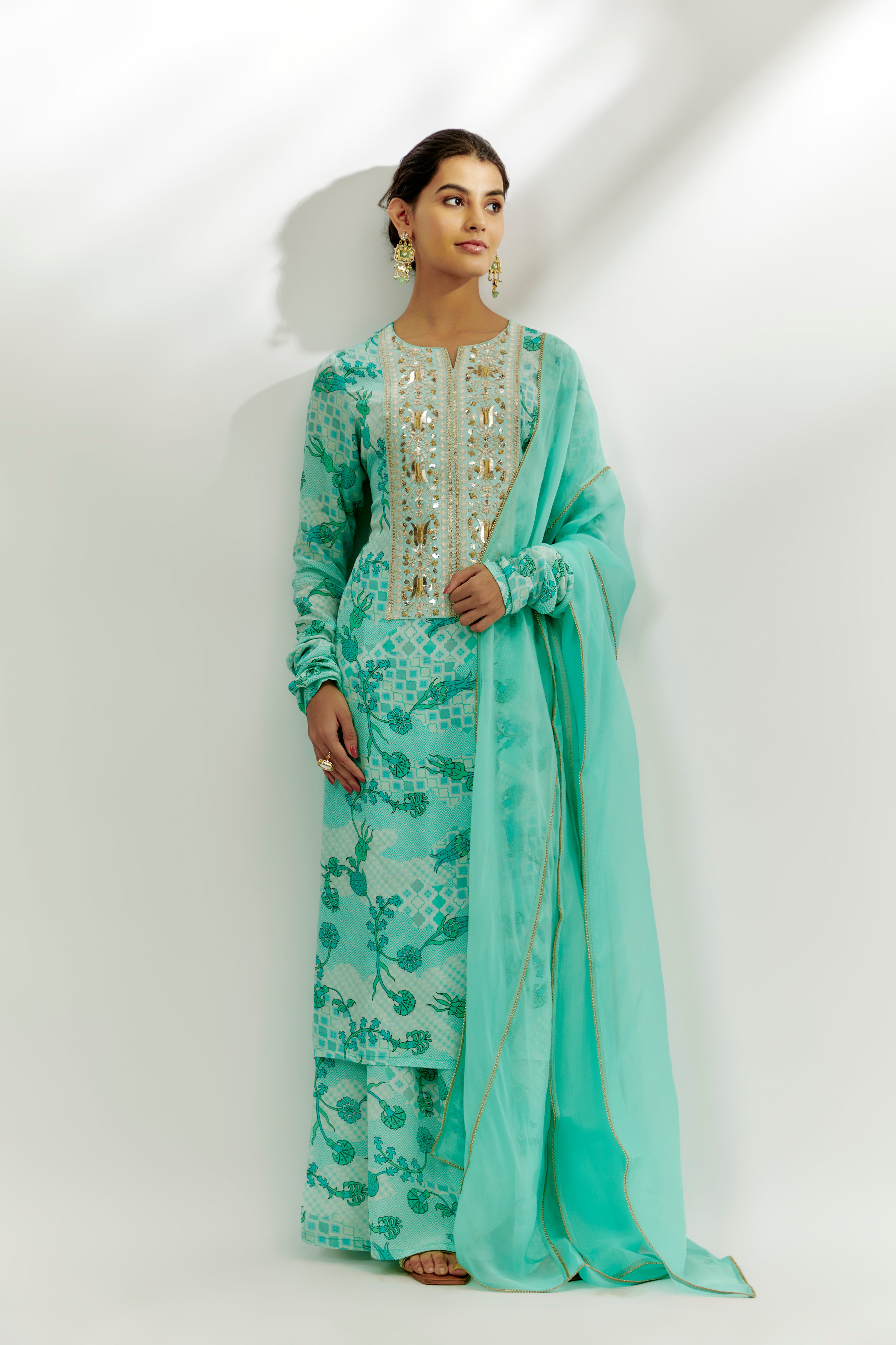 Featuring a cyan blue kurta in crepe base with digital print, zardosi and marodi embroidery. It is paired with palazzo pants and an organza dupatta. Accentuate it with statement jewellery and heels for a festive occasion or pooja ceremony.