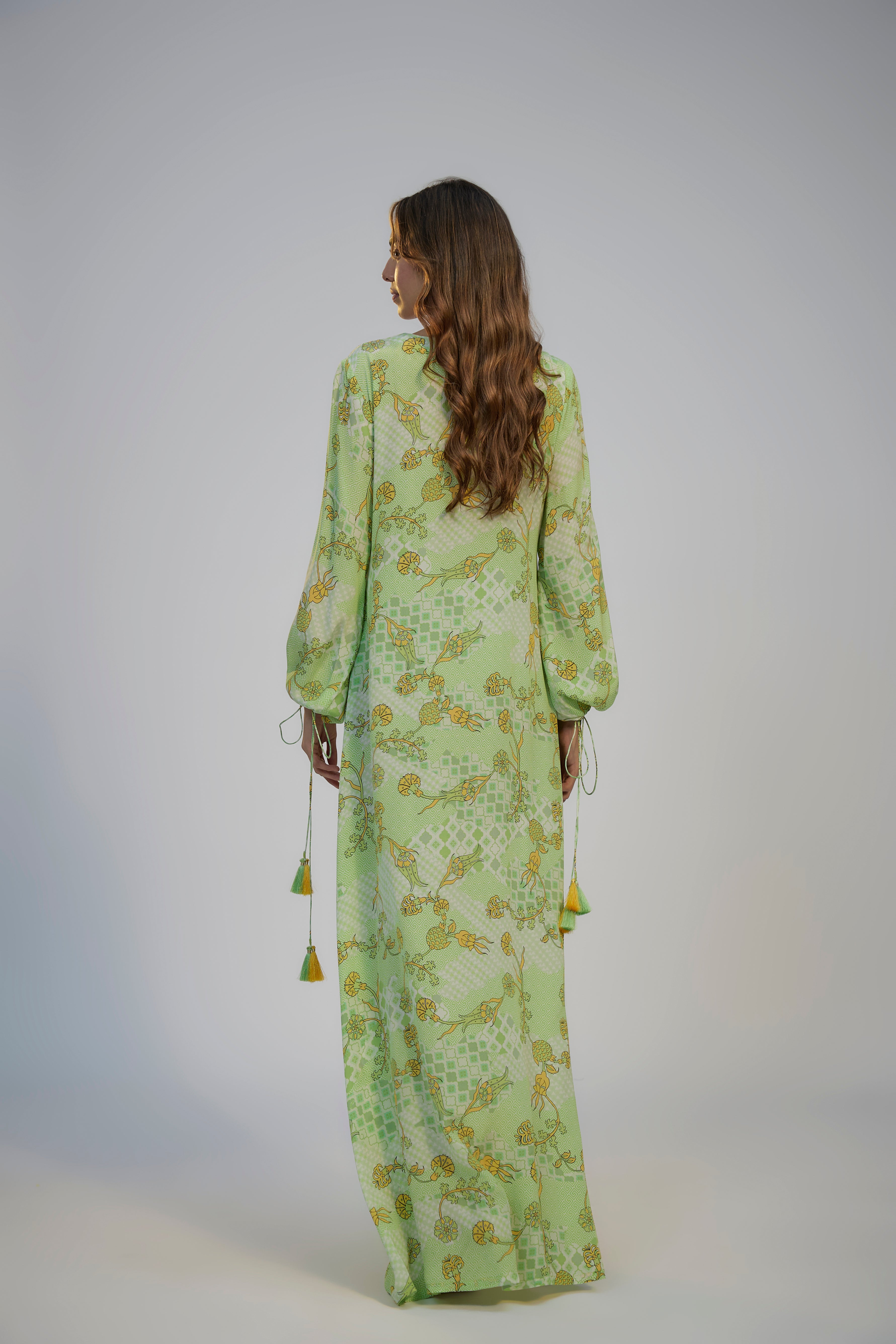 Featuring a lime green printed crepe kaftan dress with mirror and pearl work embroidered yoke and tassel details.