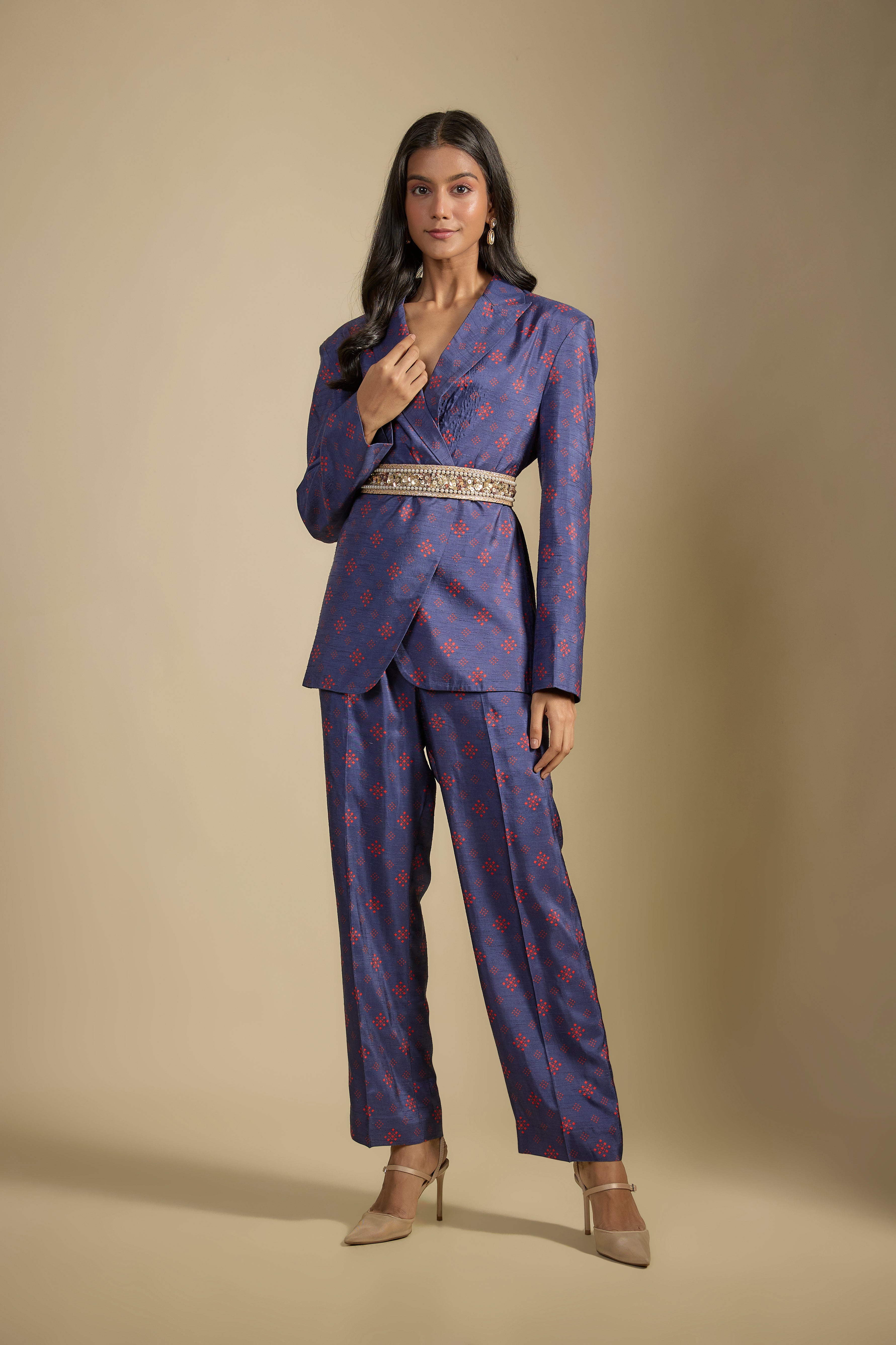 Featuring a navy blue dupion silk printed blazer set with sequins and pearl embroidered belt with tassel tie-up.