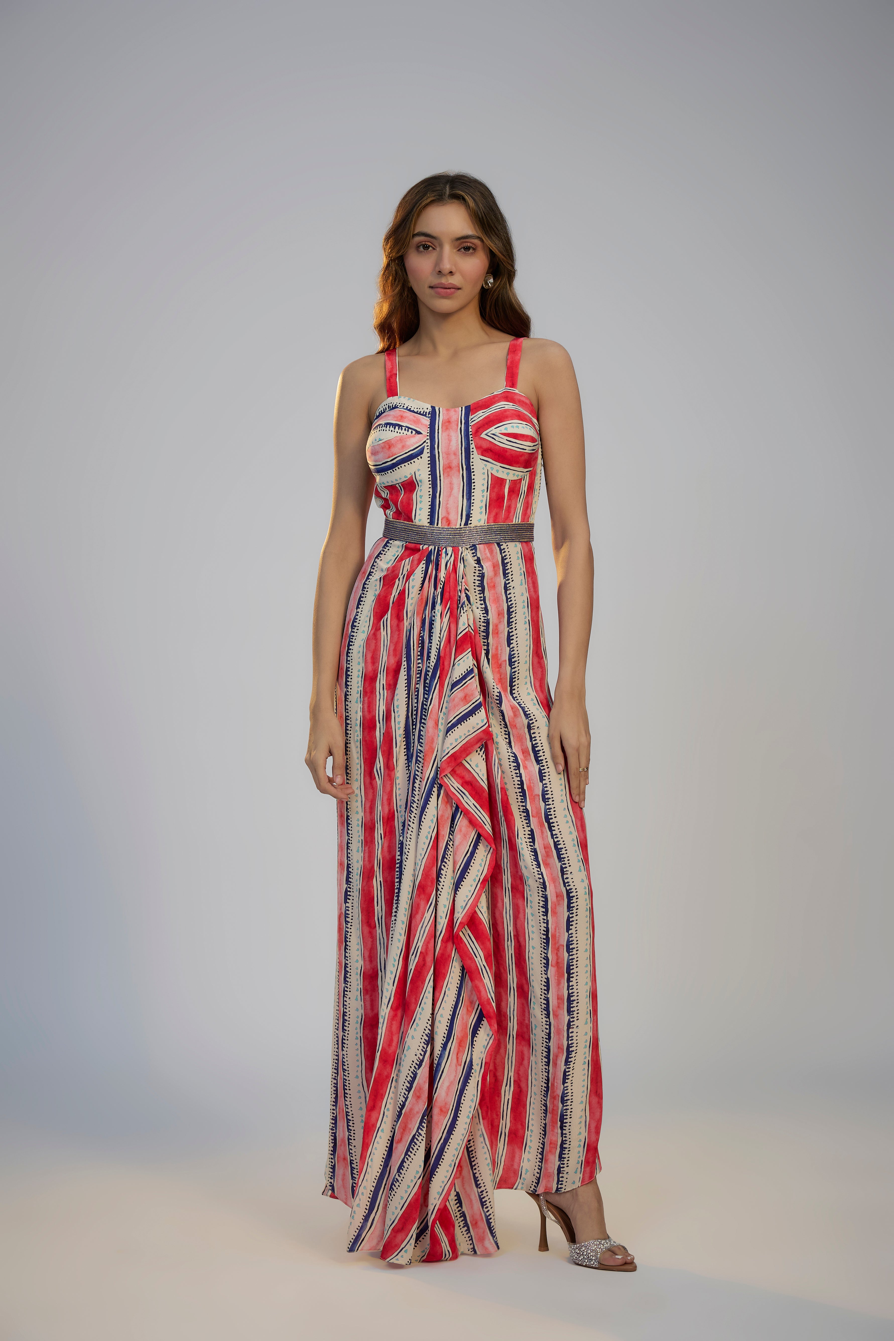 Ivory & Red Crepe Stripe Printed Kaftan