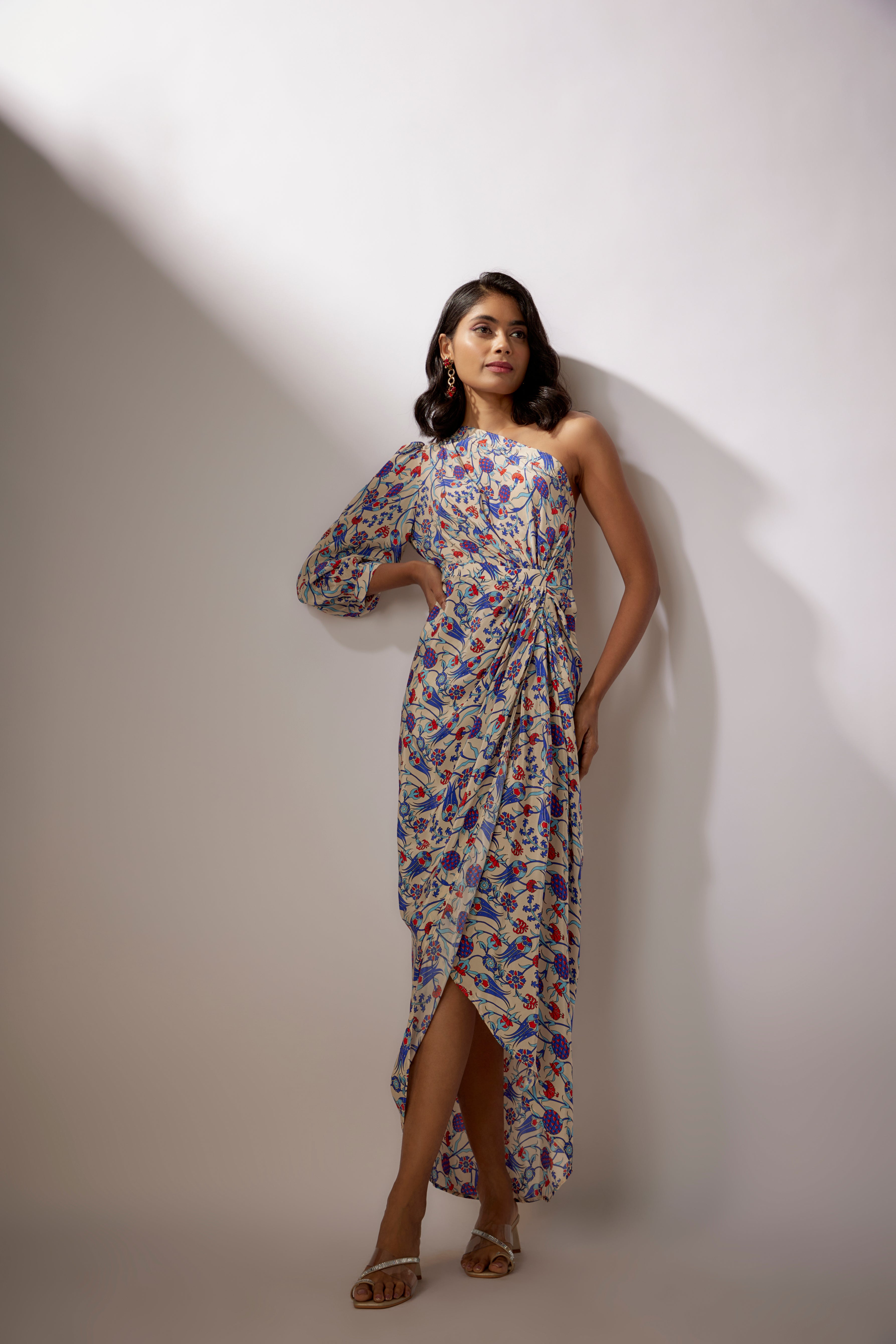 Beige Printed Draped Pants Saree Set