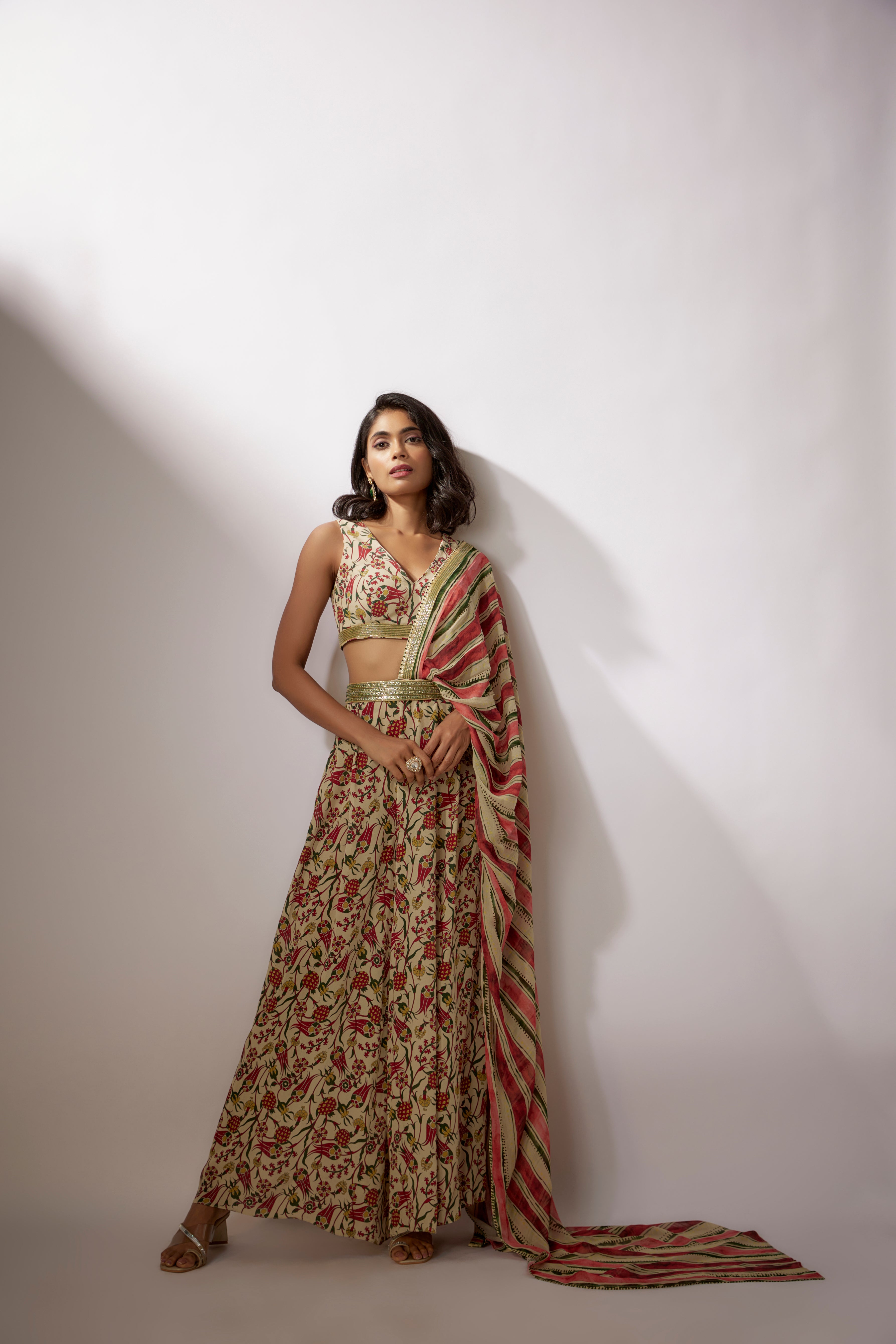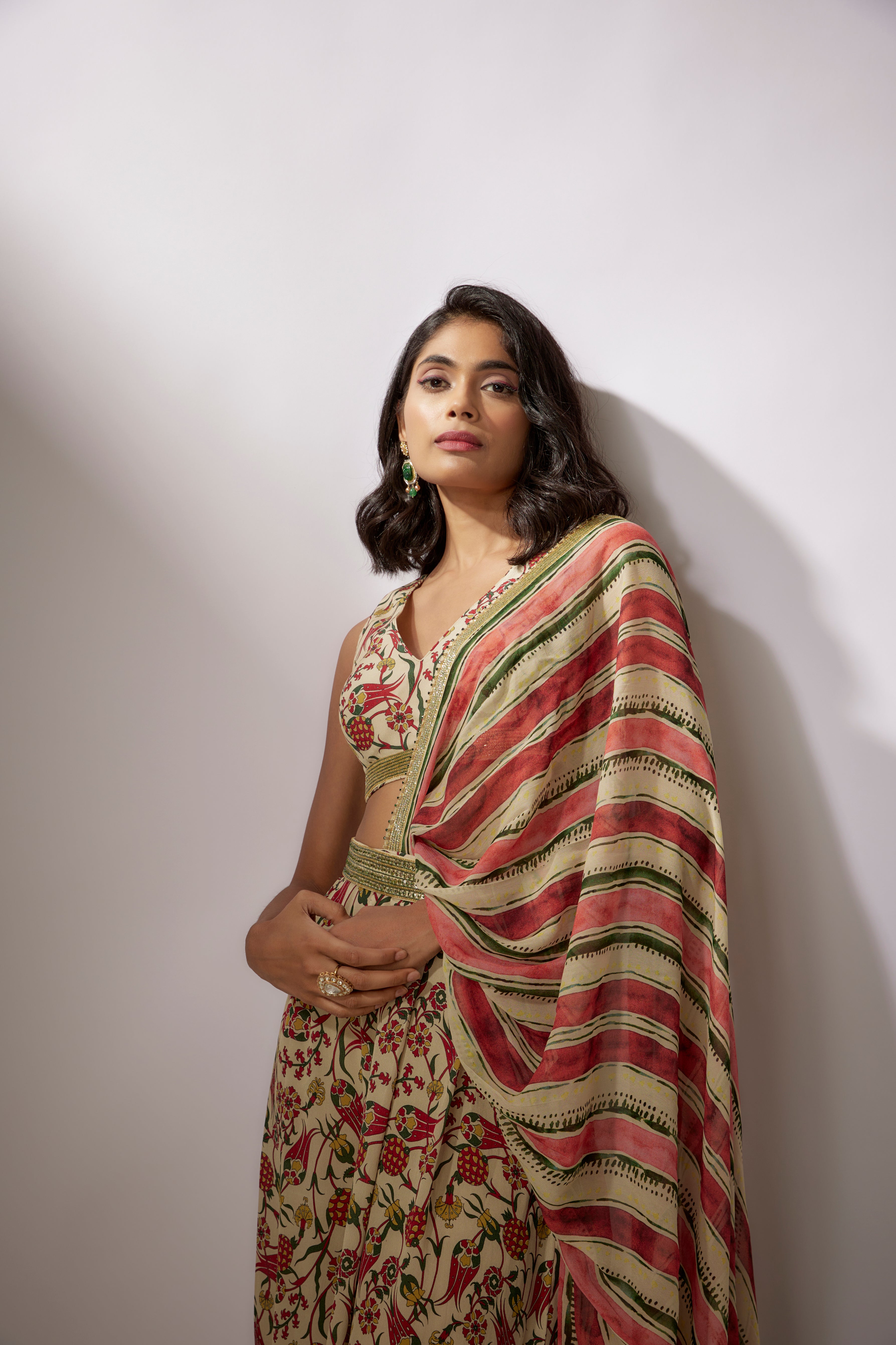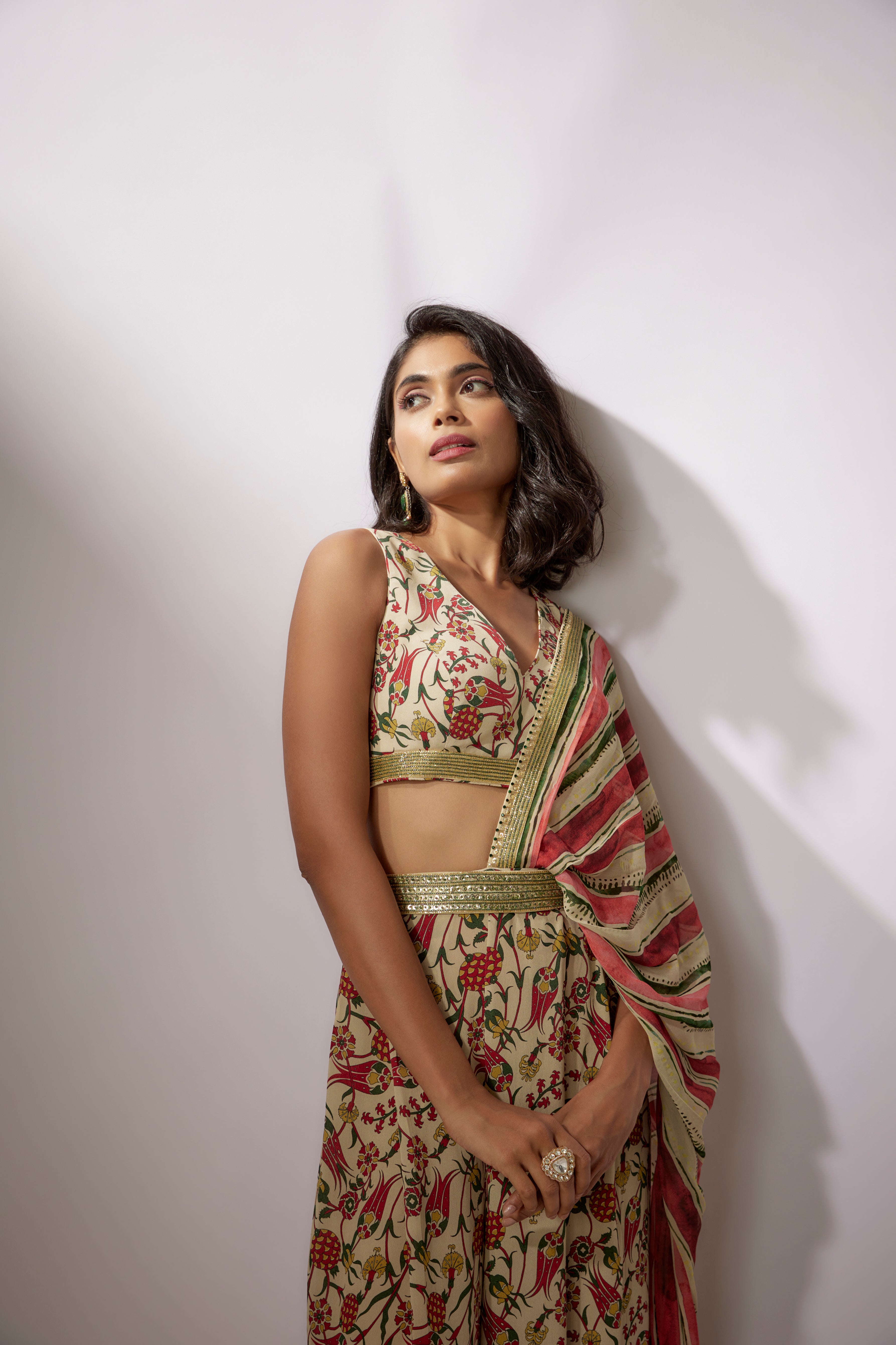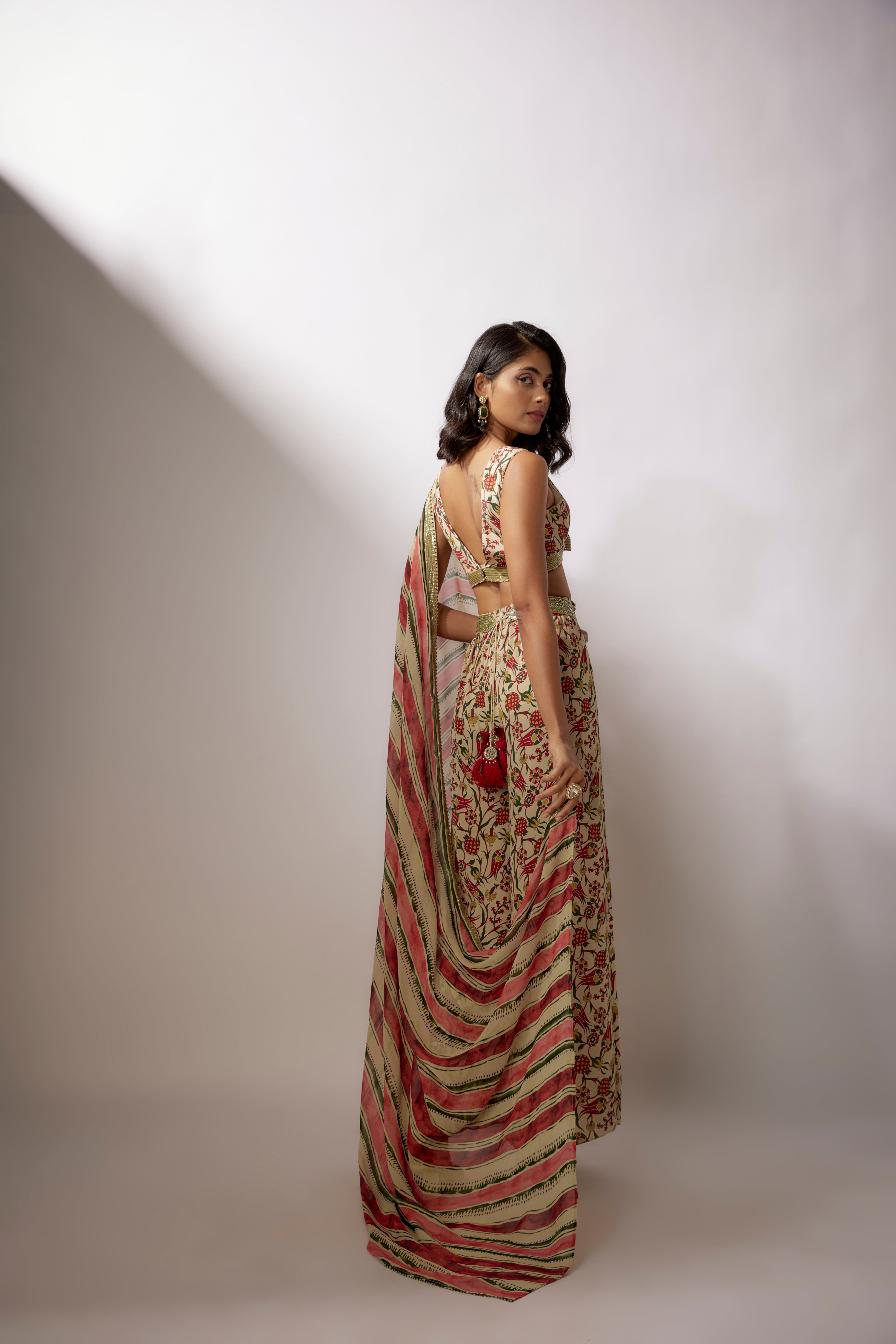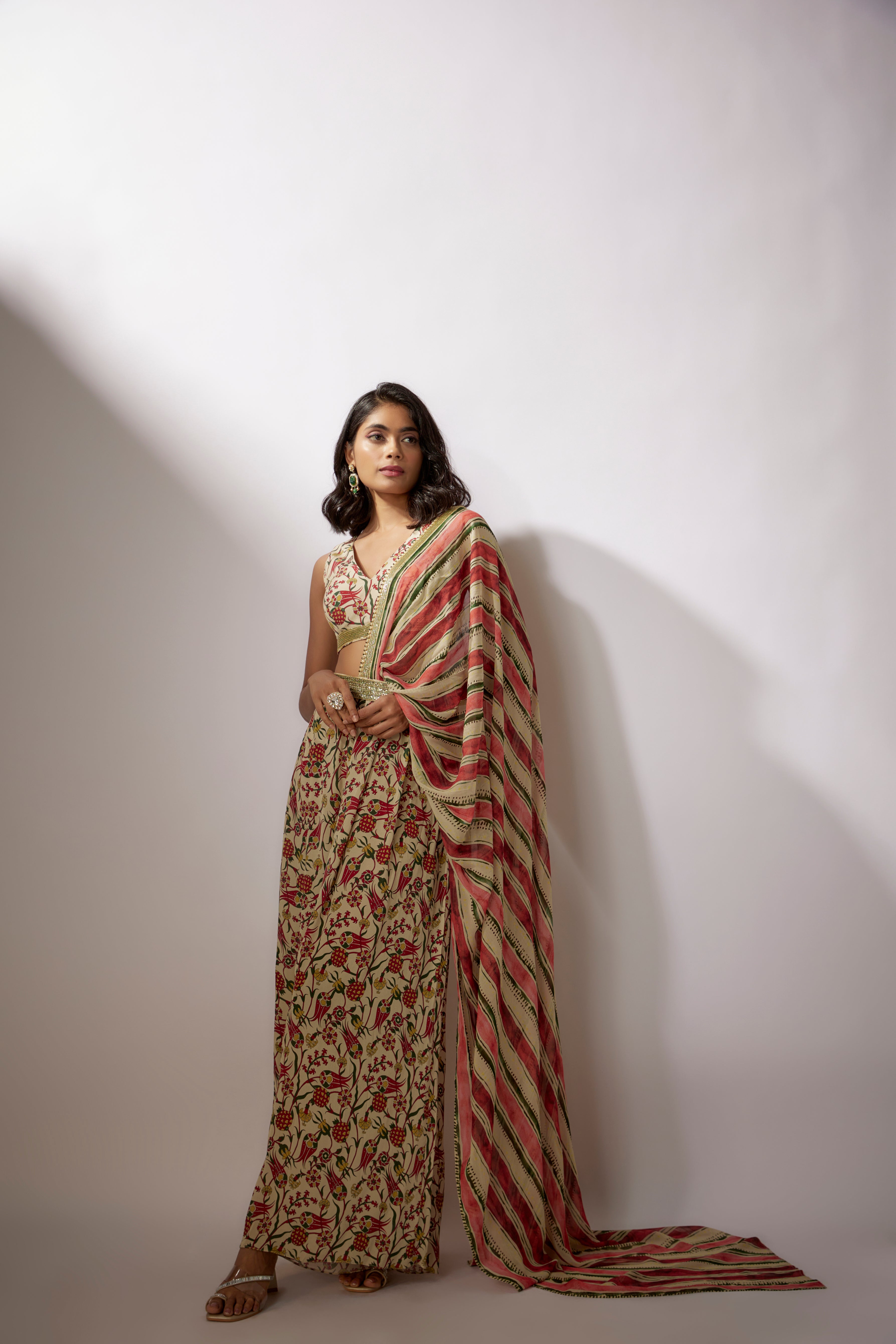 Featuring a beige printed blouse in crepe with sequins work. Comes with matching pants & stripes printed draped saree in crepe. Accessorized with a raw silk belt with sequins work & tasseled tie-up.
