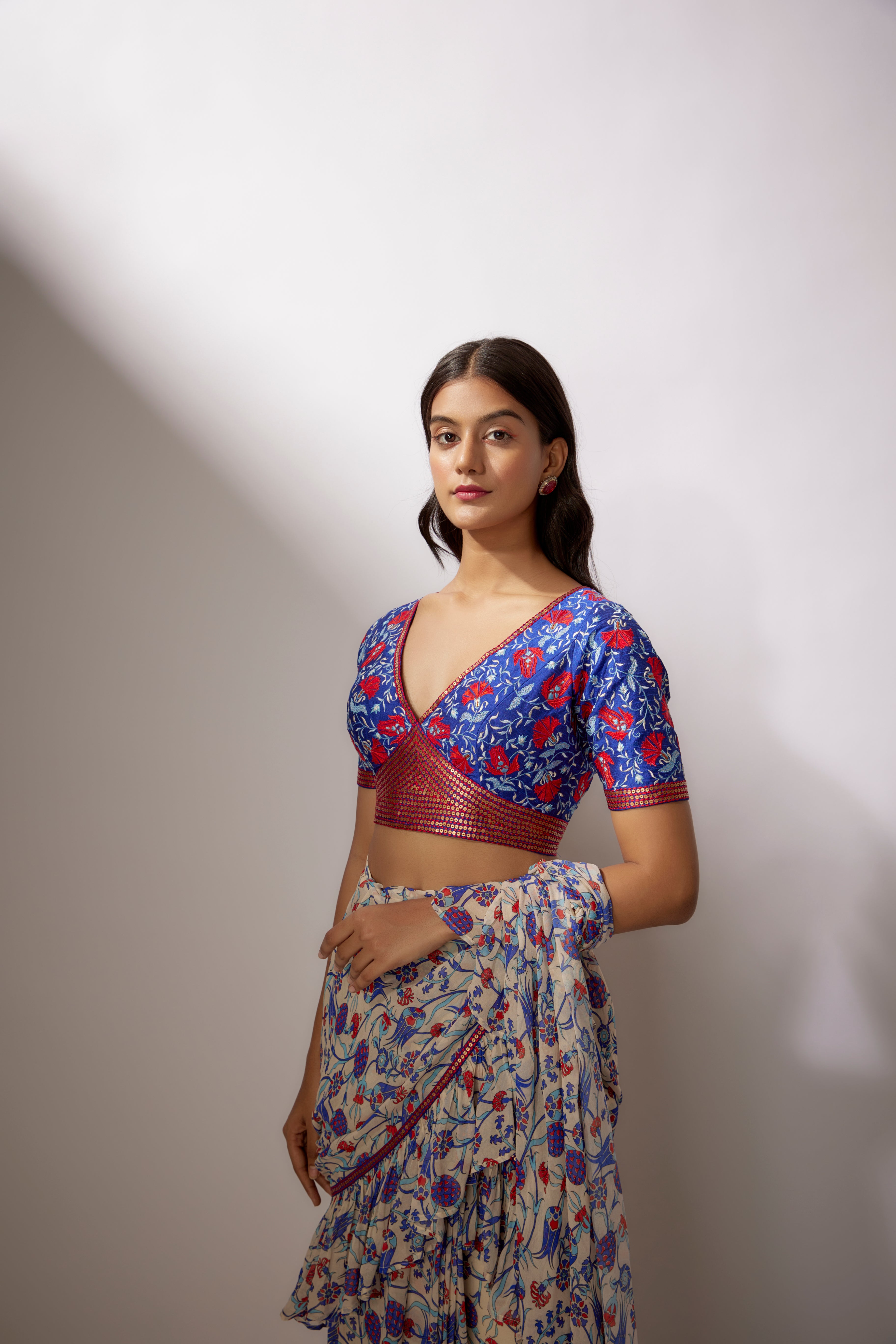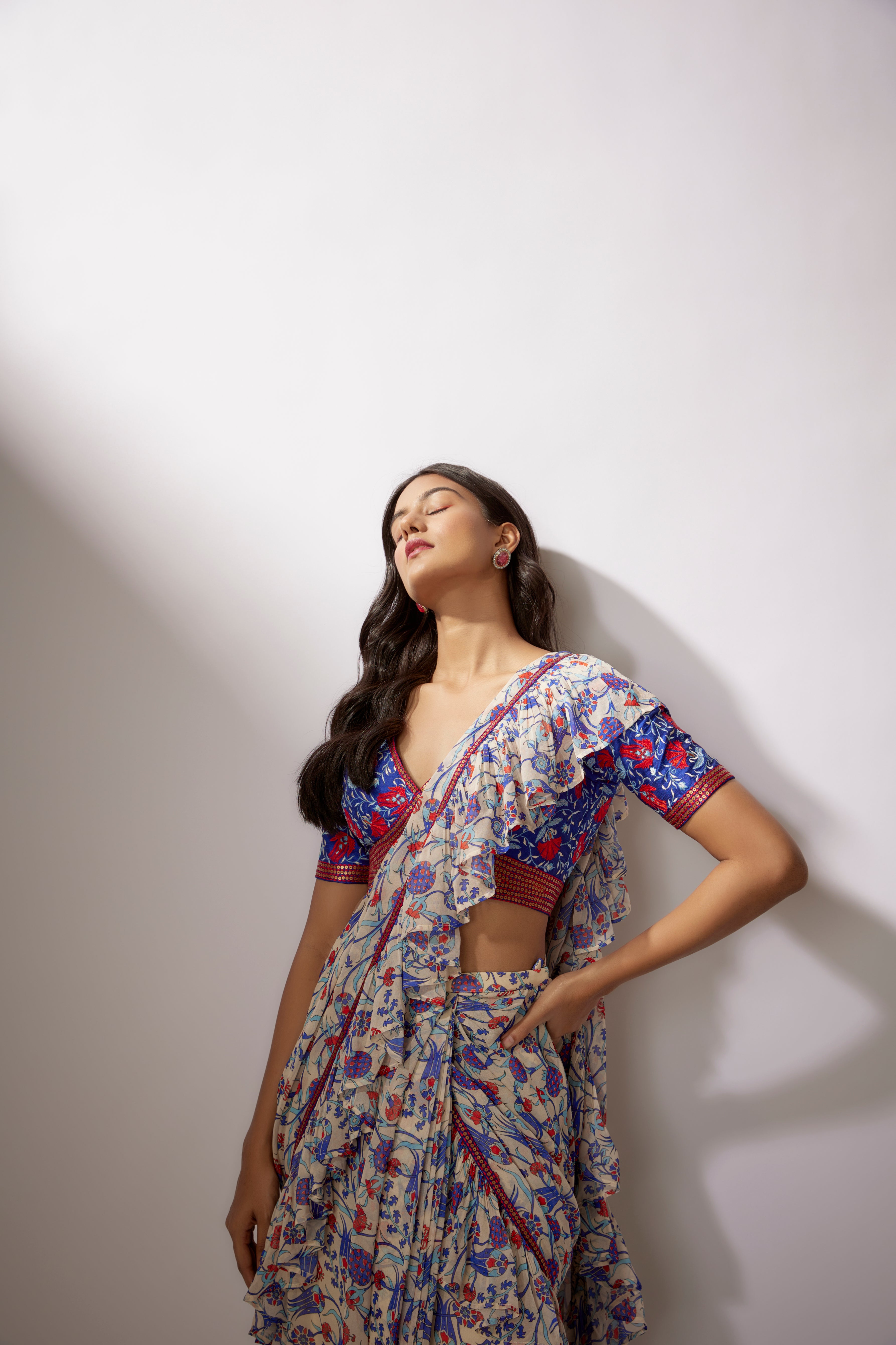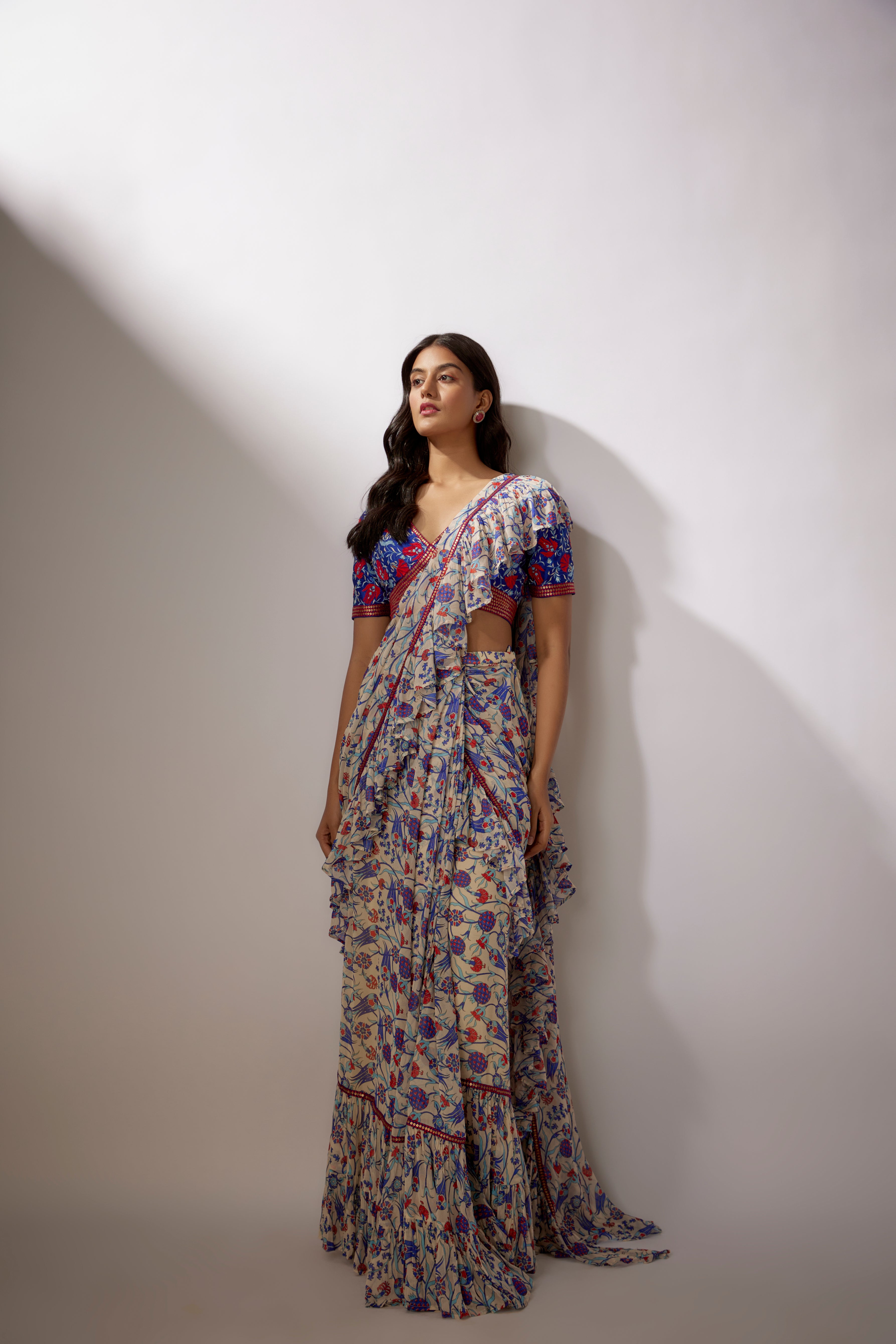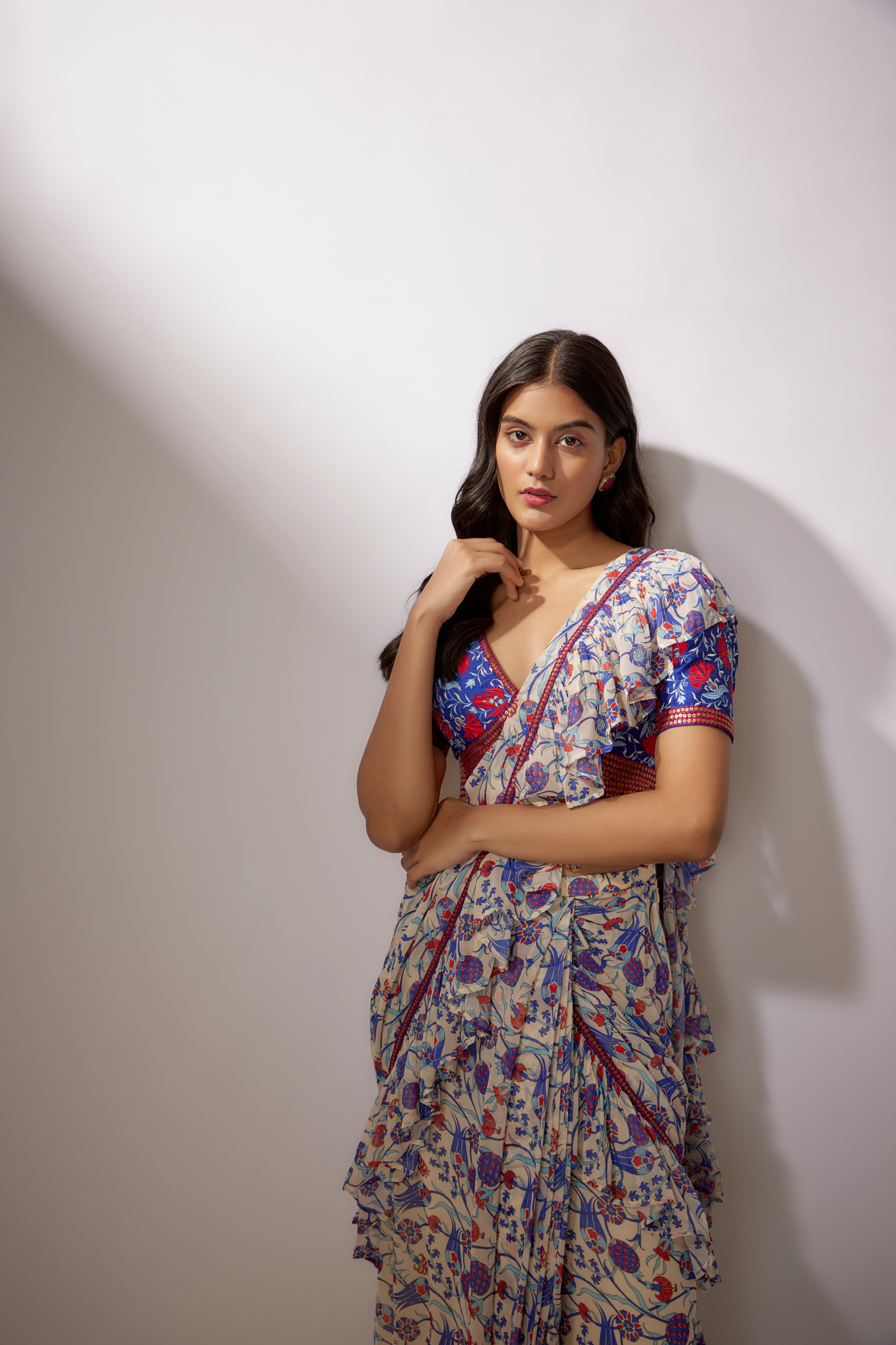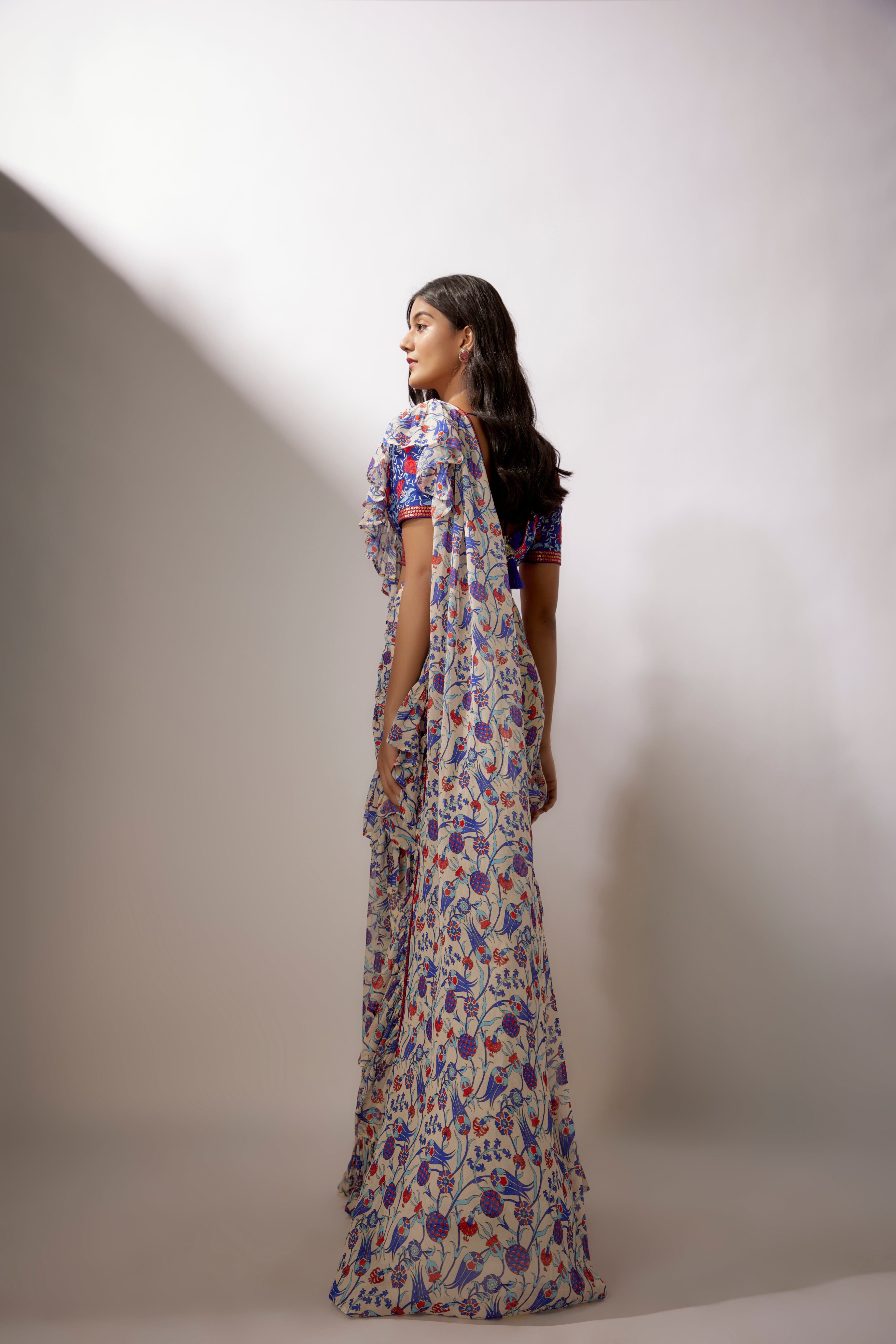 Featuring an ivory printed pre-draped saree in georgette fabric with sequins work. Comes with blouse in raw silk with threadwork embroidery all over & sequins work on edges.