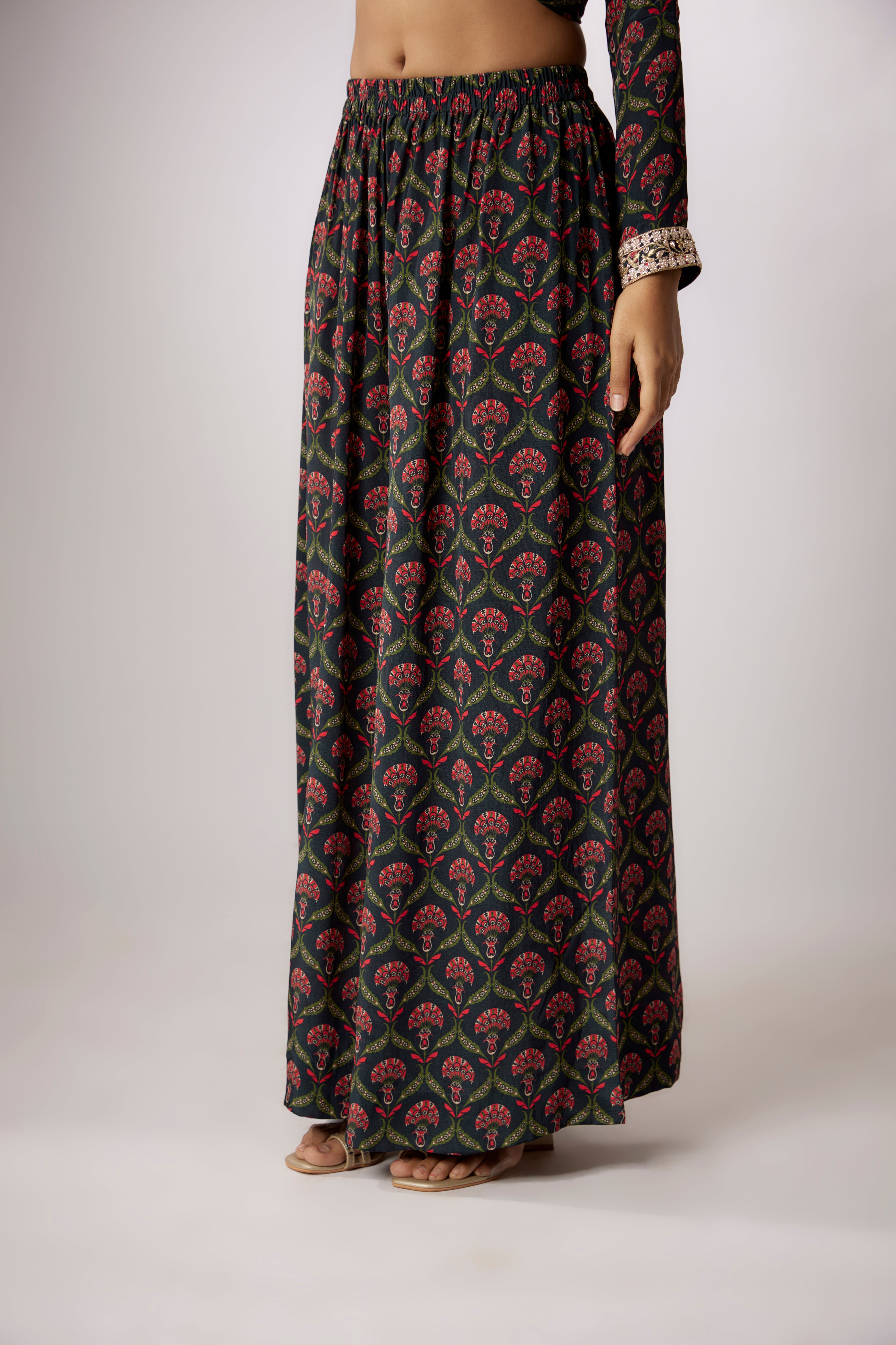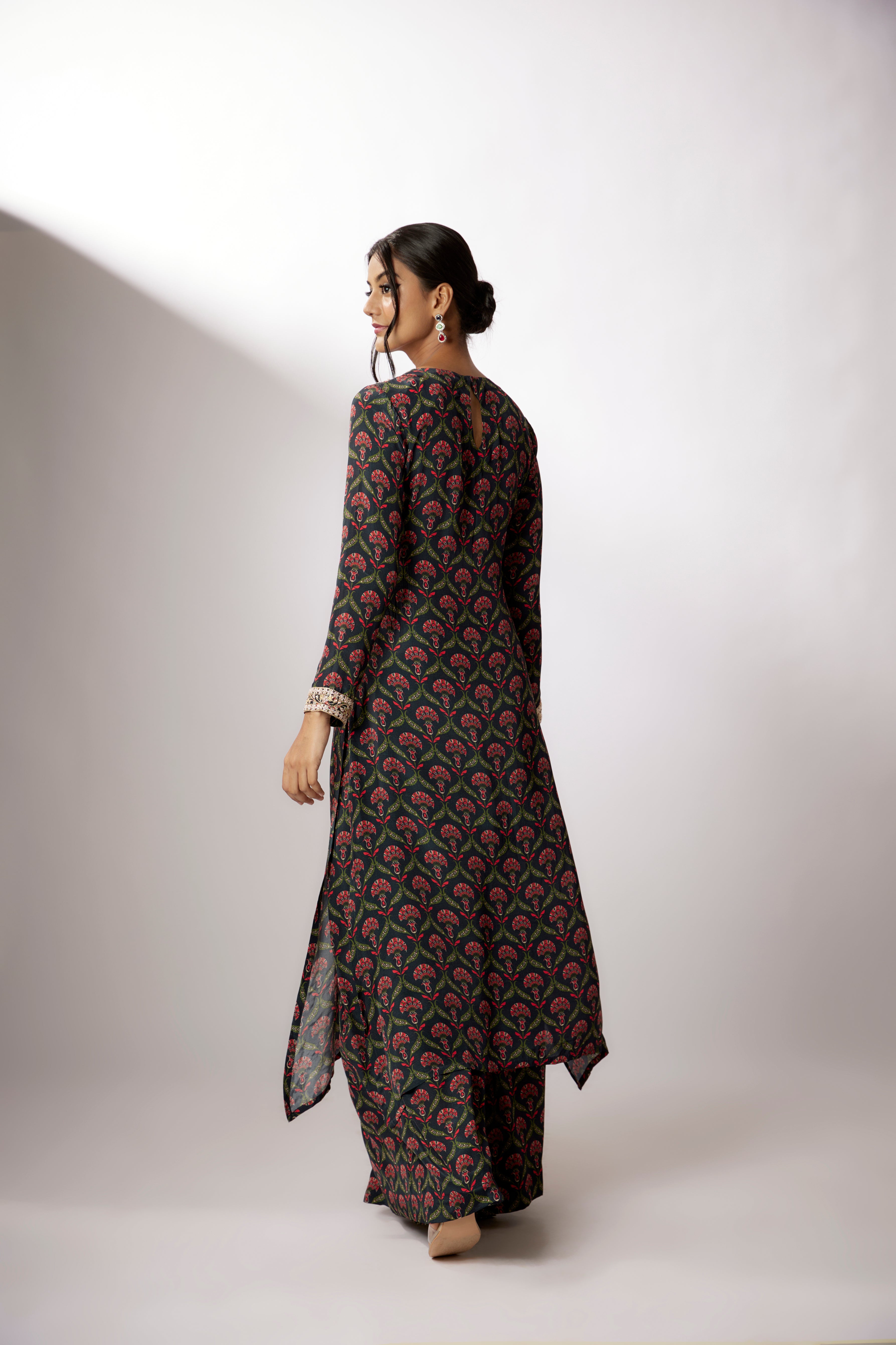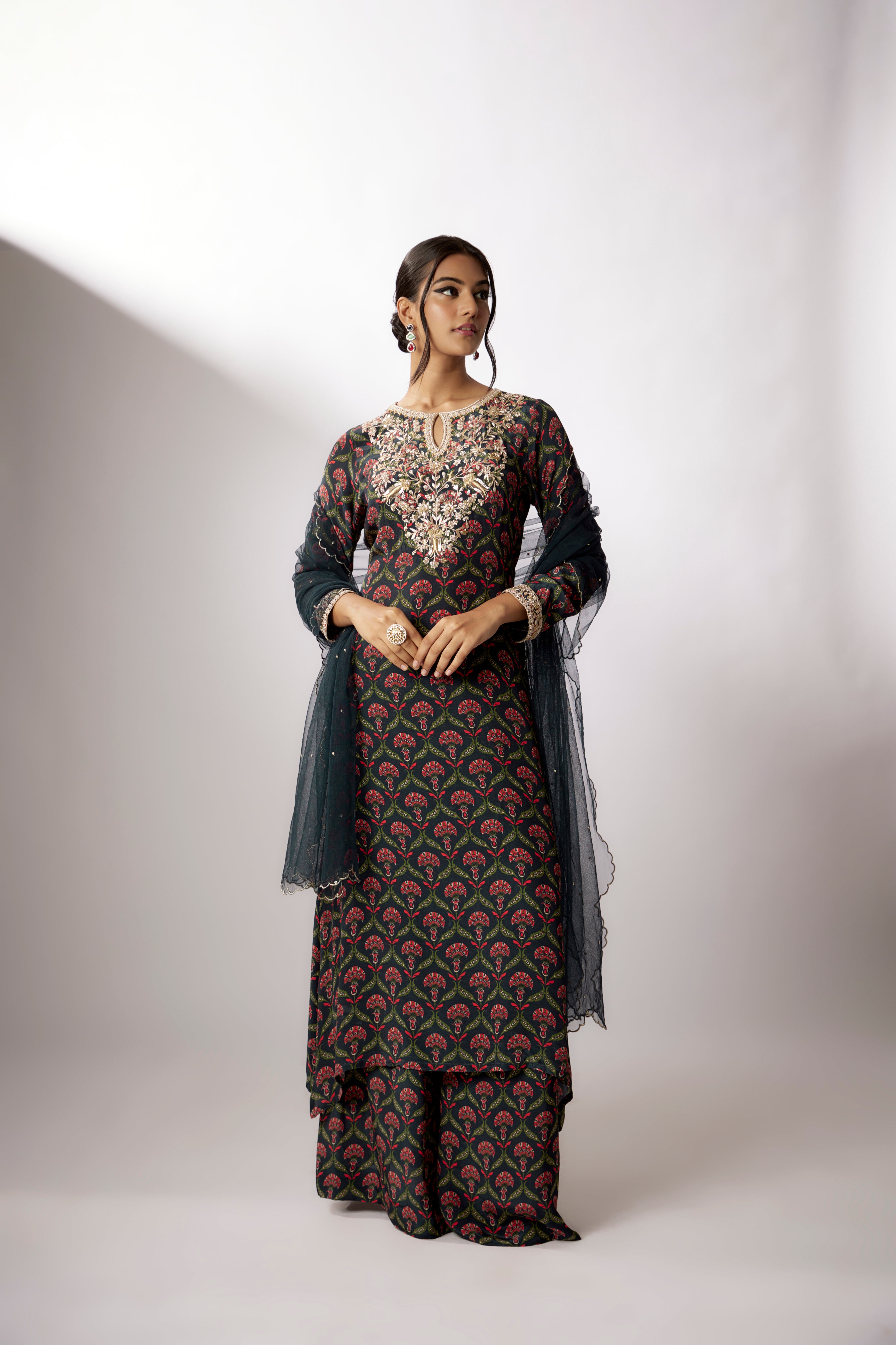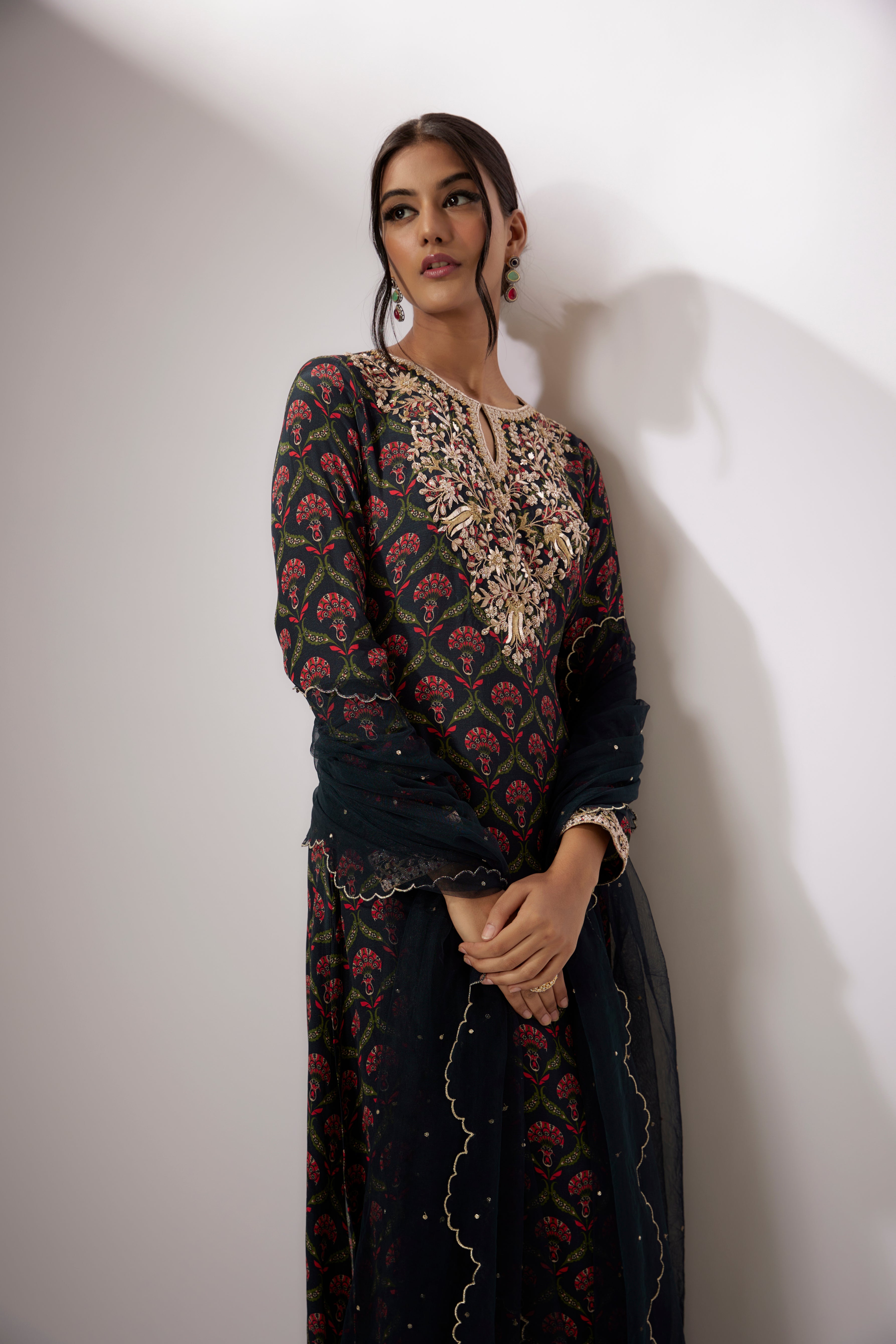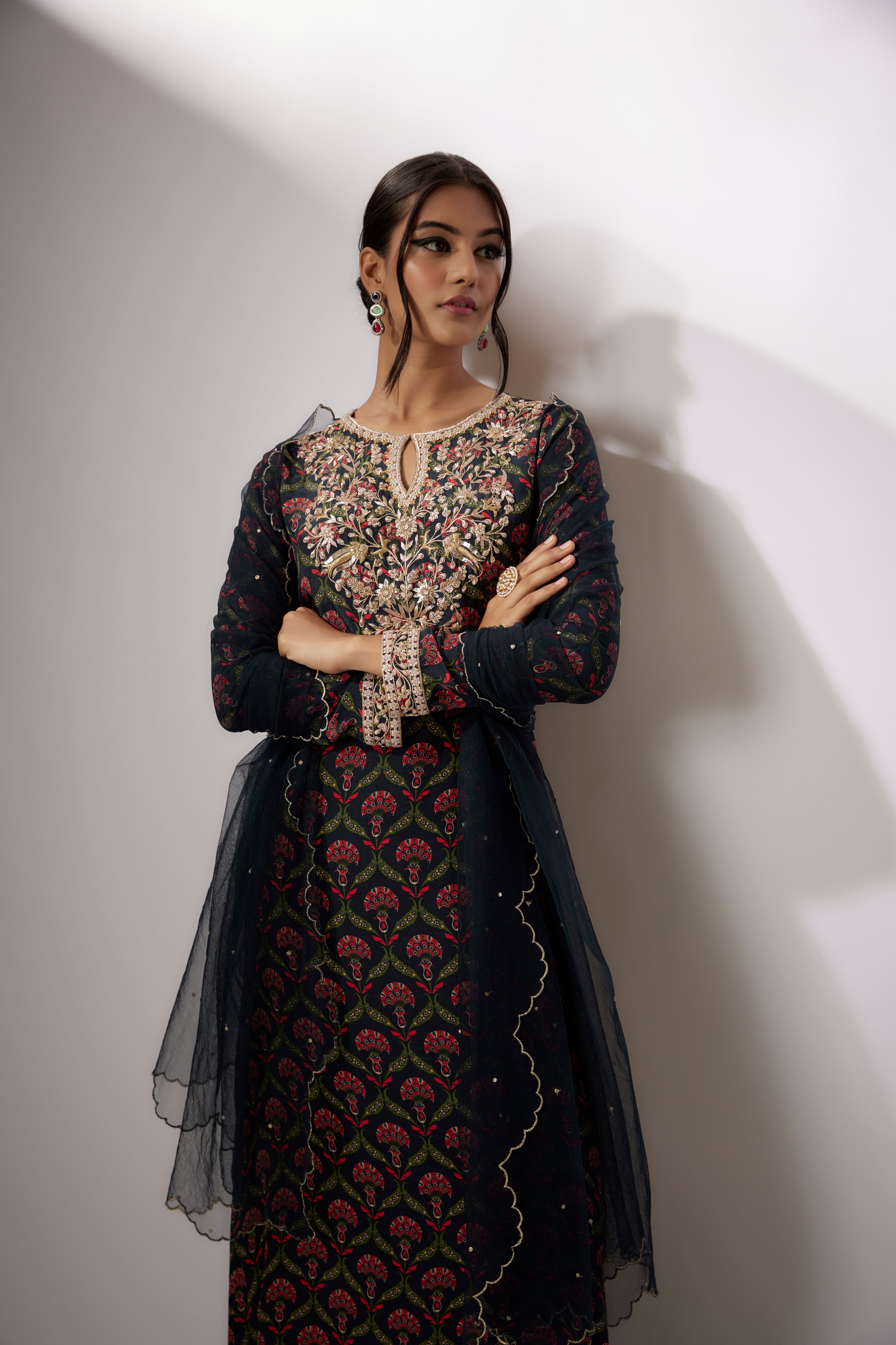 Featuring a navy blue printed kurta in crepe fabric with zardosi embroidery on yoke & cuffs. Comes with matching pallazzos in crepe fabric & net dupatta with sequins & cutwork embroidery.