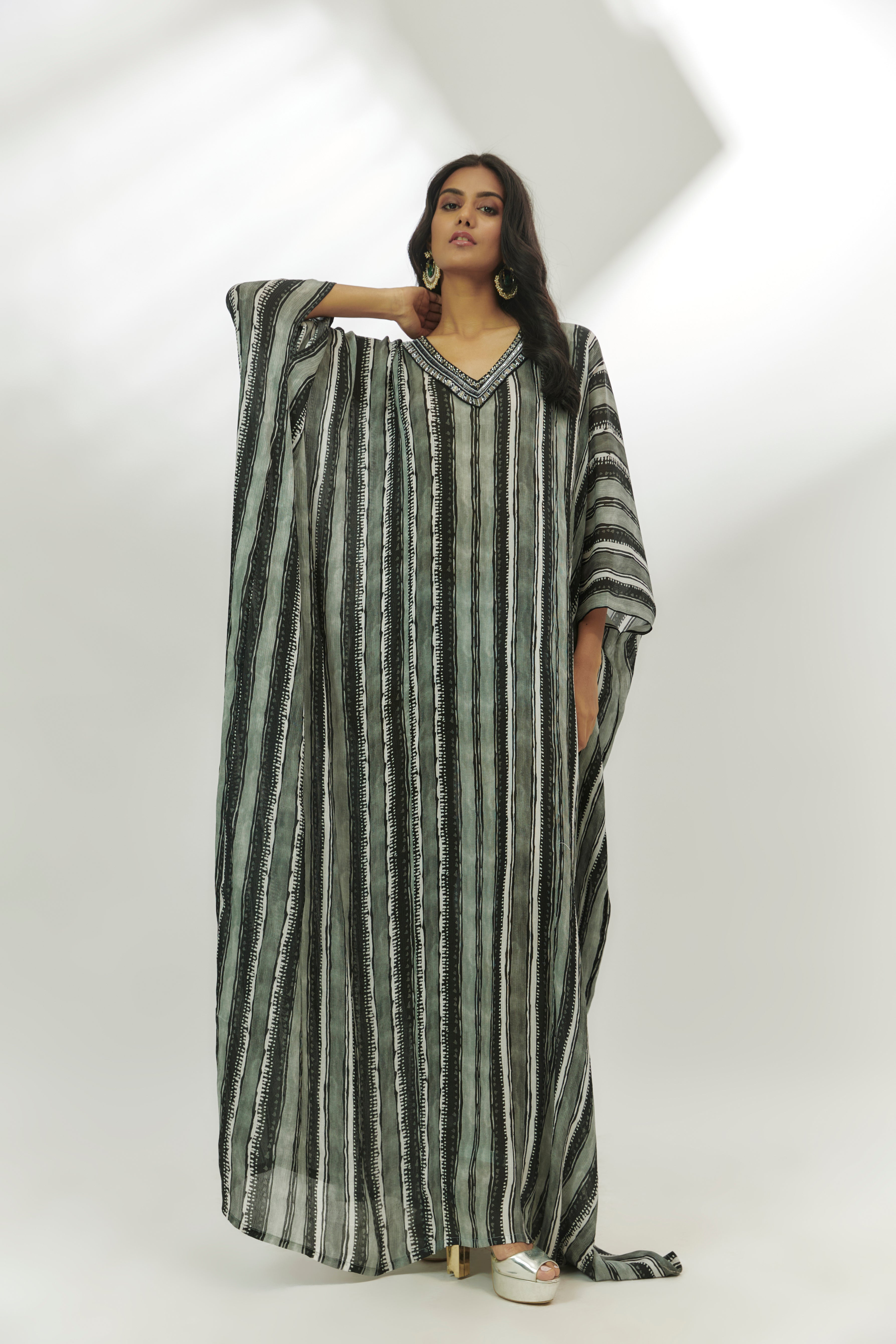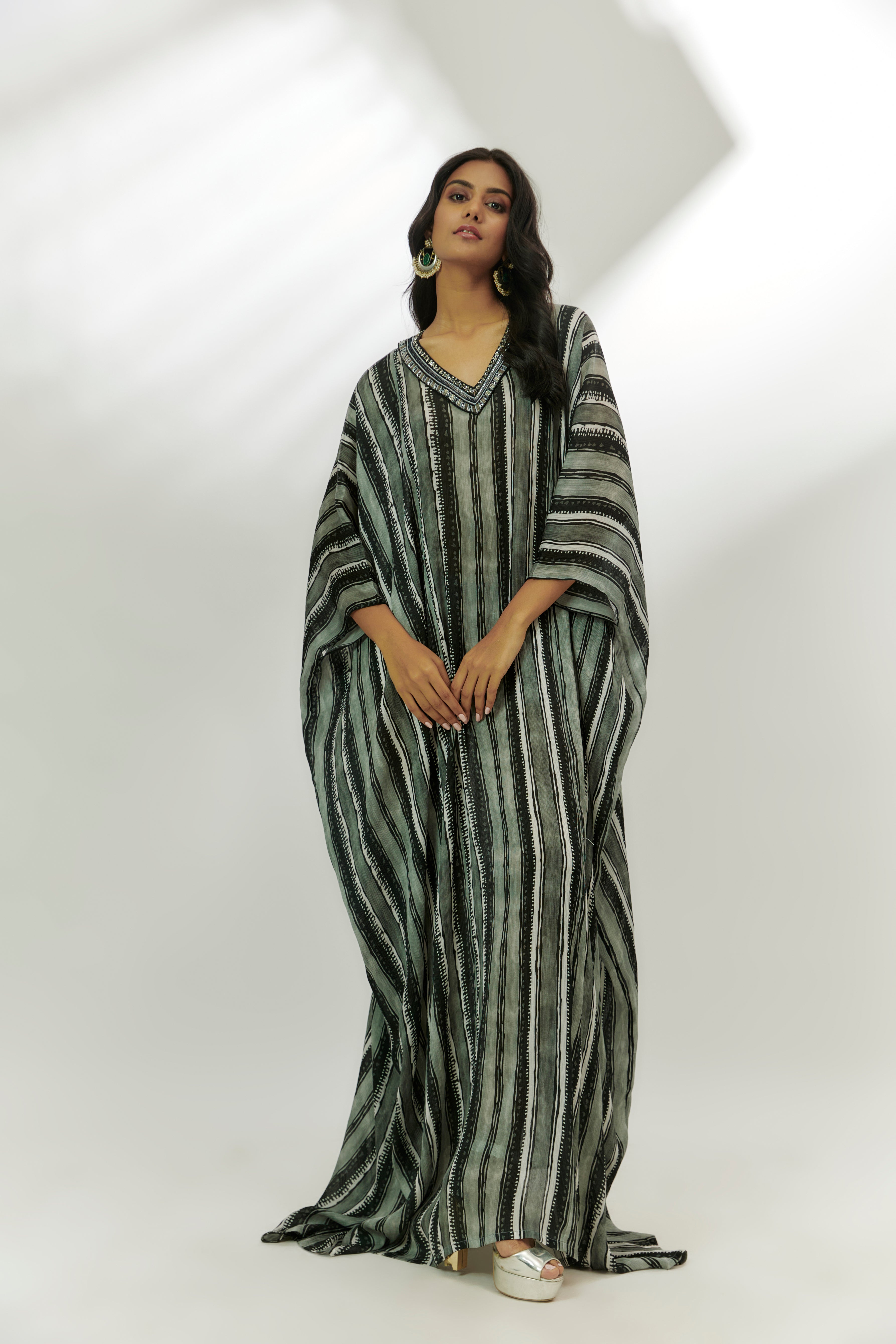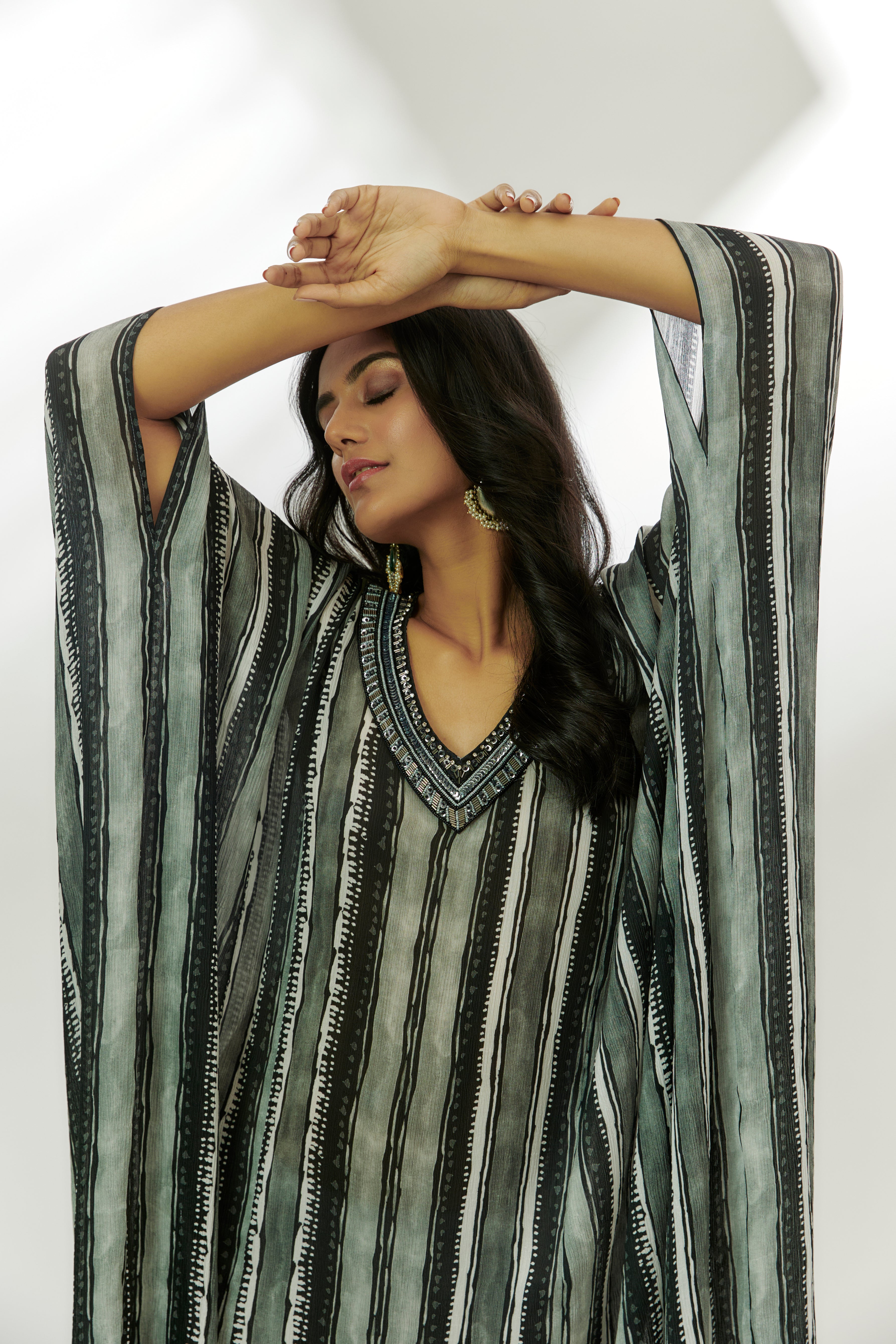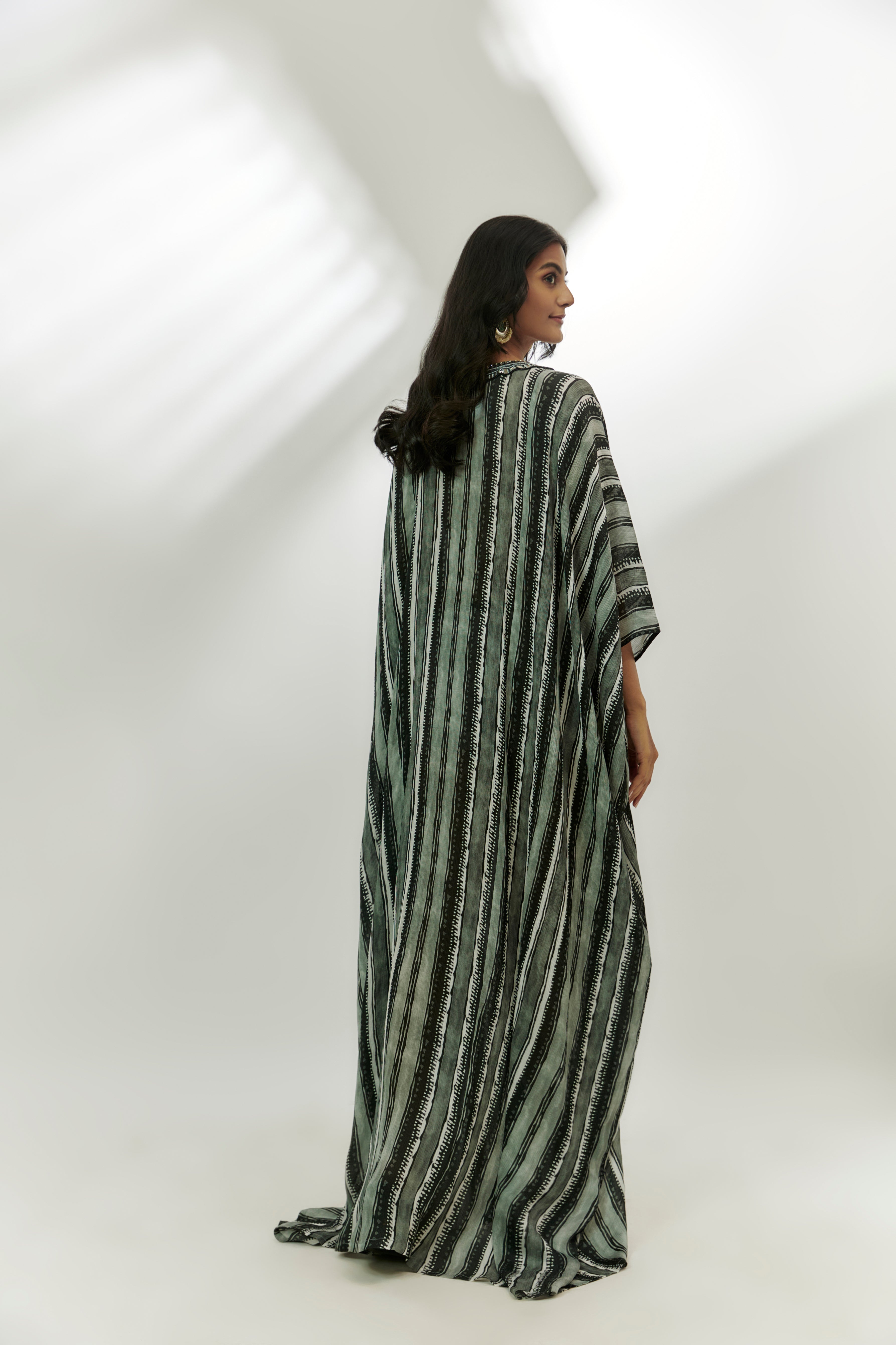 Black Green Stripes Printed and Embroidered Kaftan Dress