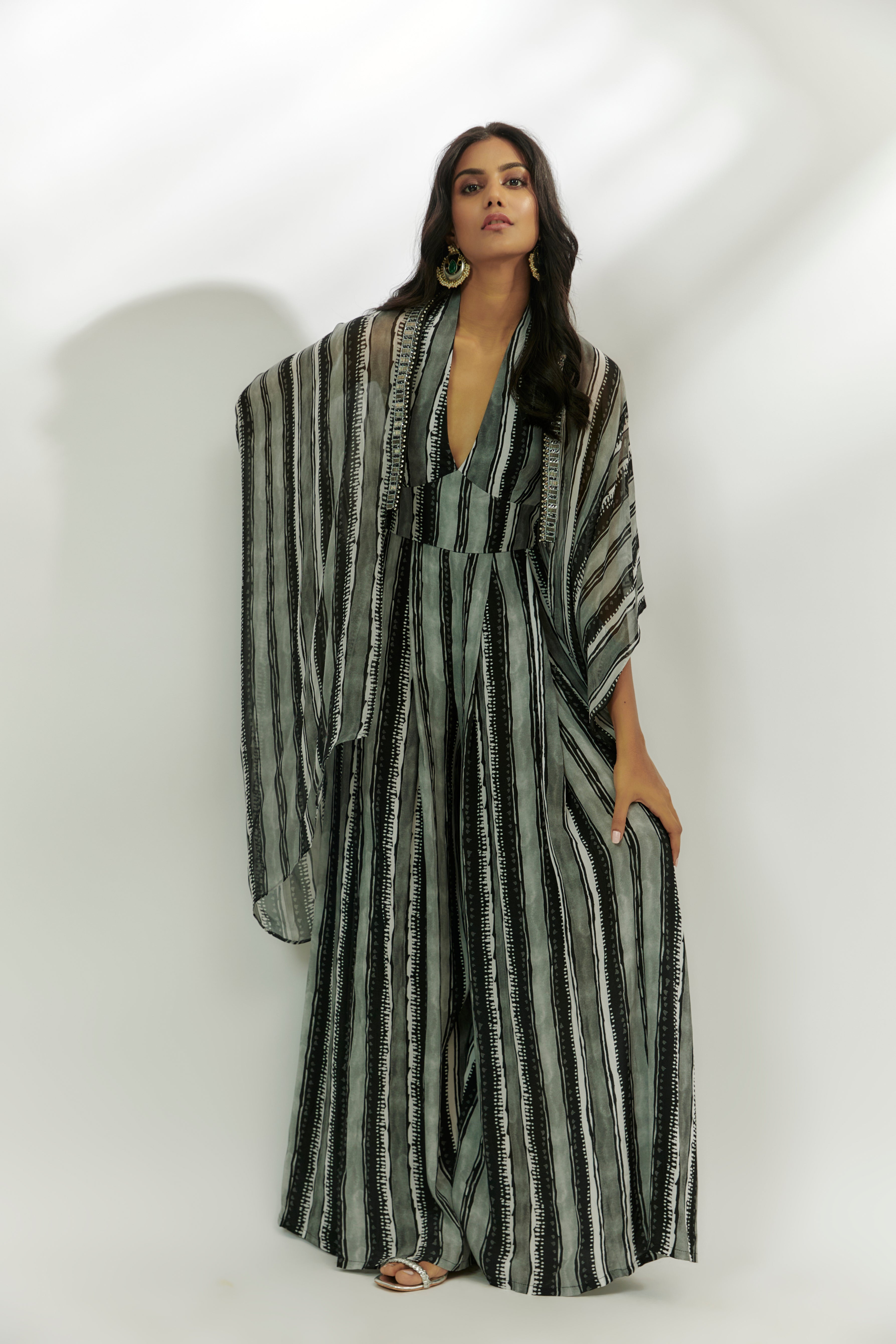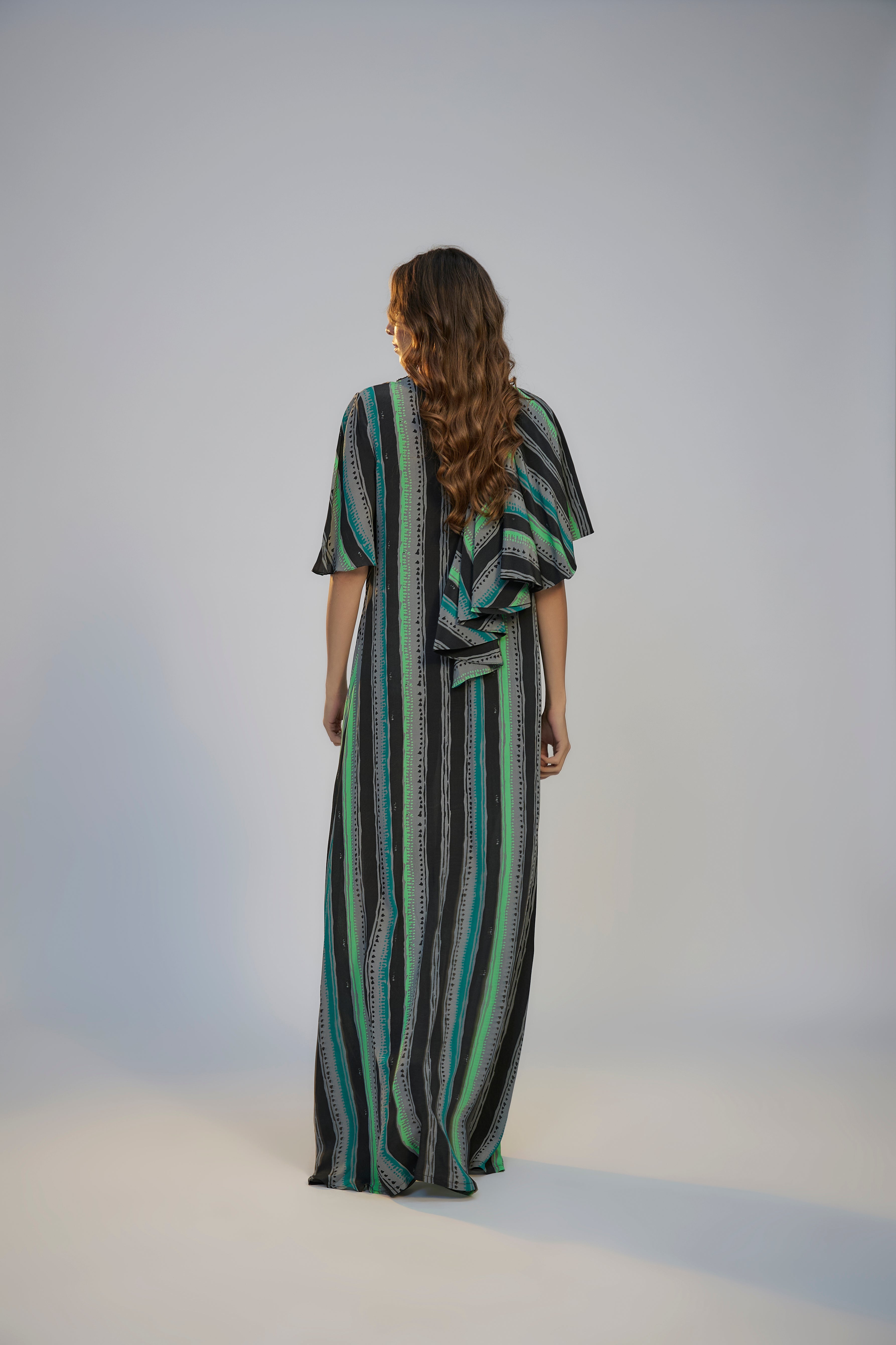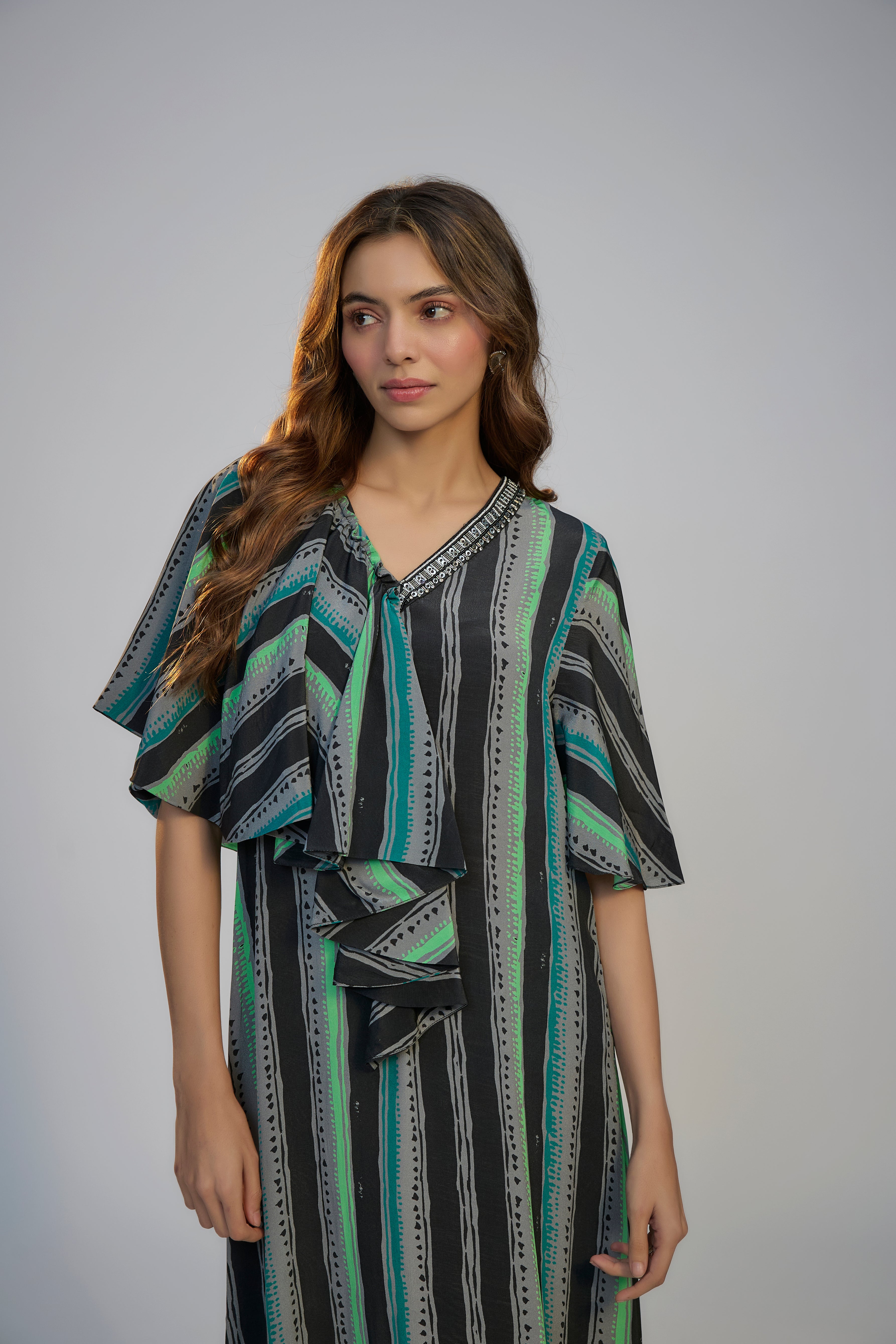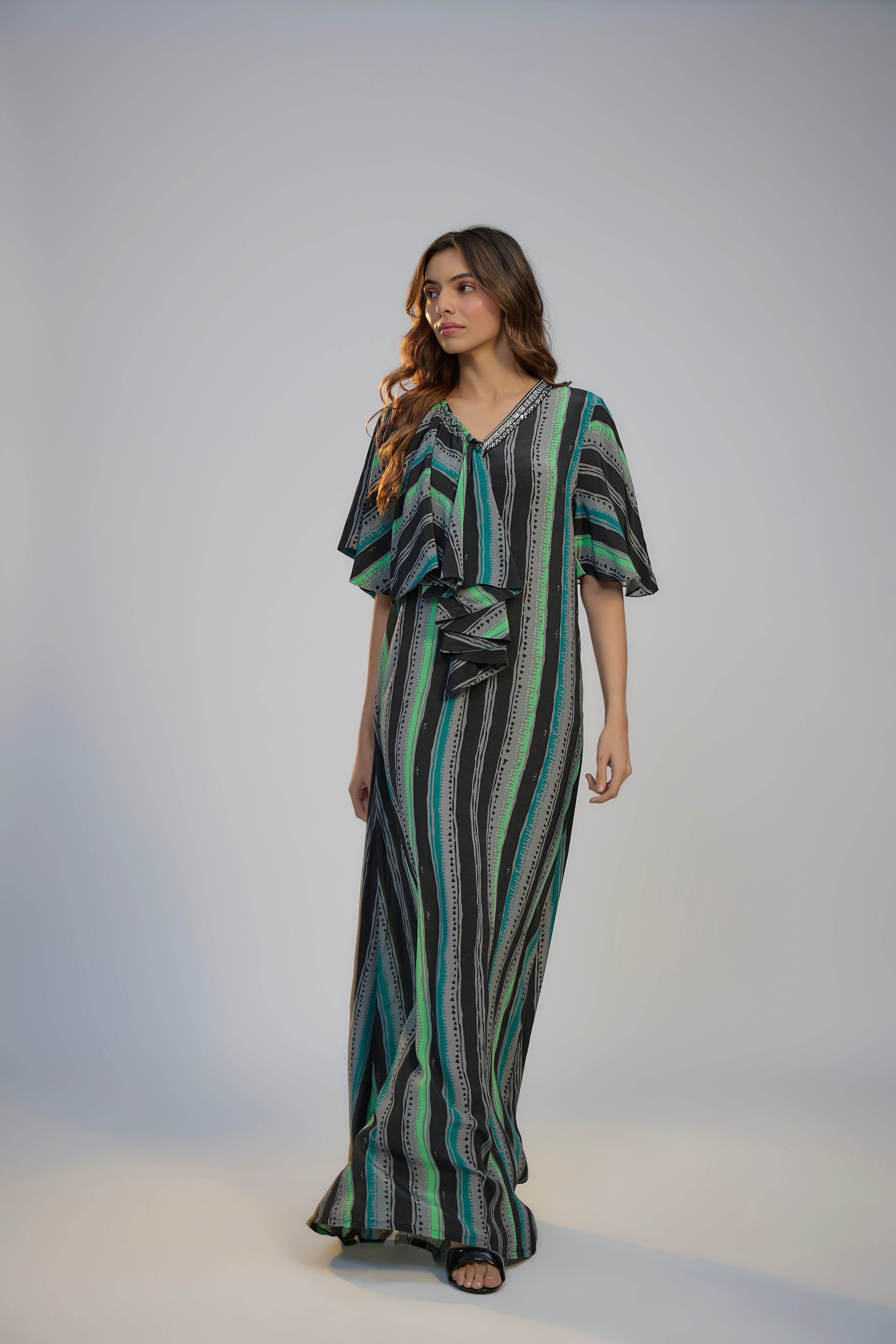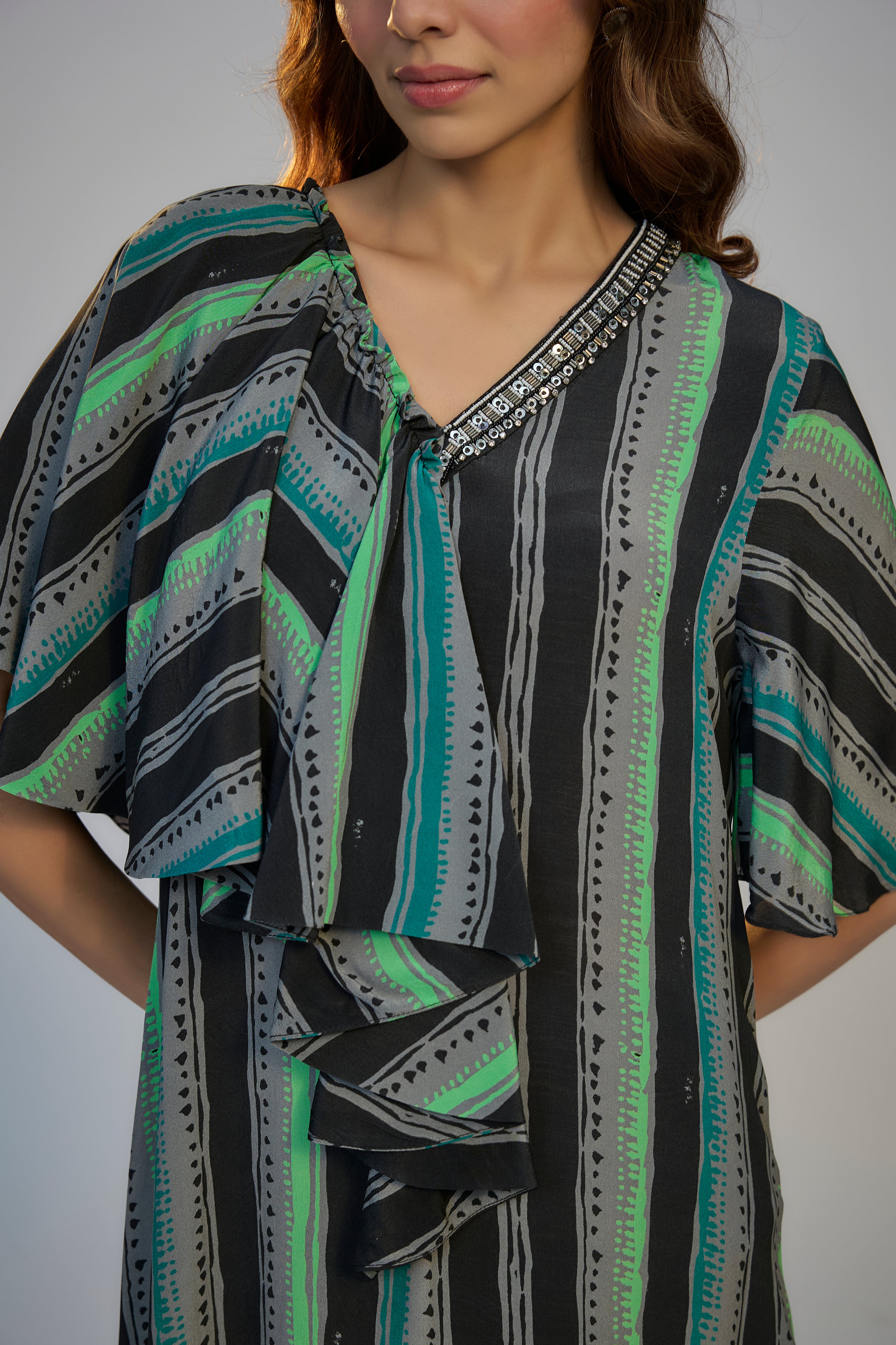Black Green Stripes Printed and Embroidered Kaftan Dress
