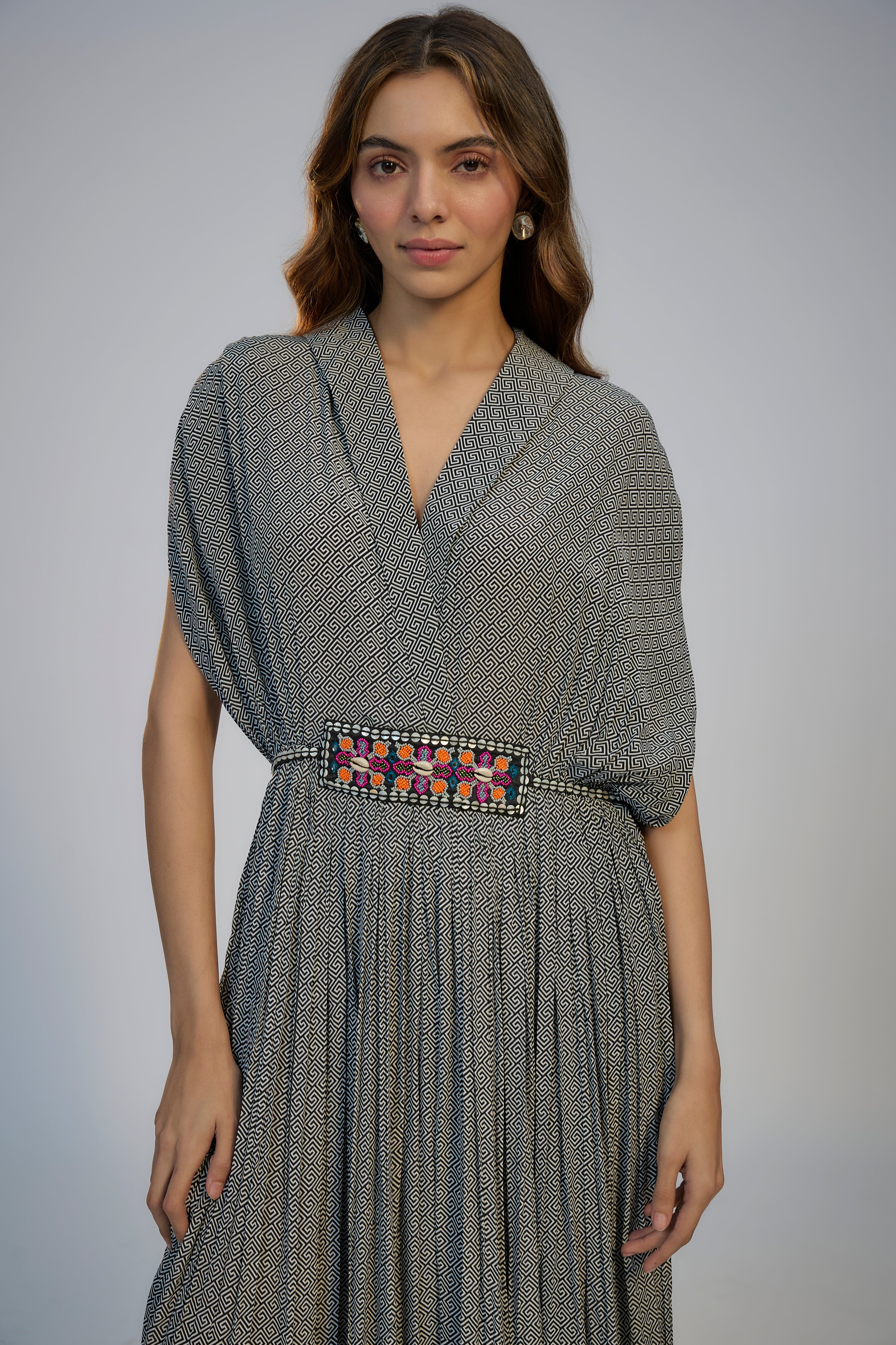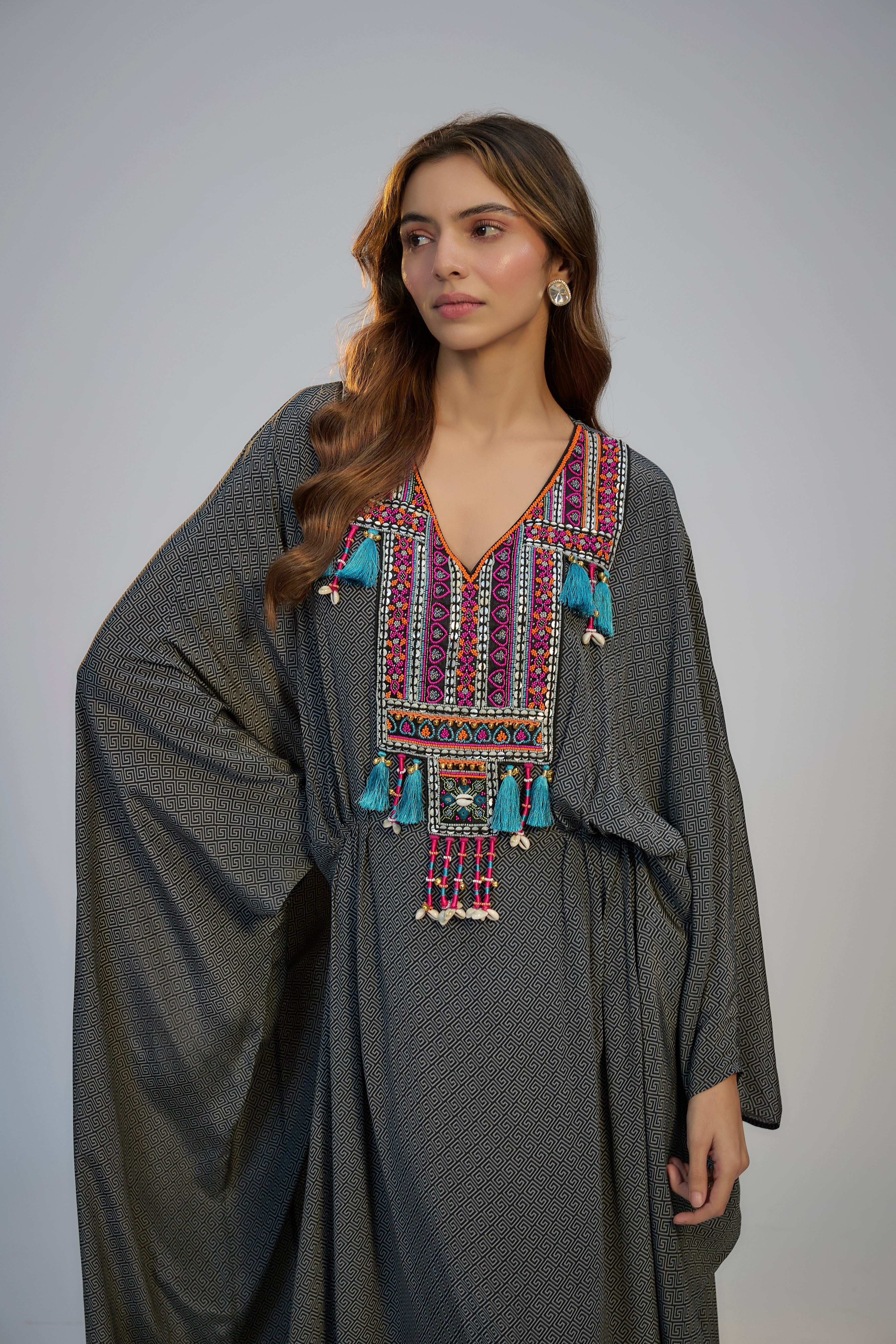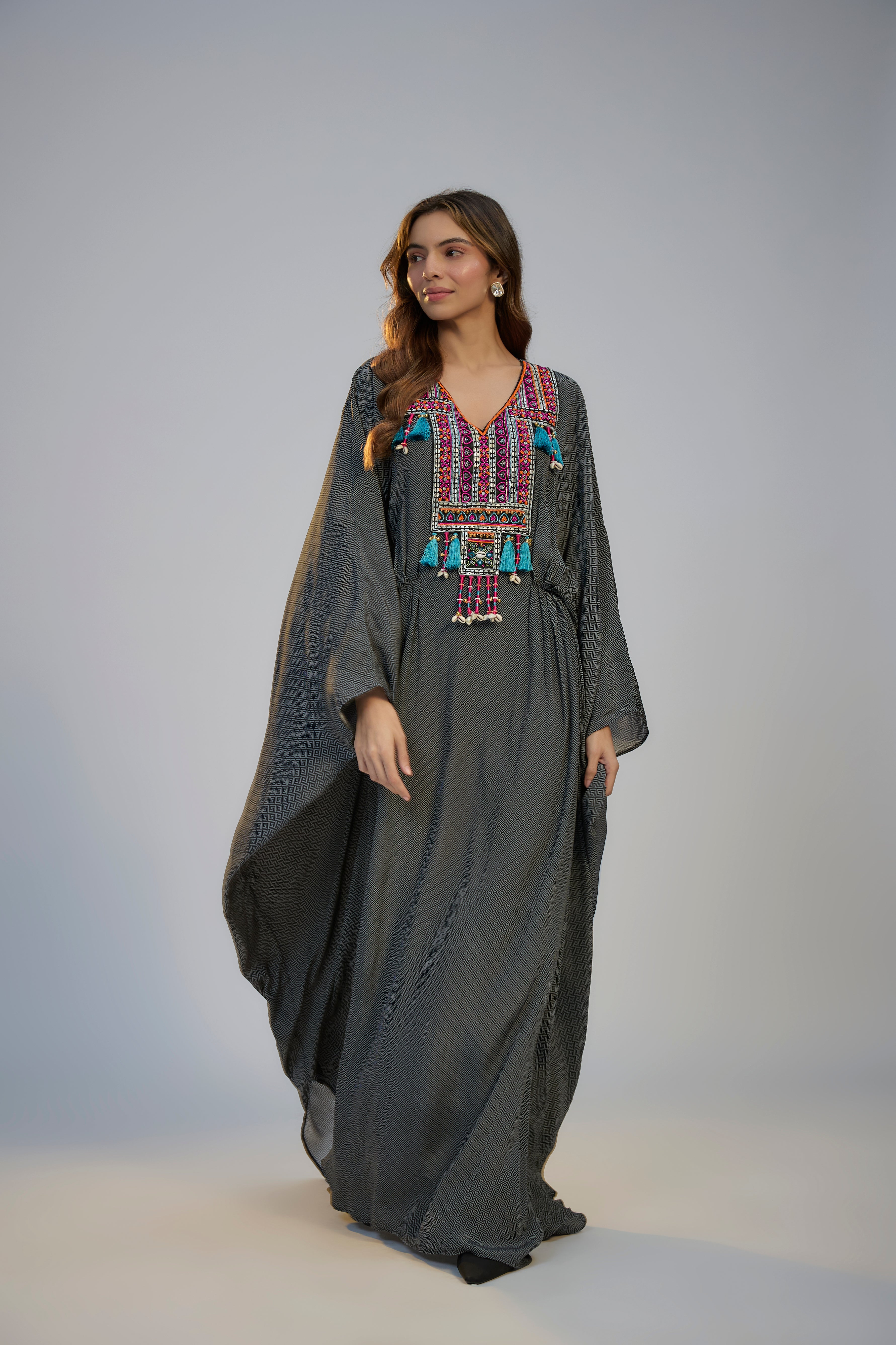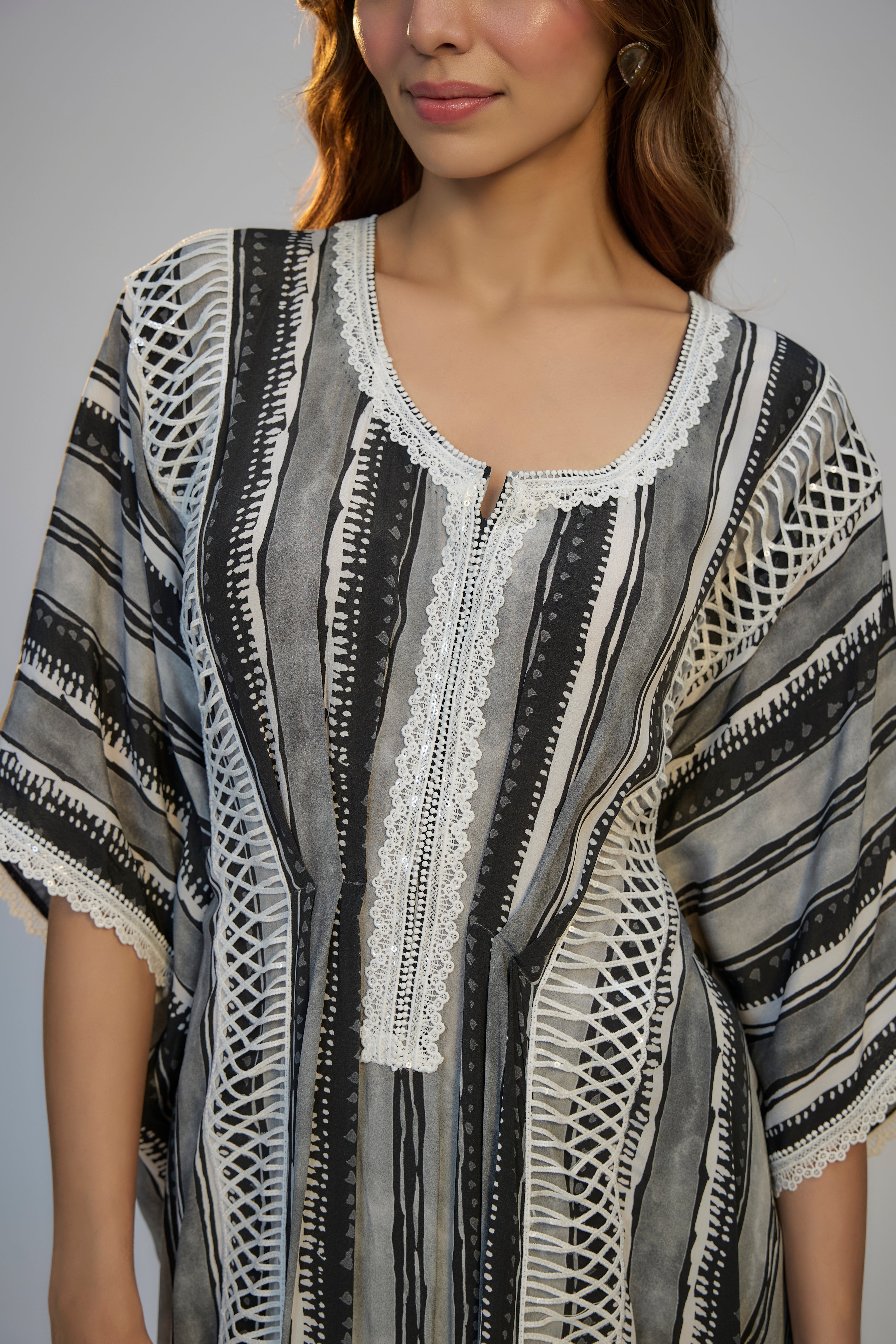 Black Green Stripes Printed and Embroidered Kaftan Dress