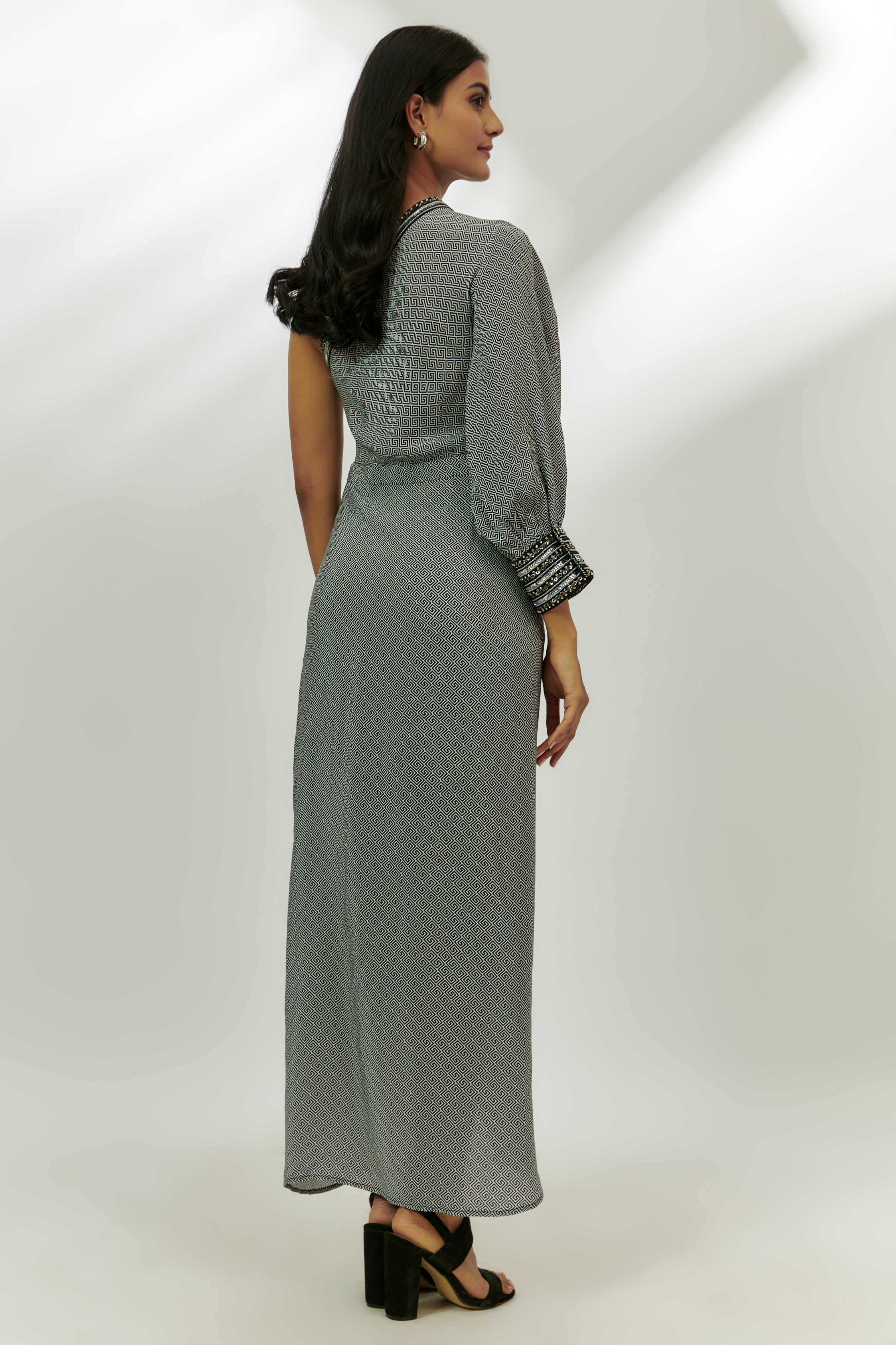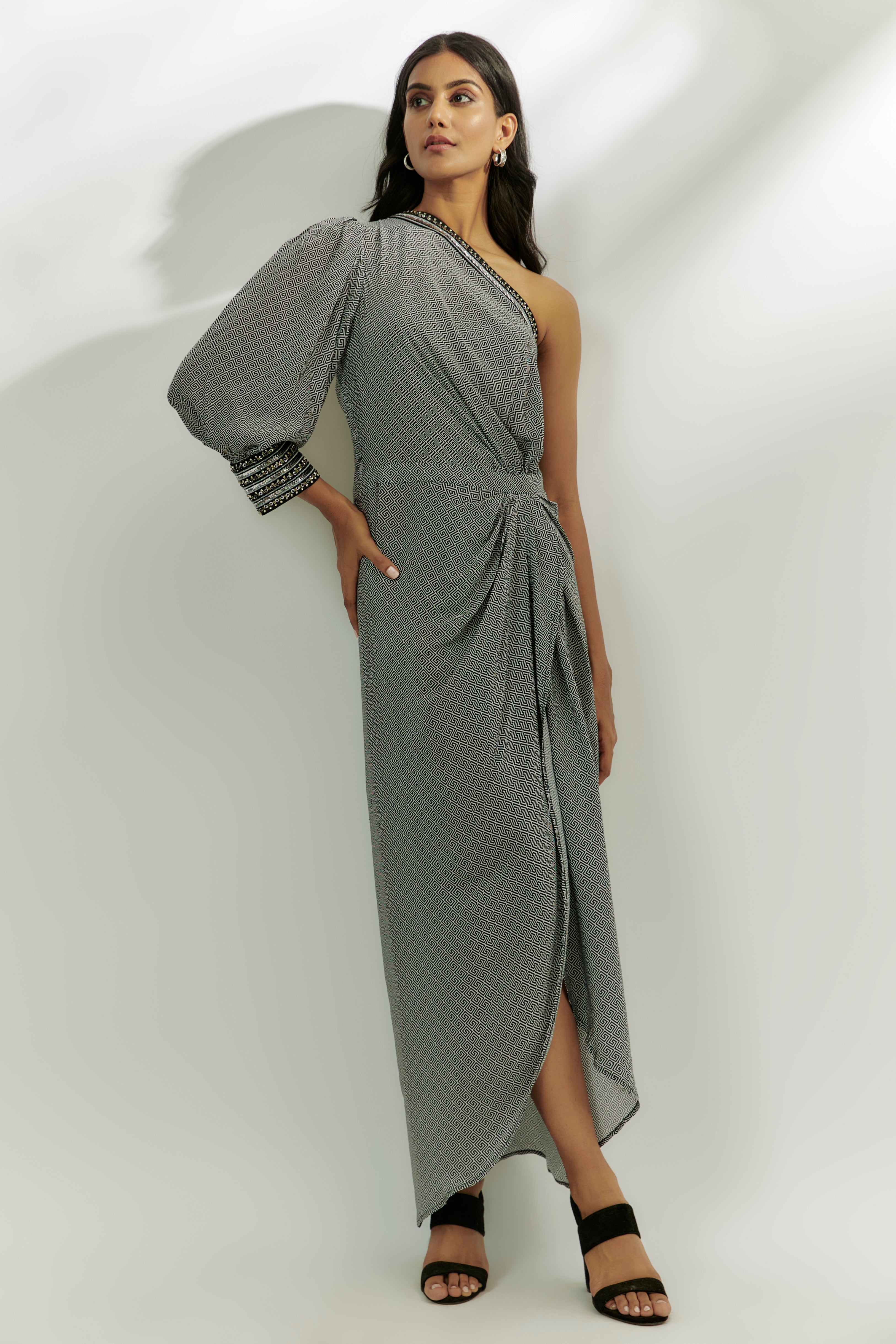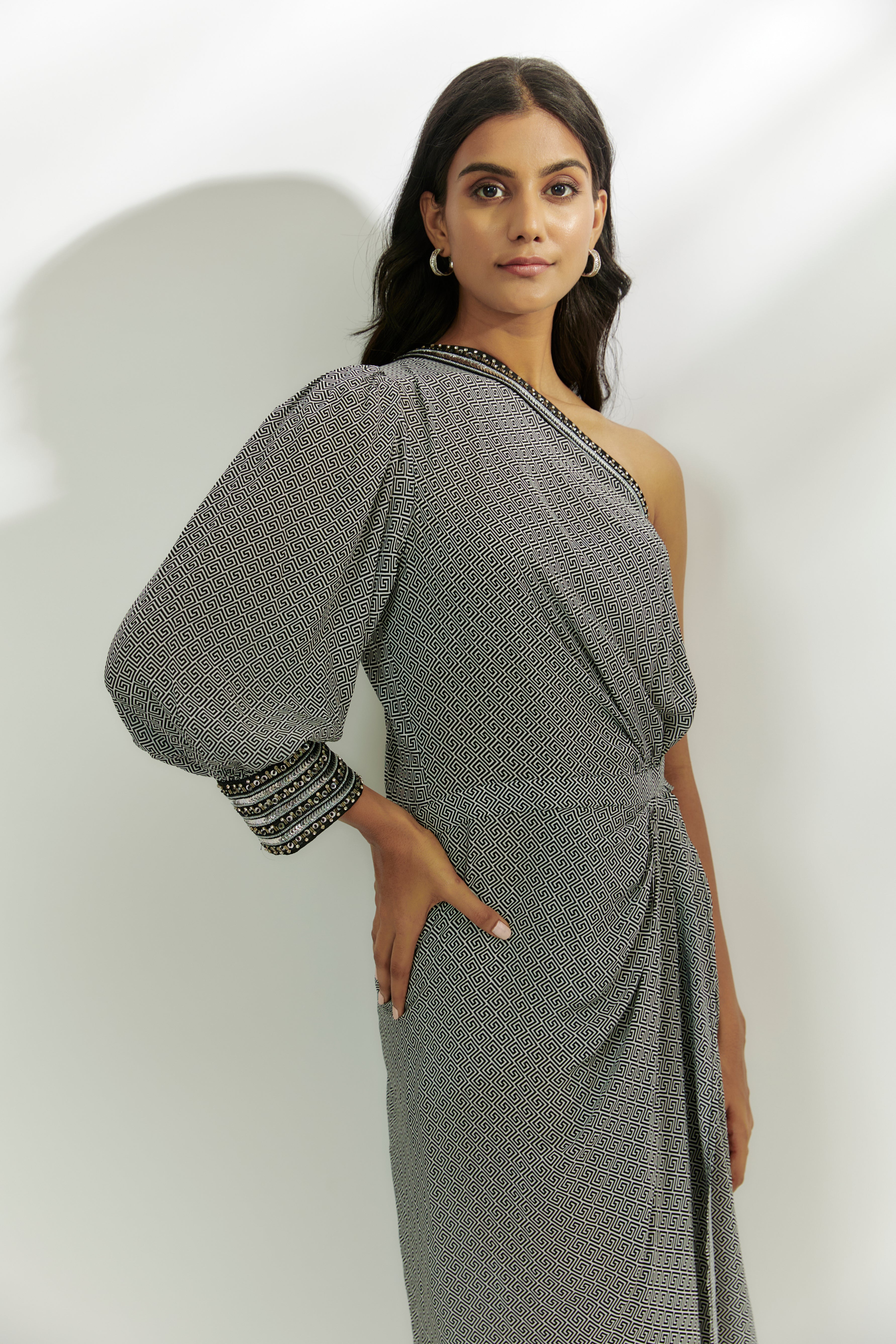 Shachi Black Crepe Digital Printed & Sequins Embroidered One-Shoulder Maxi Dress