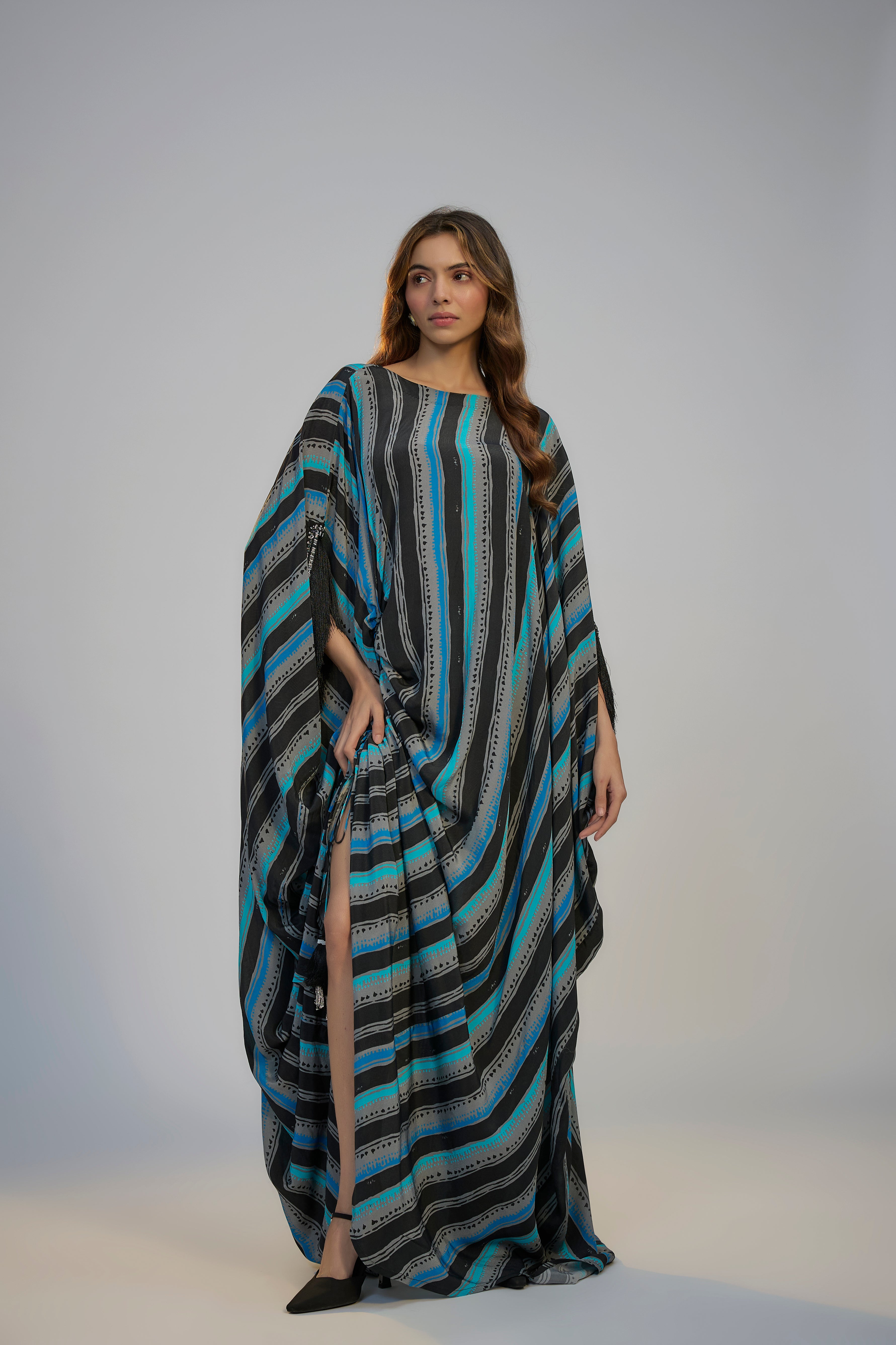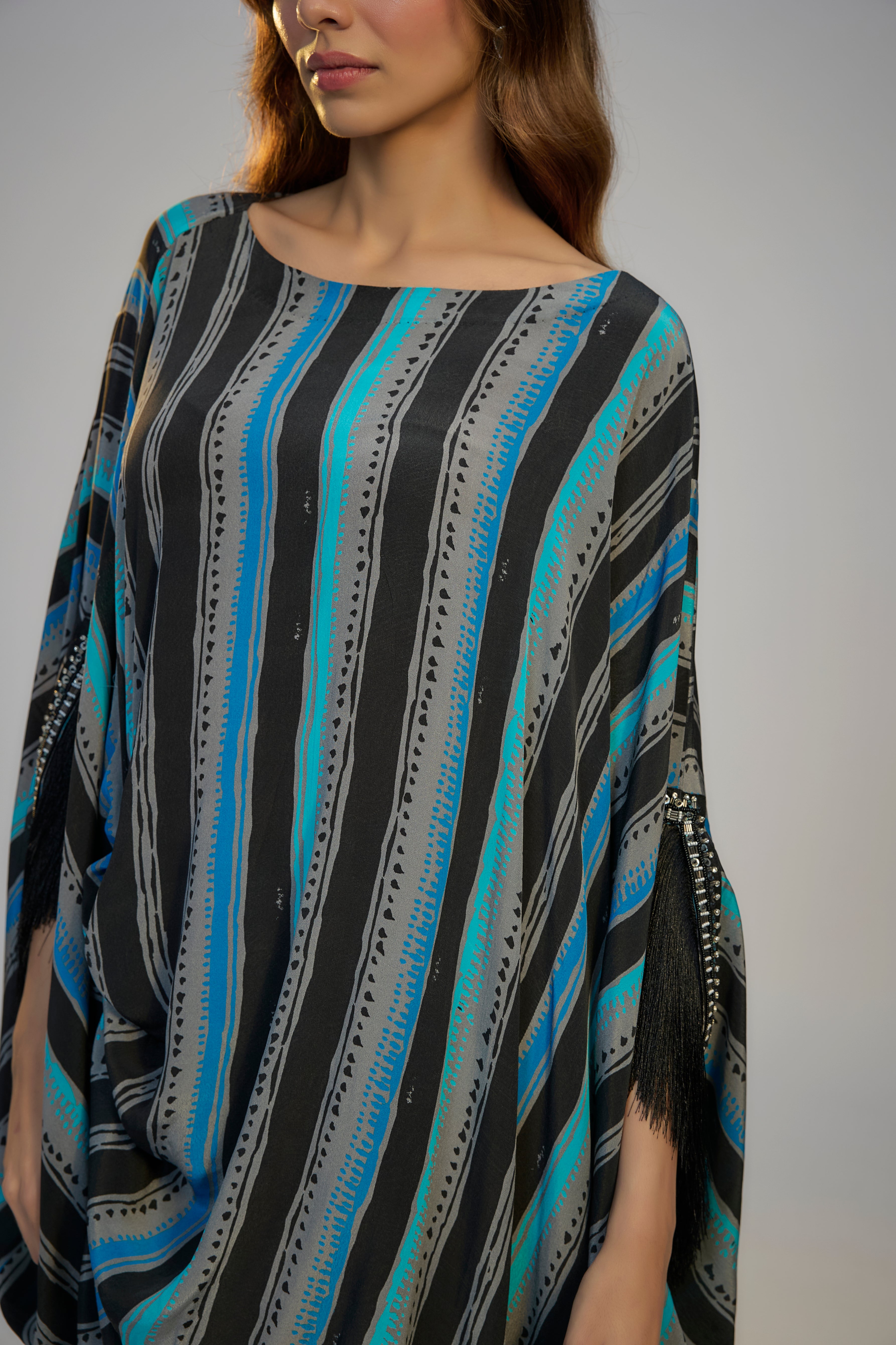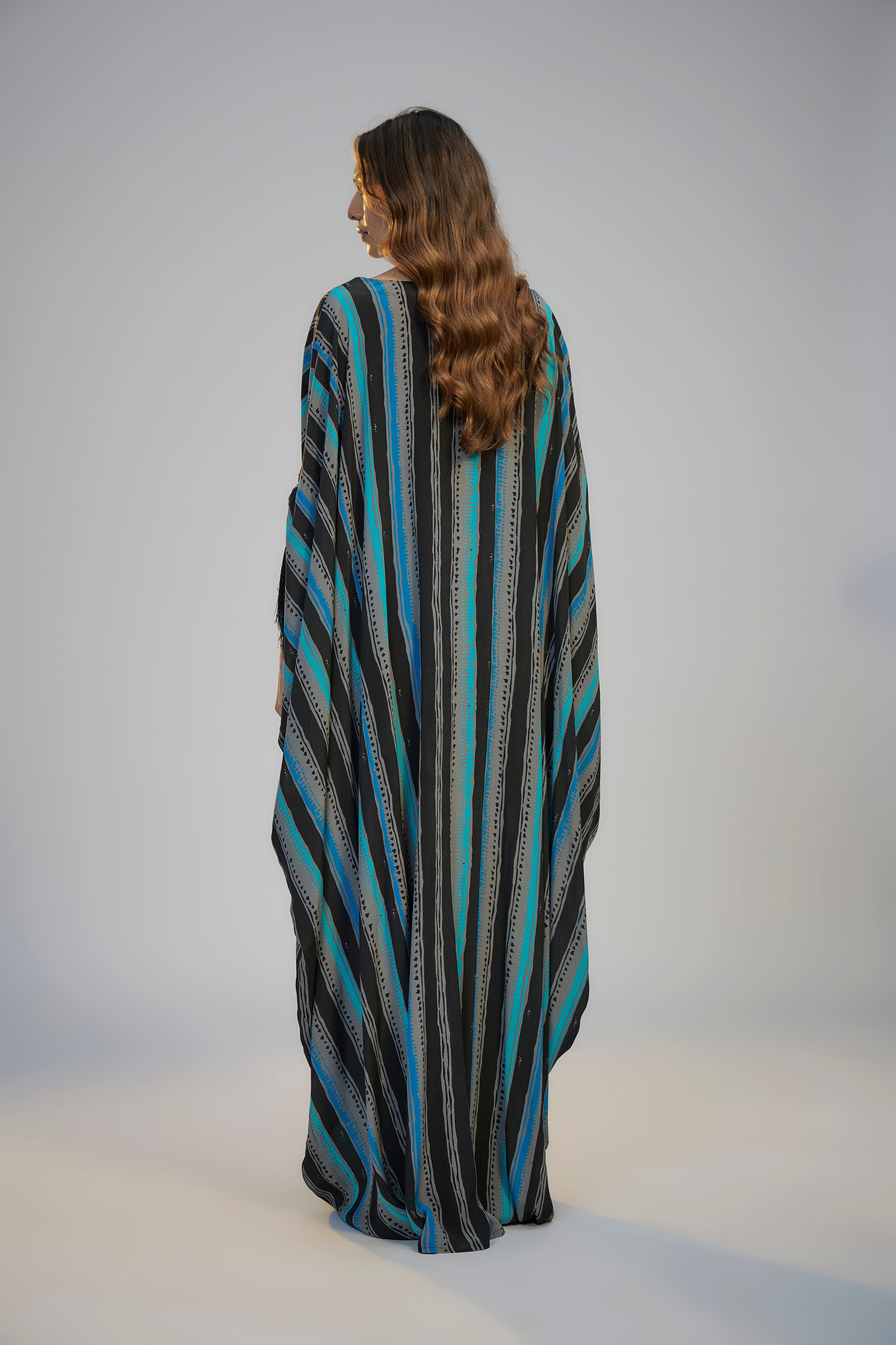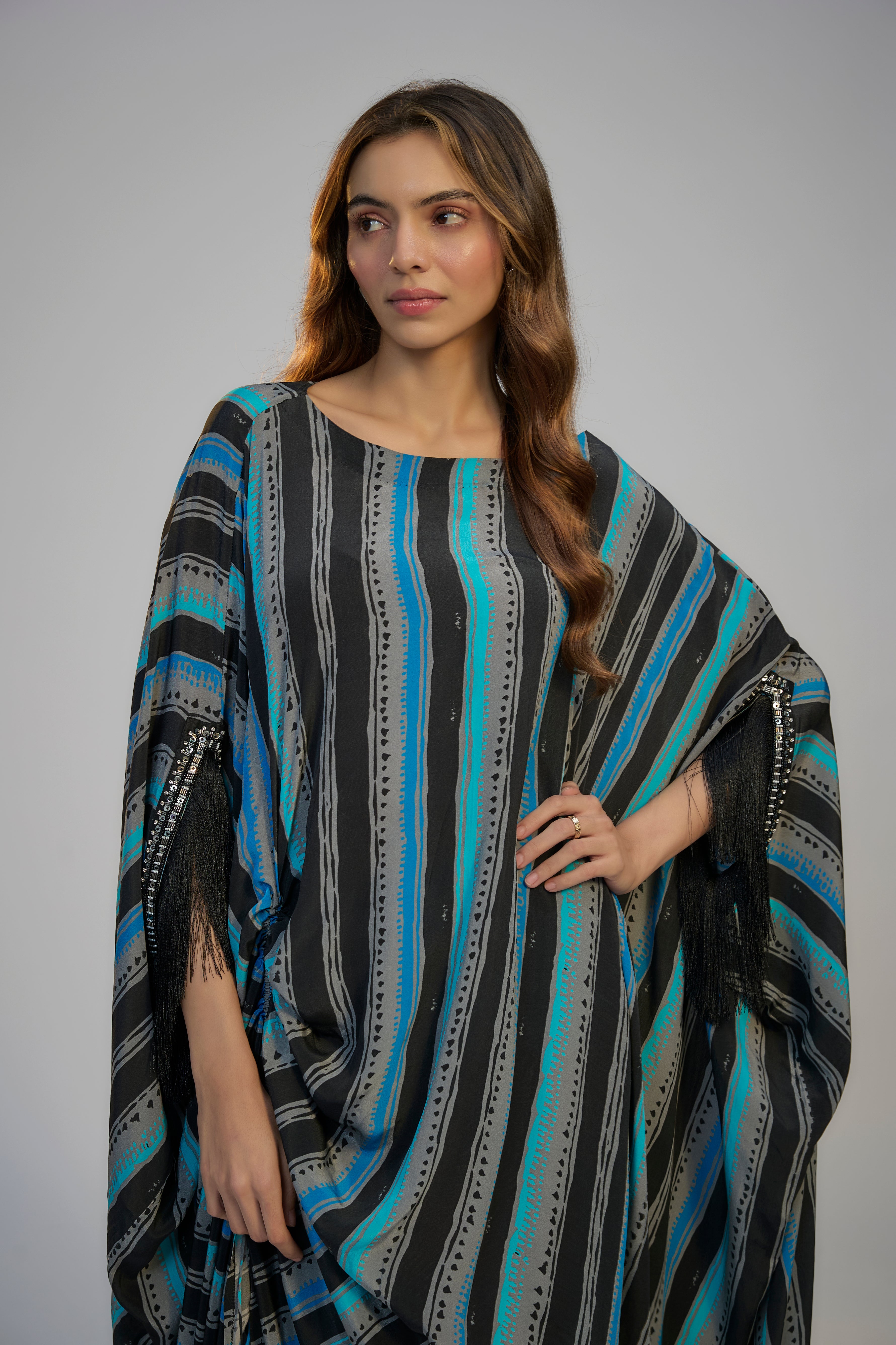 Black- Blue Stripes Printed and Embroidered Kaftan