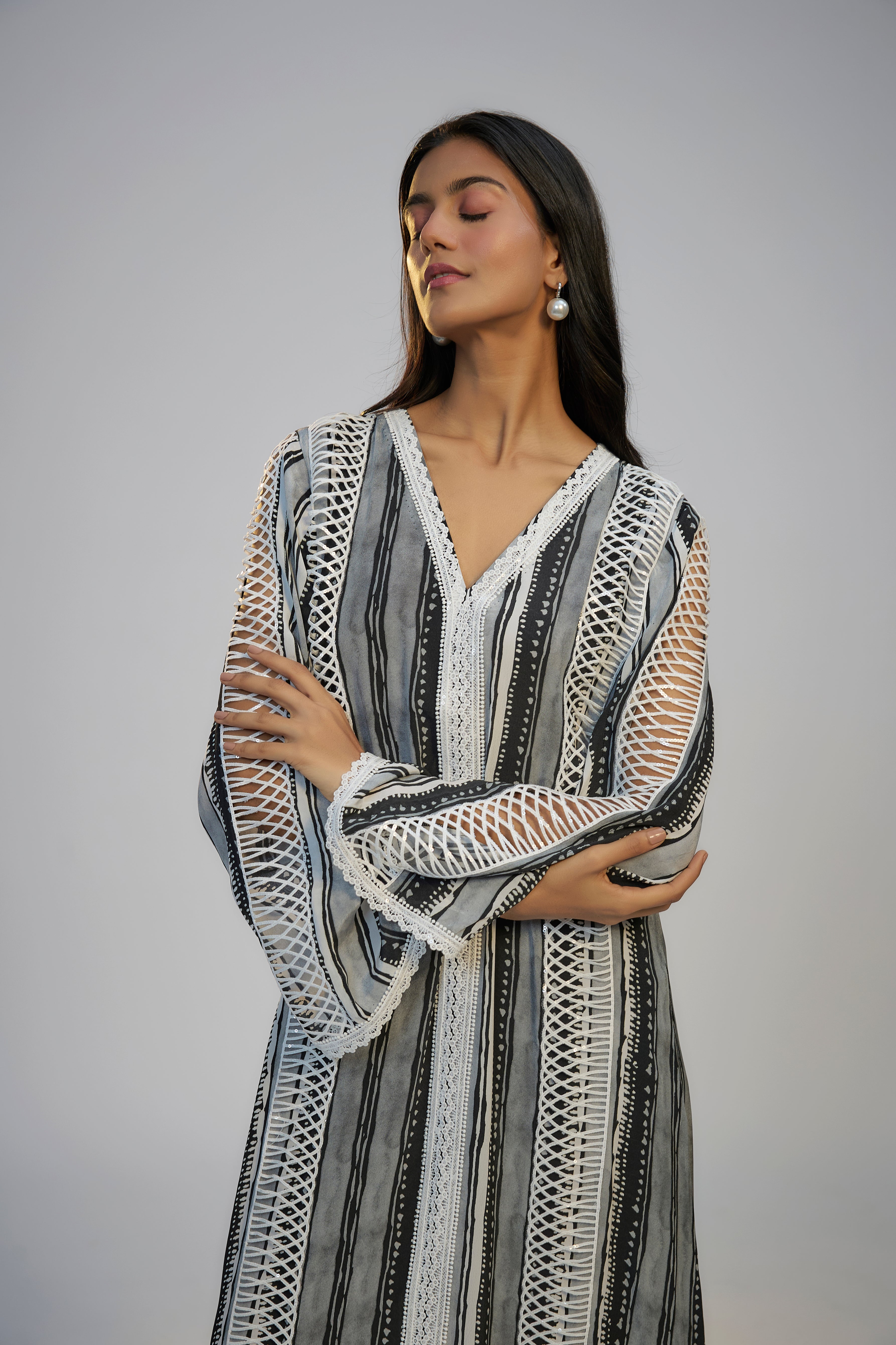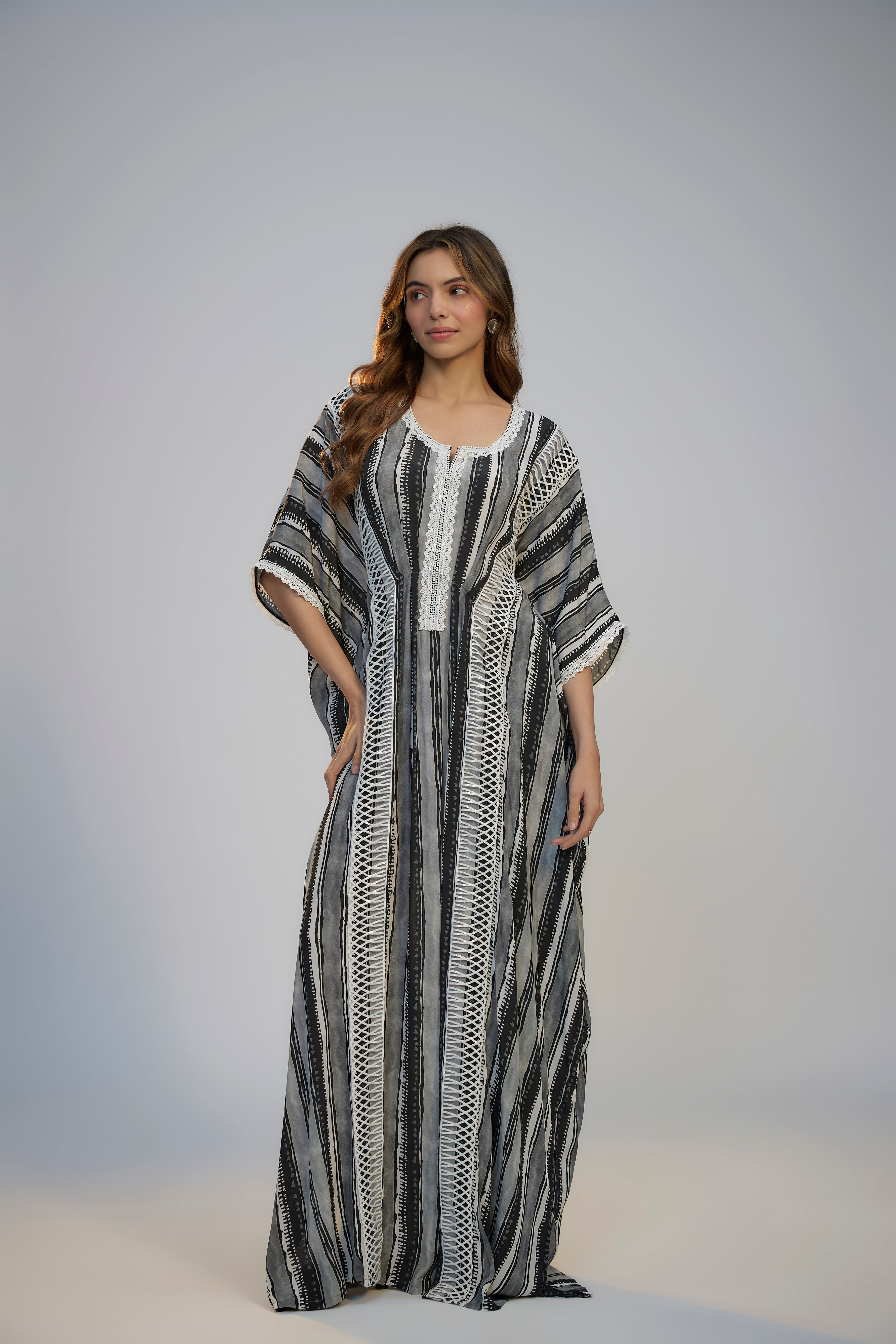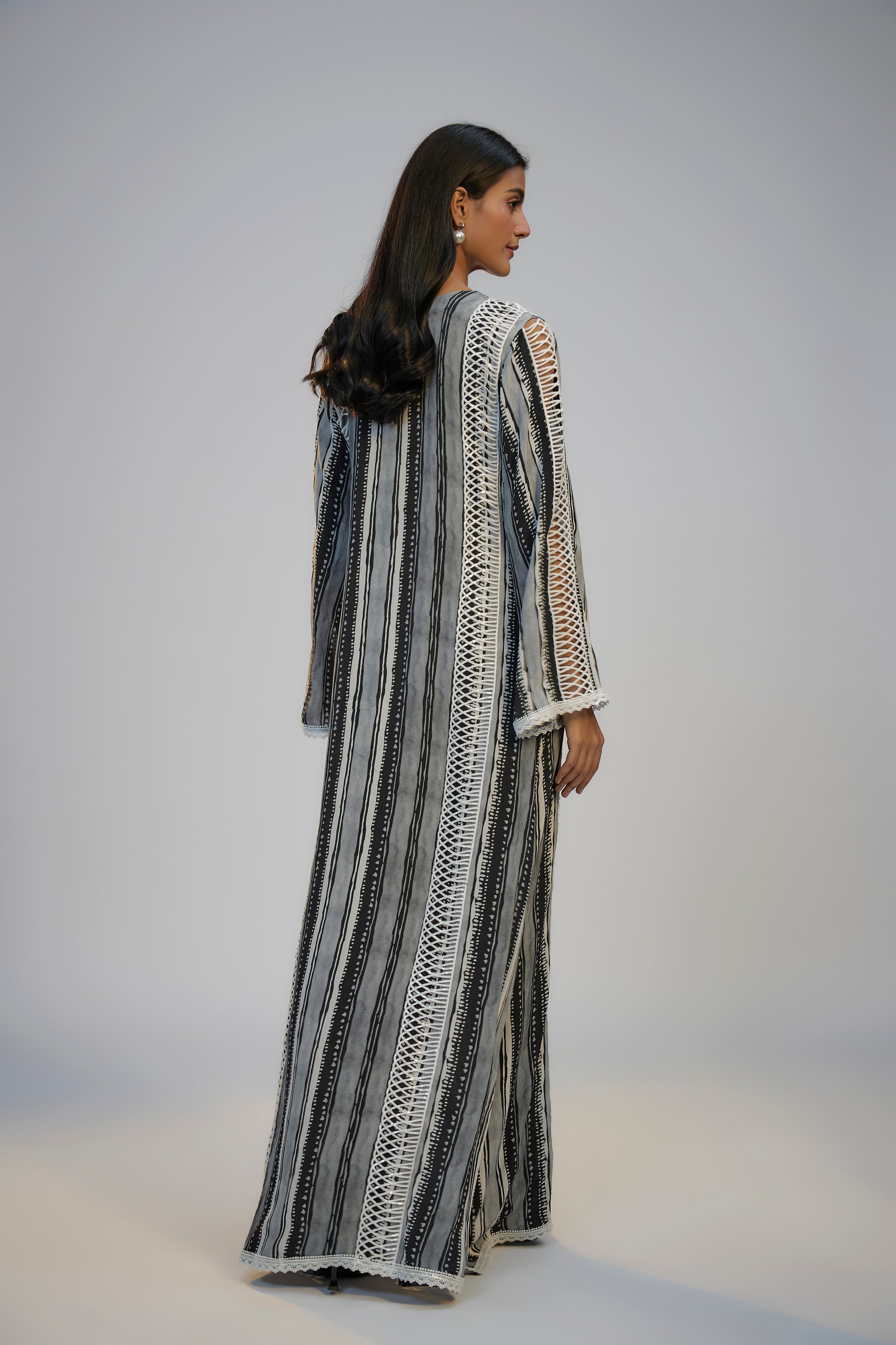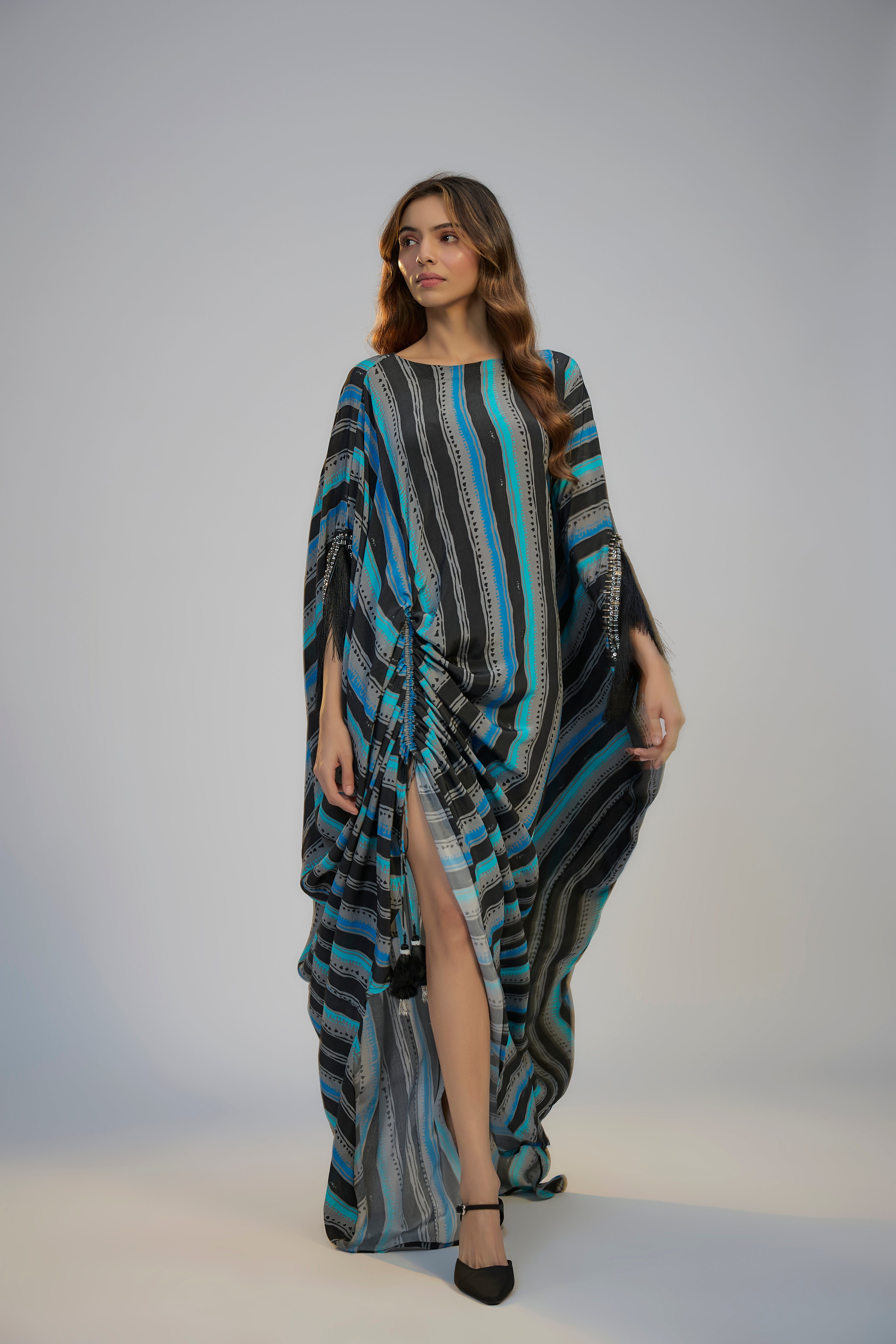 Black- Blue Stripes Printed and Embroidered Kaftan