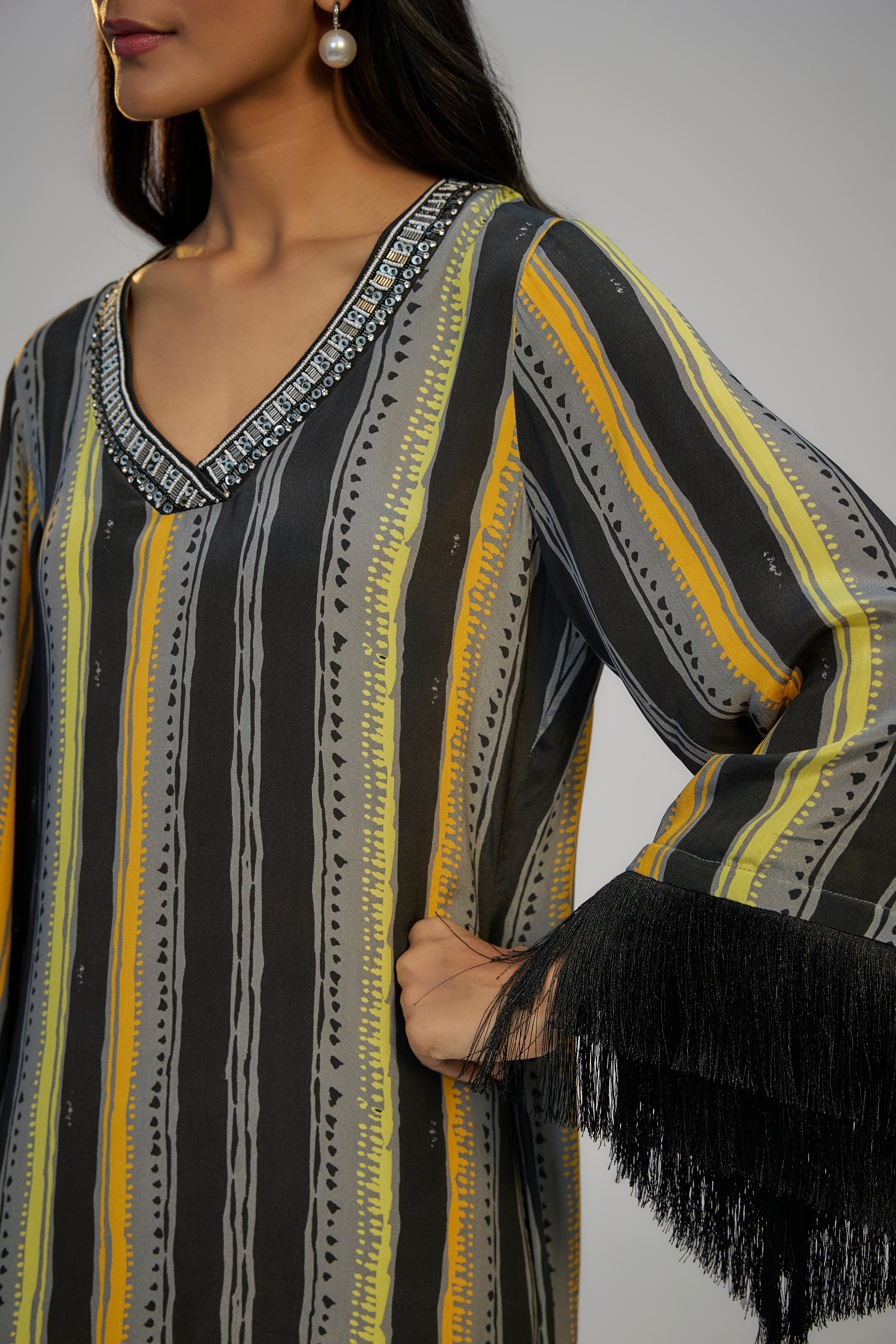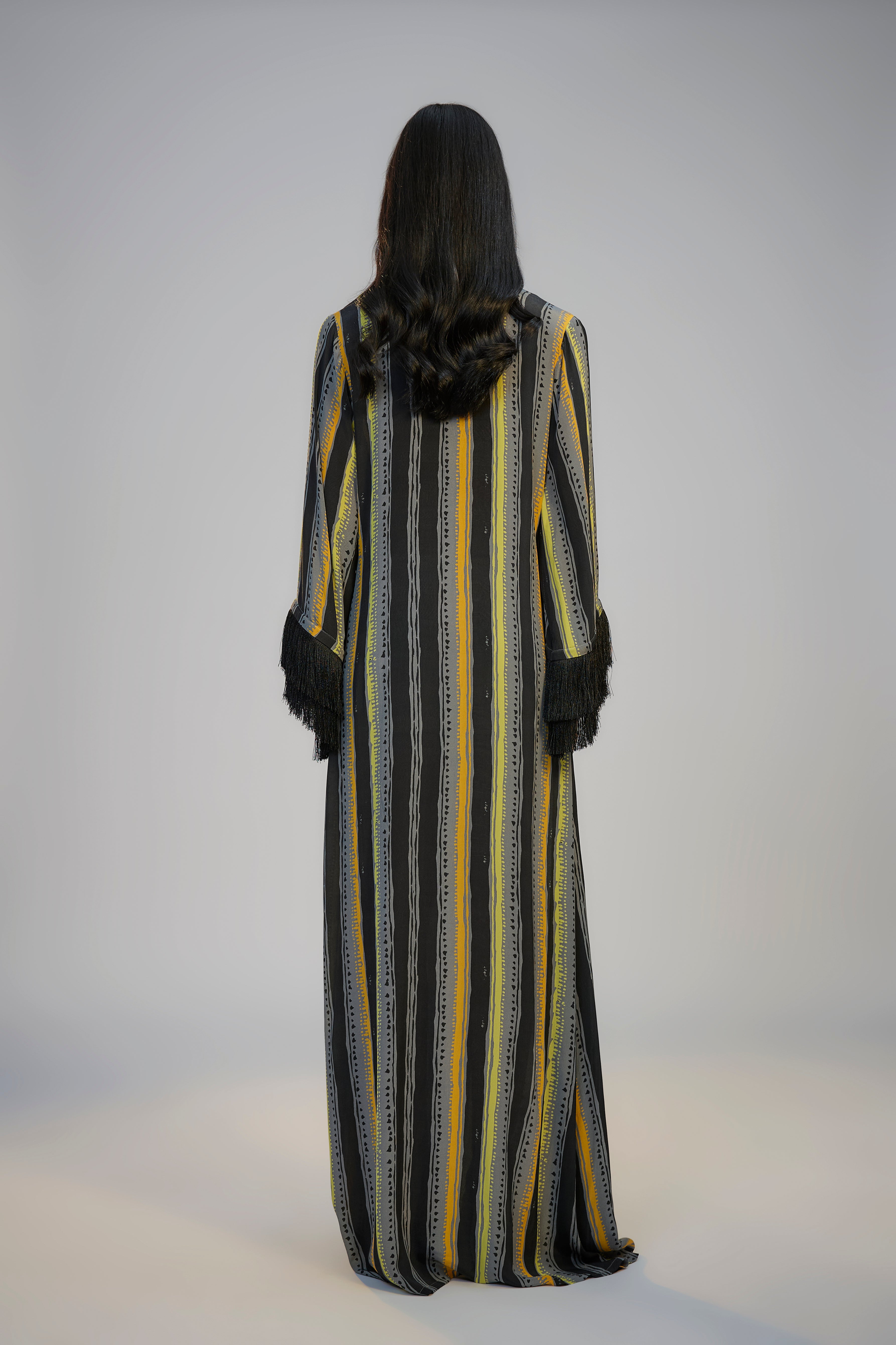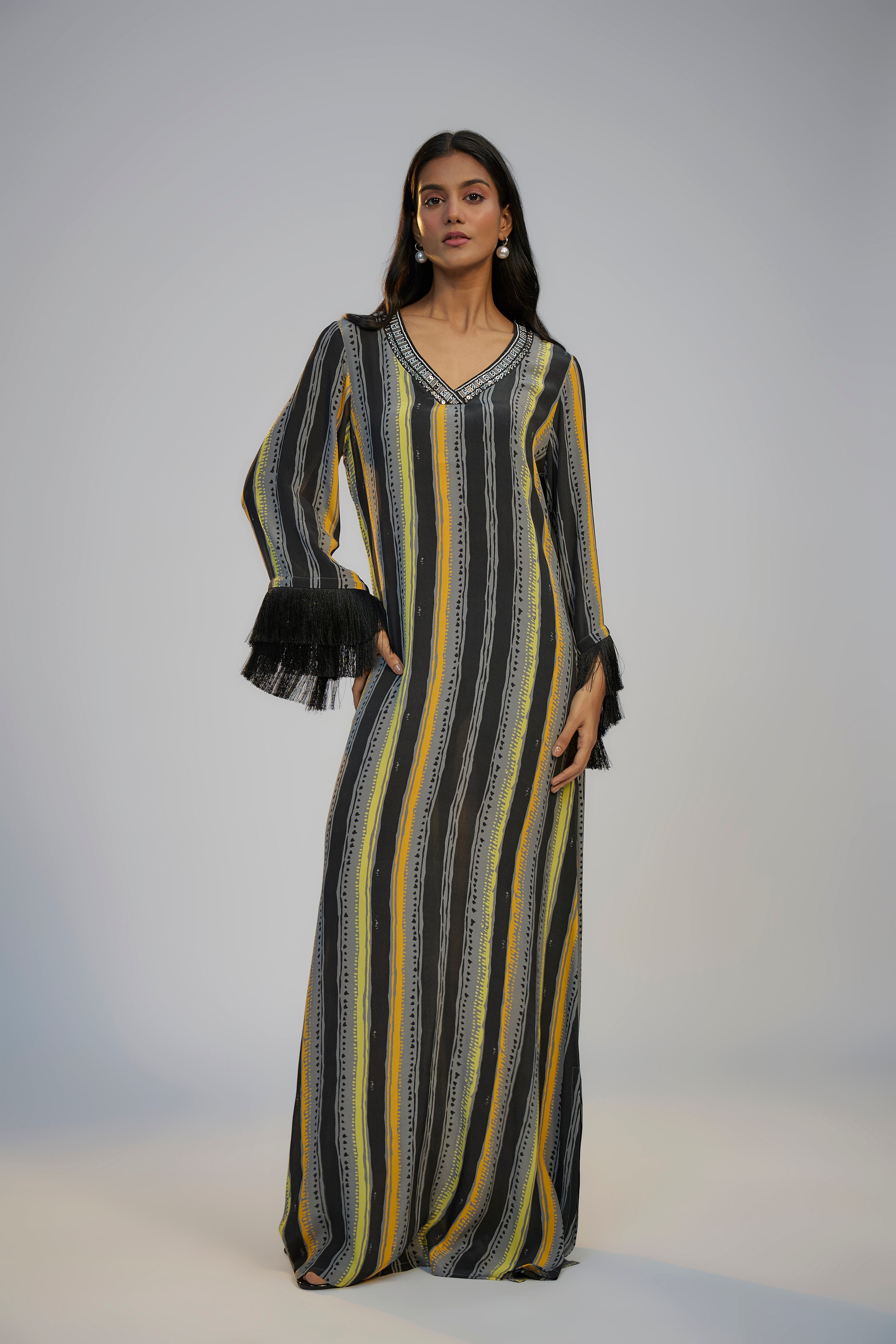 Black Yellow Stripes Printed and Embroidered Kaftan Dress