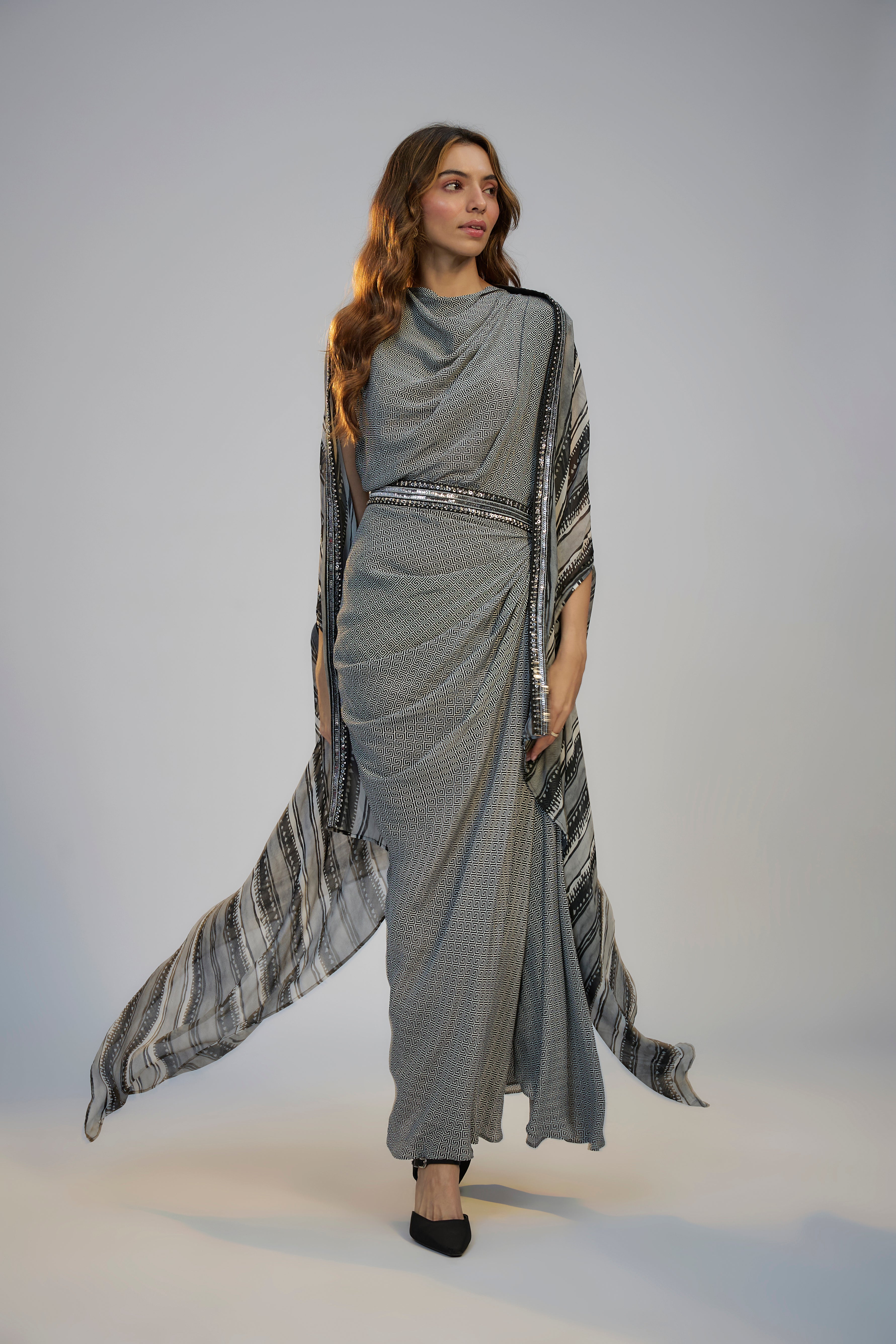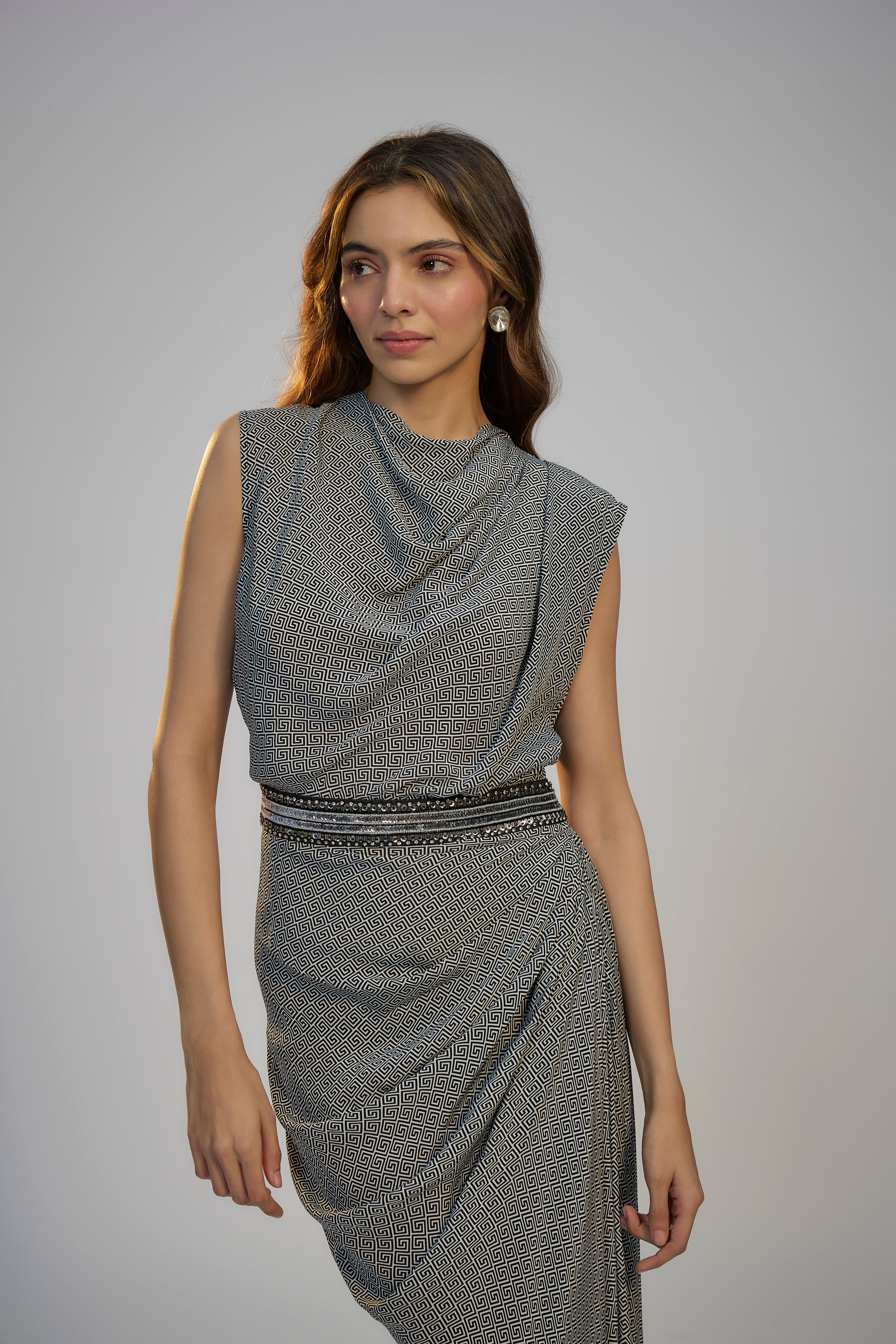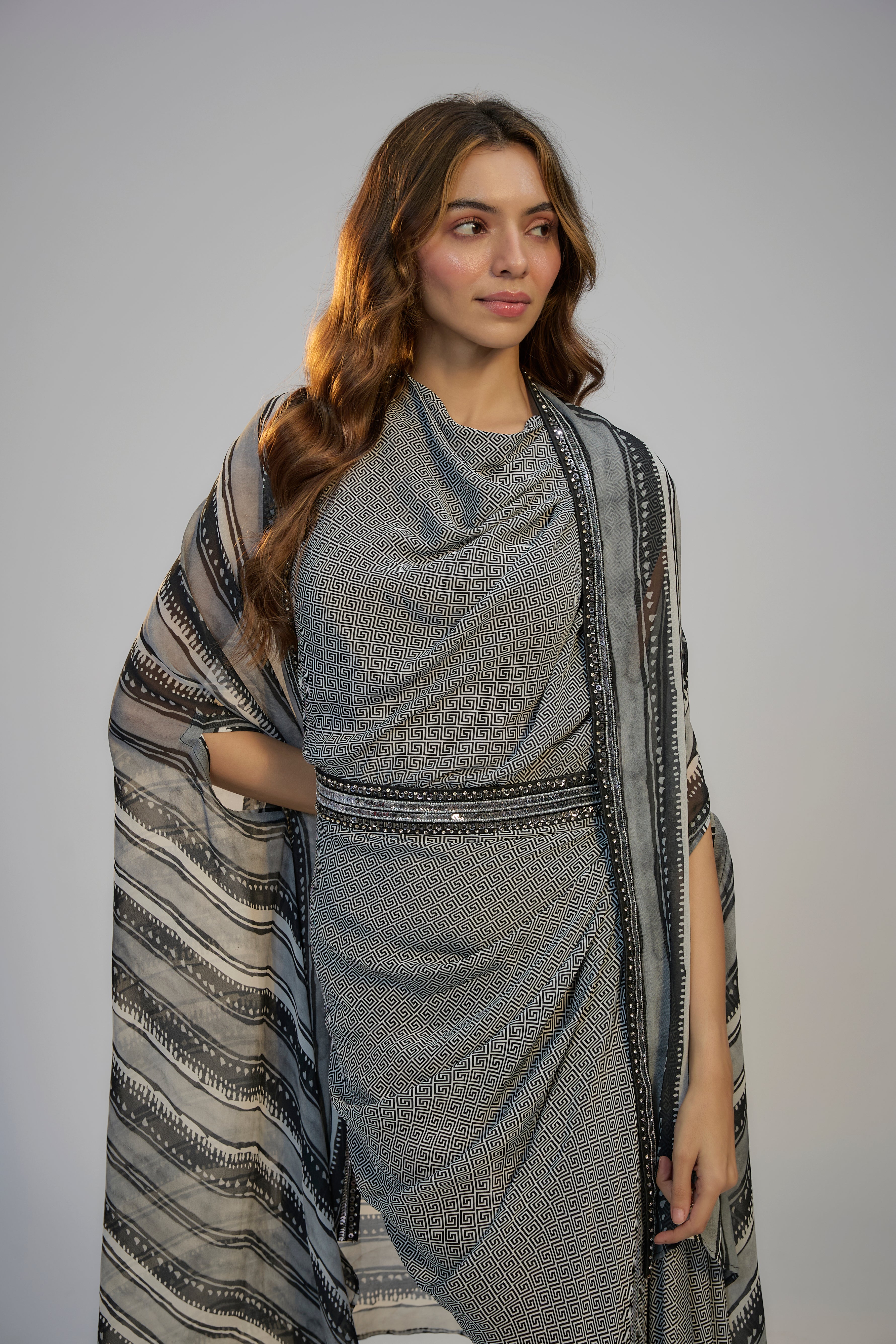 Shairee Black Crepe Digital Printed Pre-Draped Skirt Set