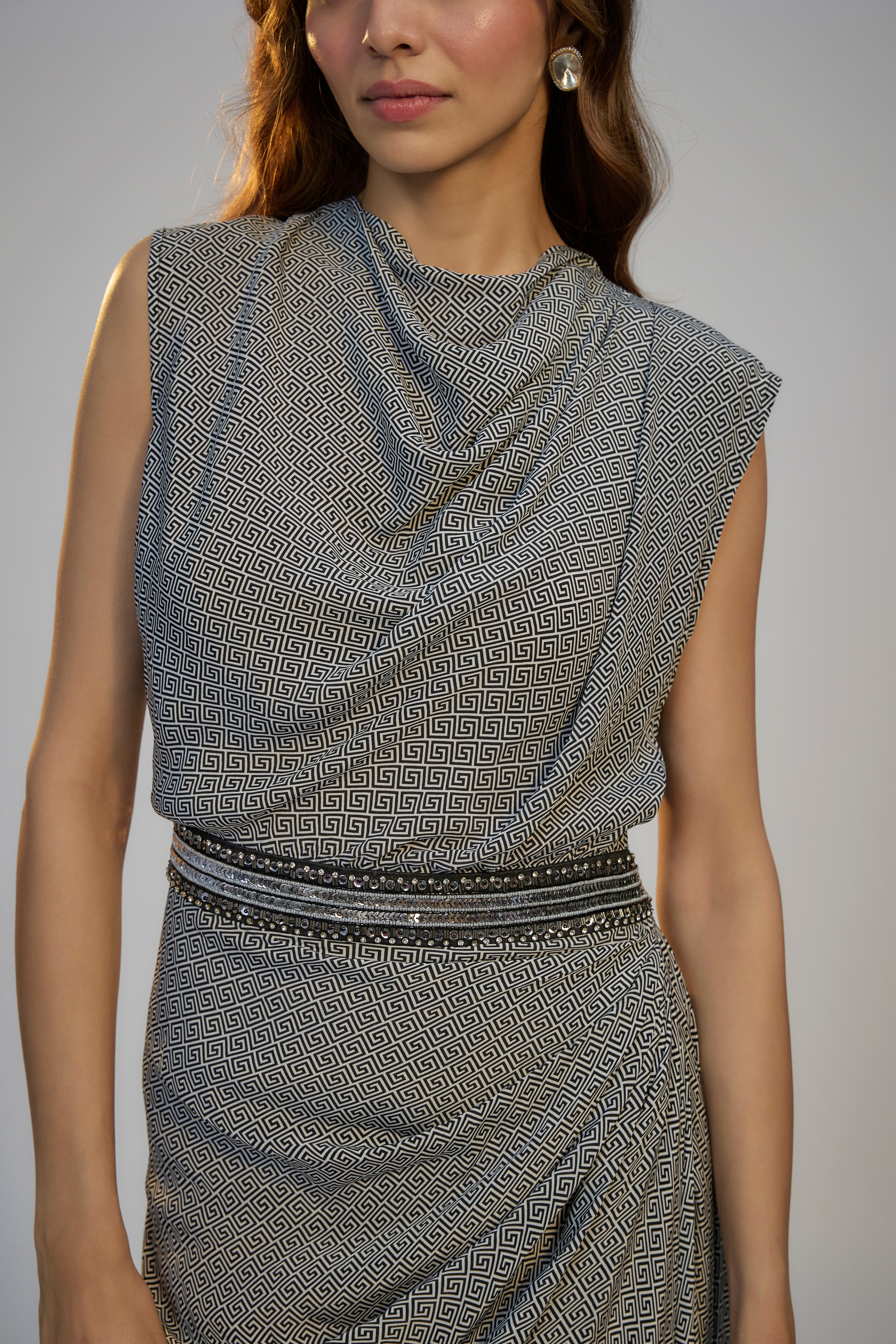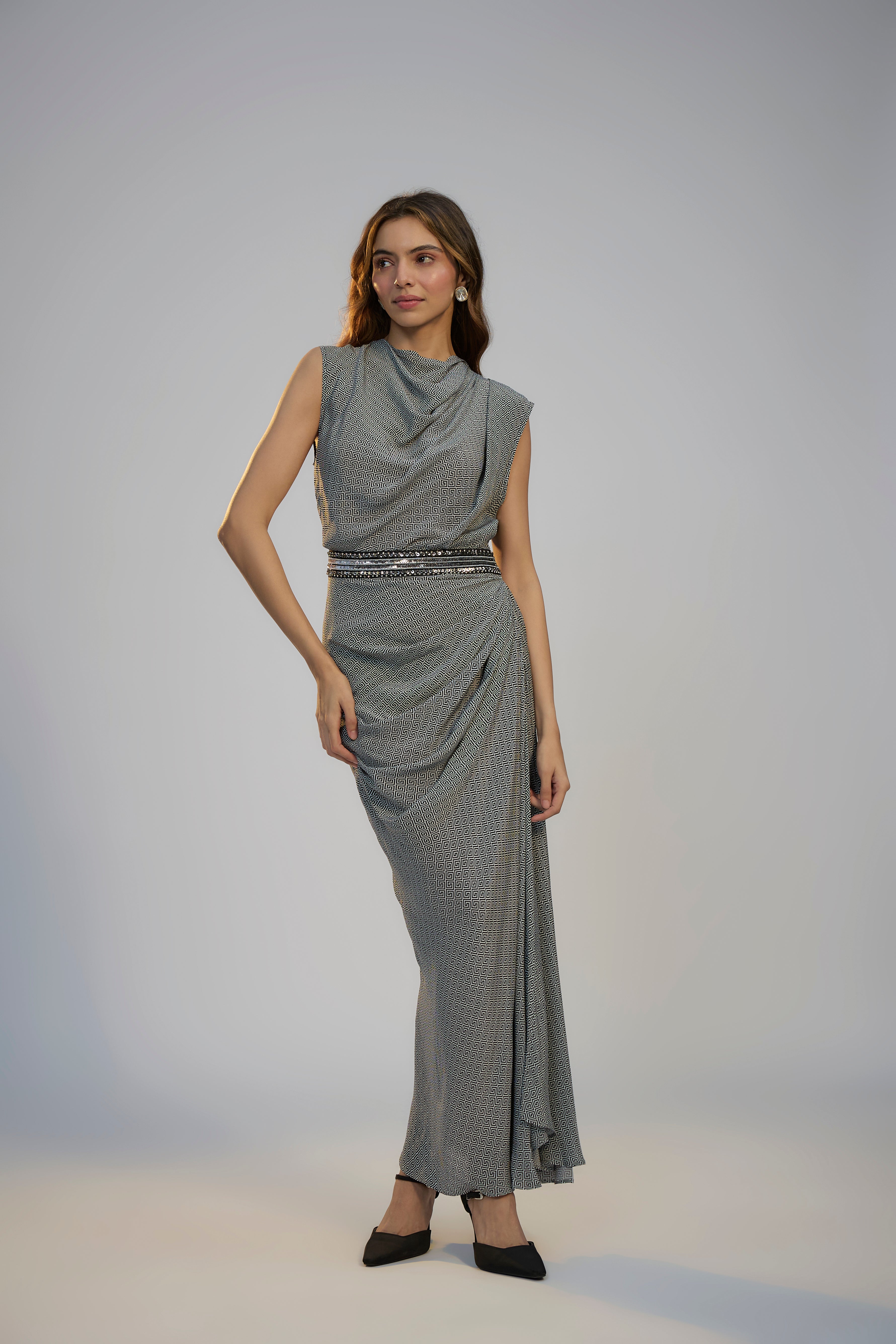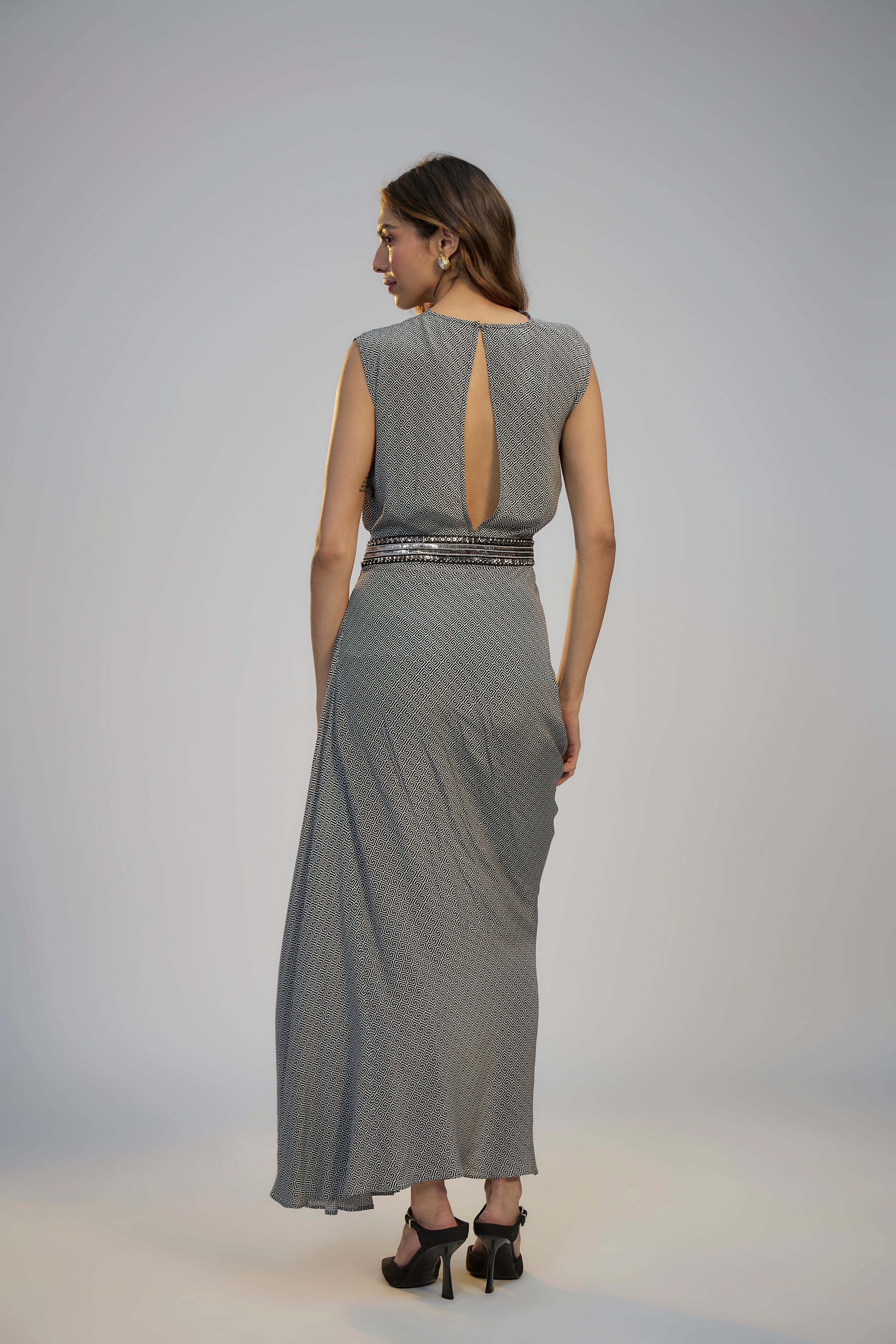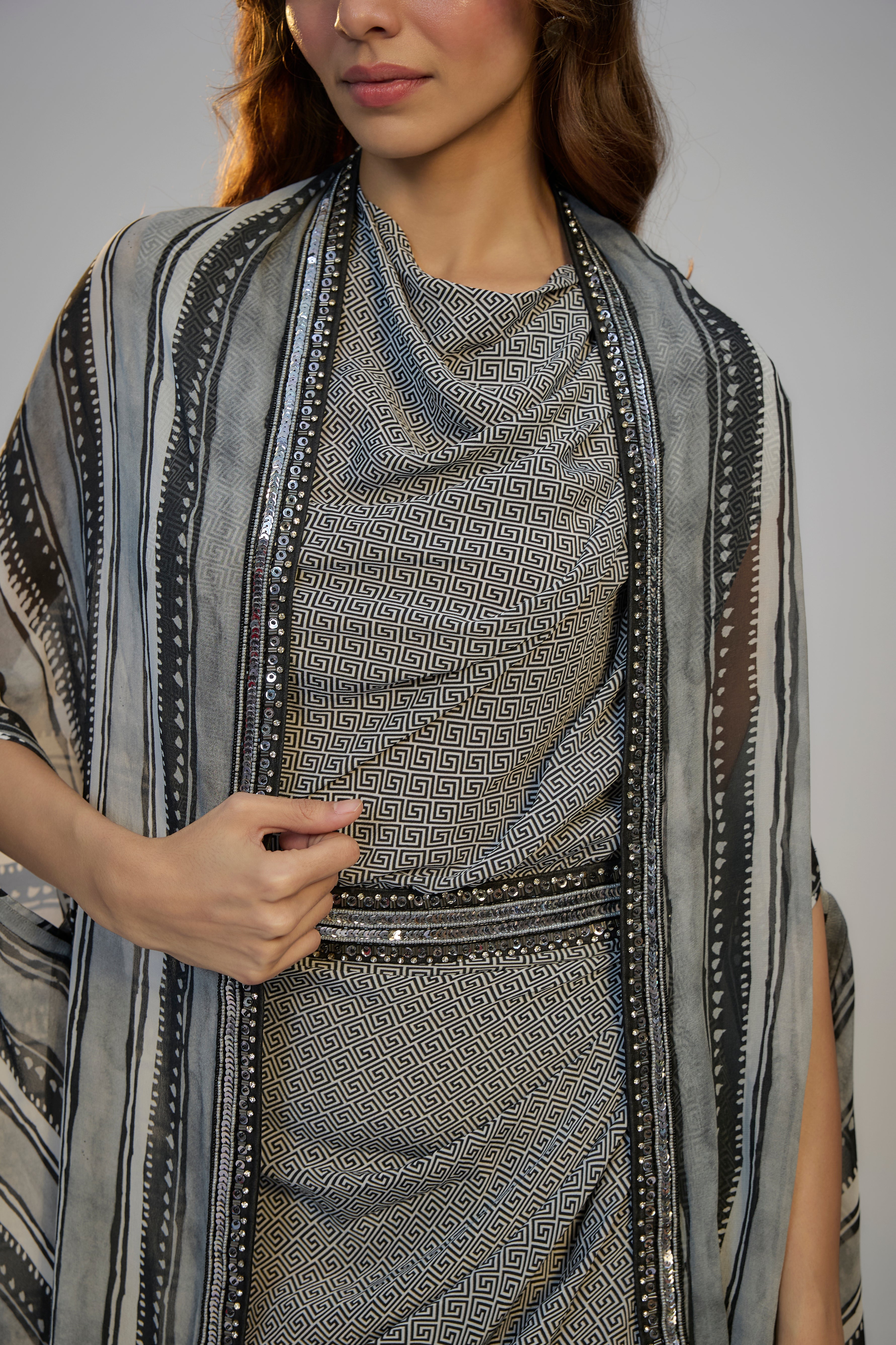 Shairee Black Crepe Digital Printed Pre-Draped Skirt Set