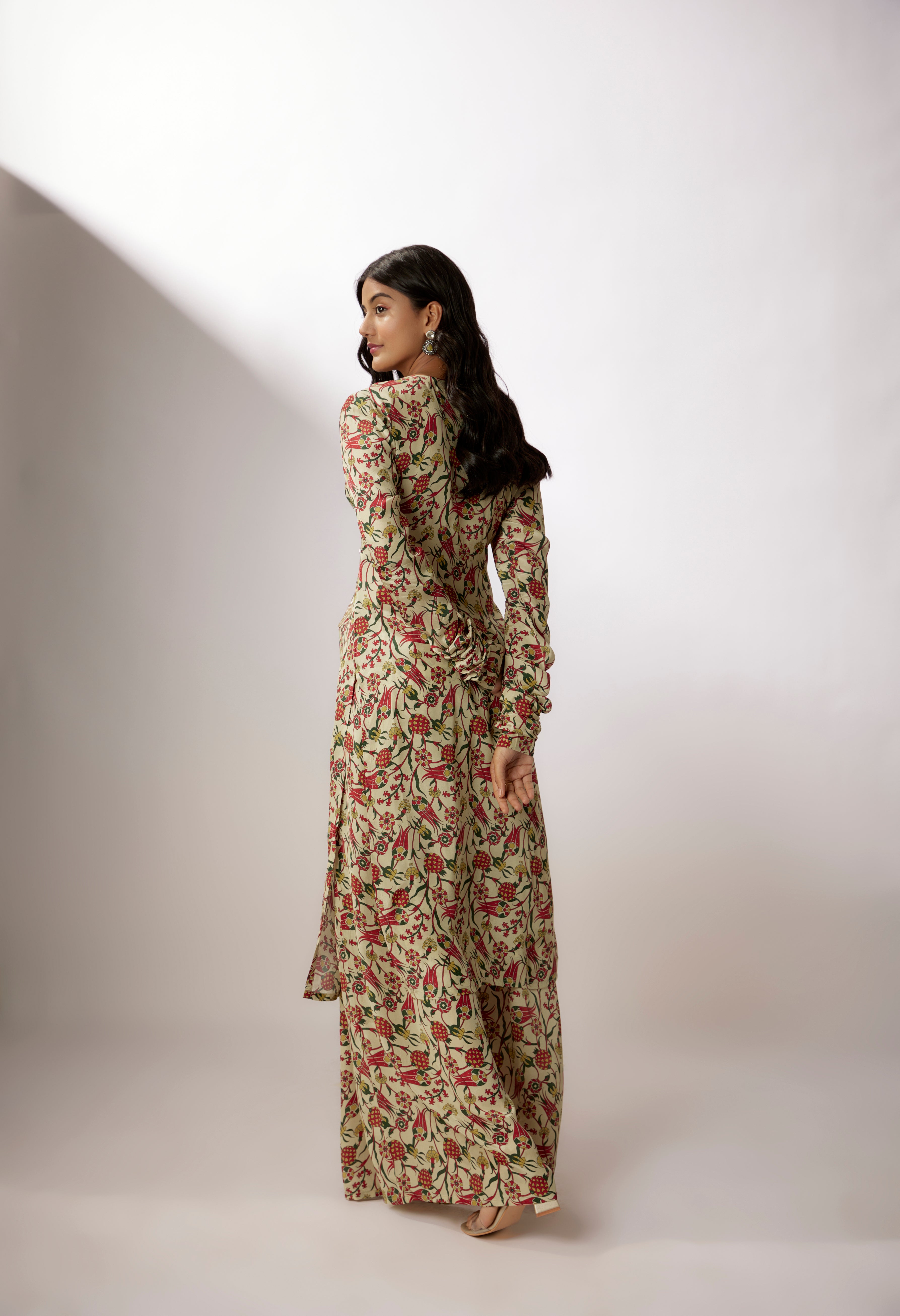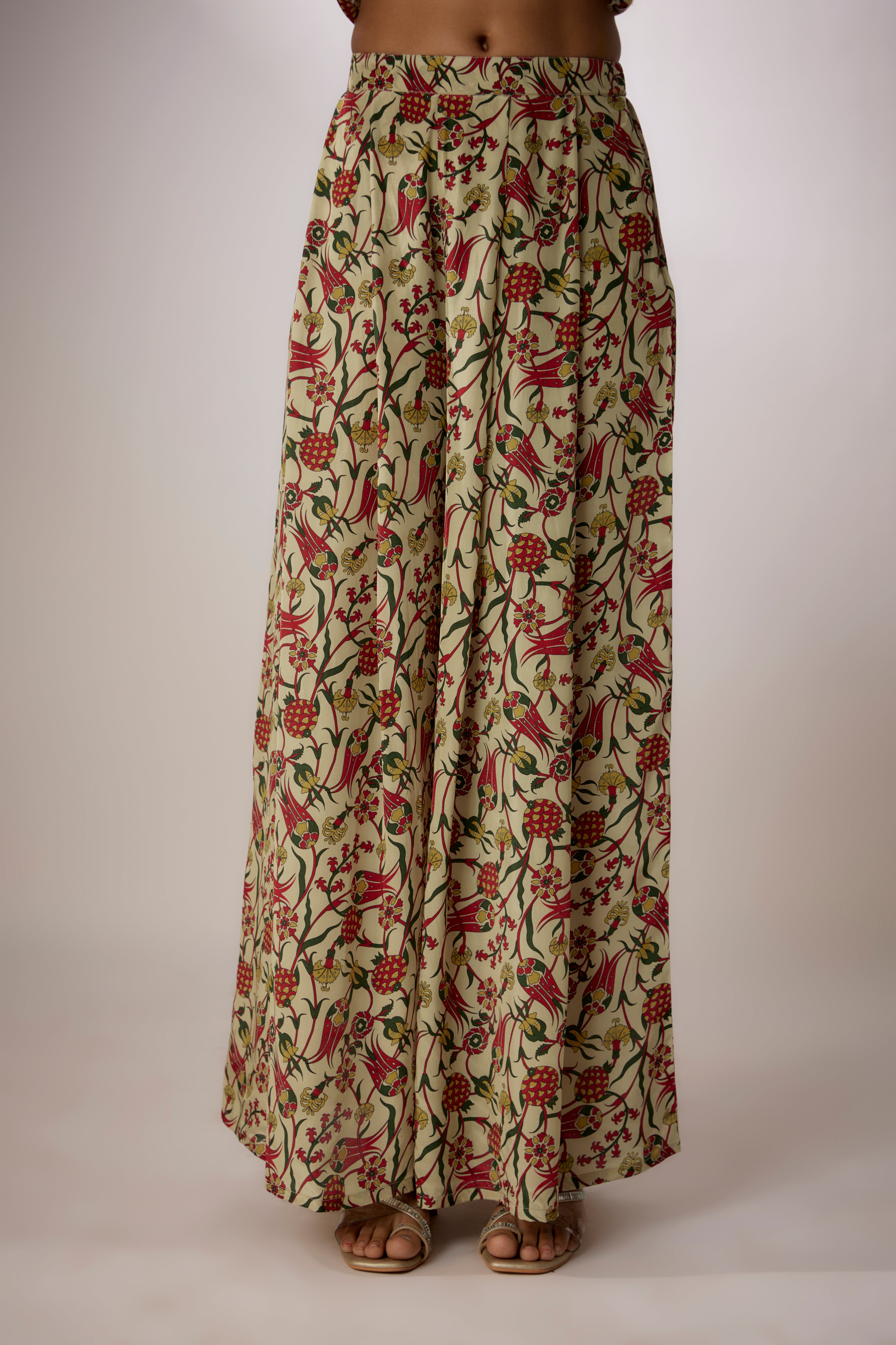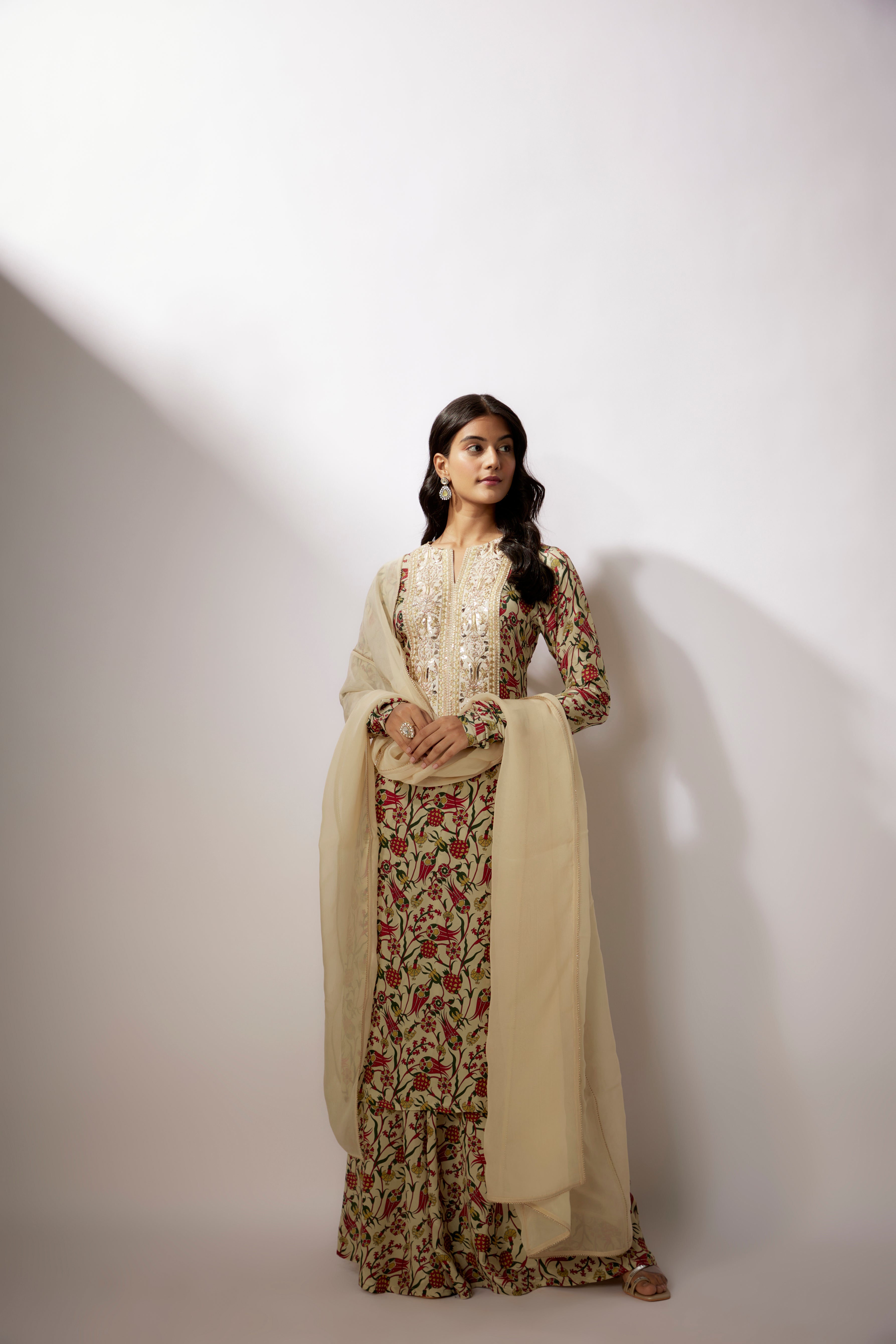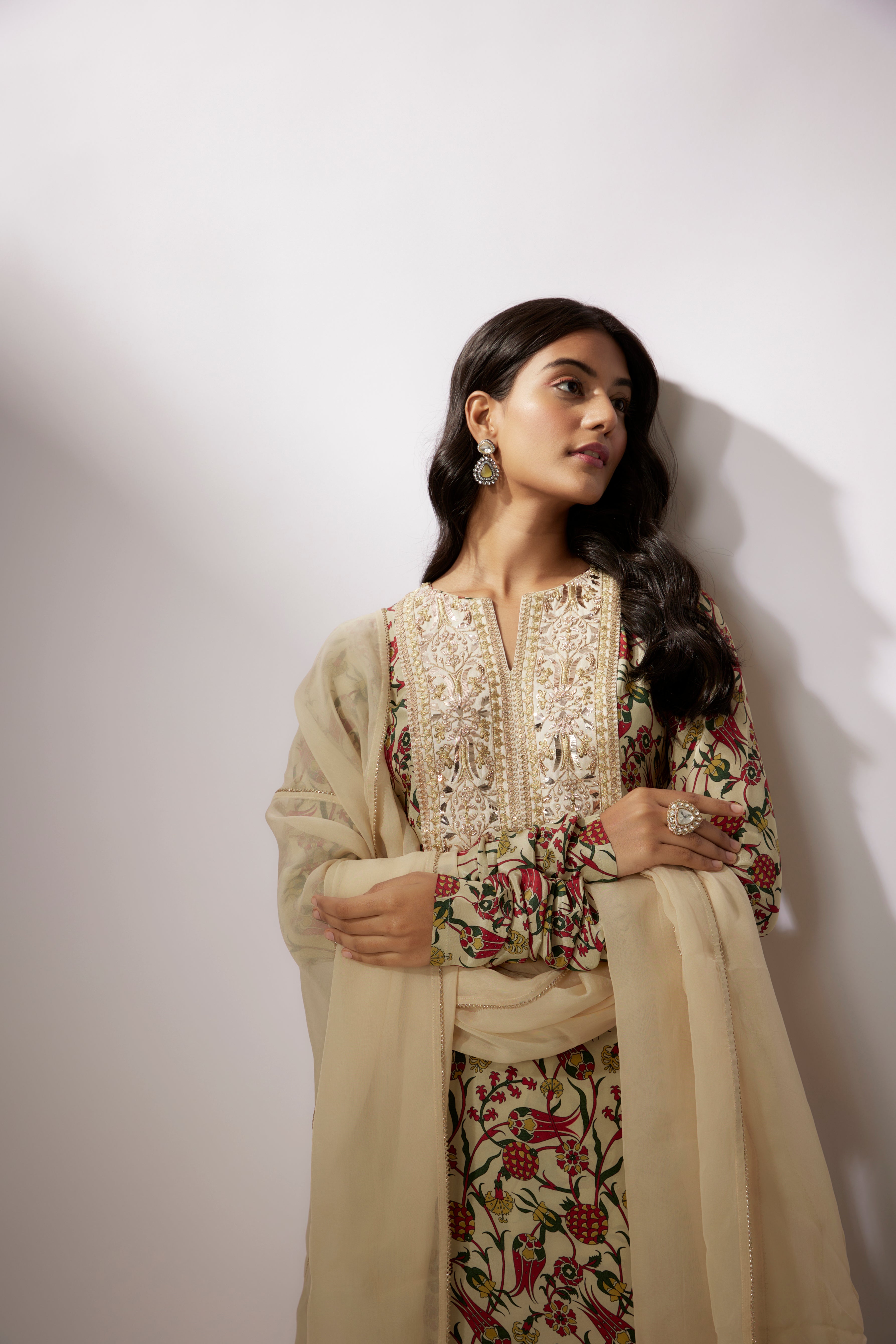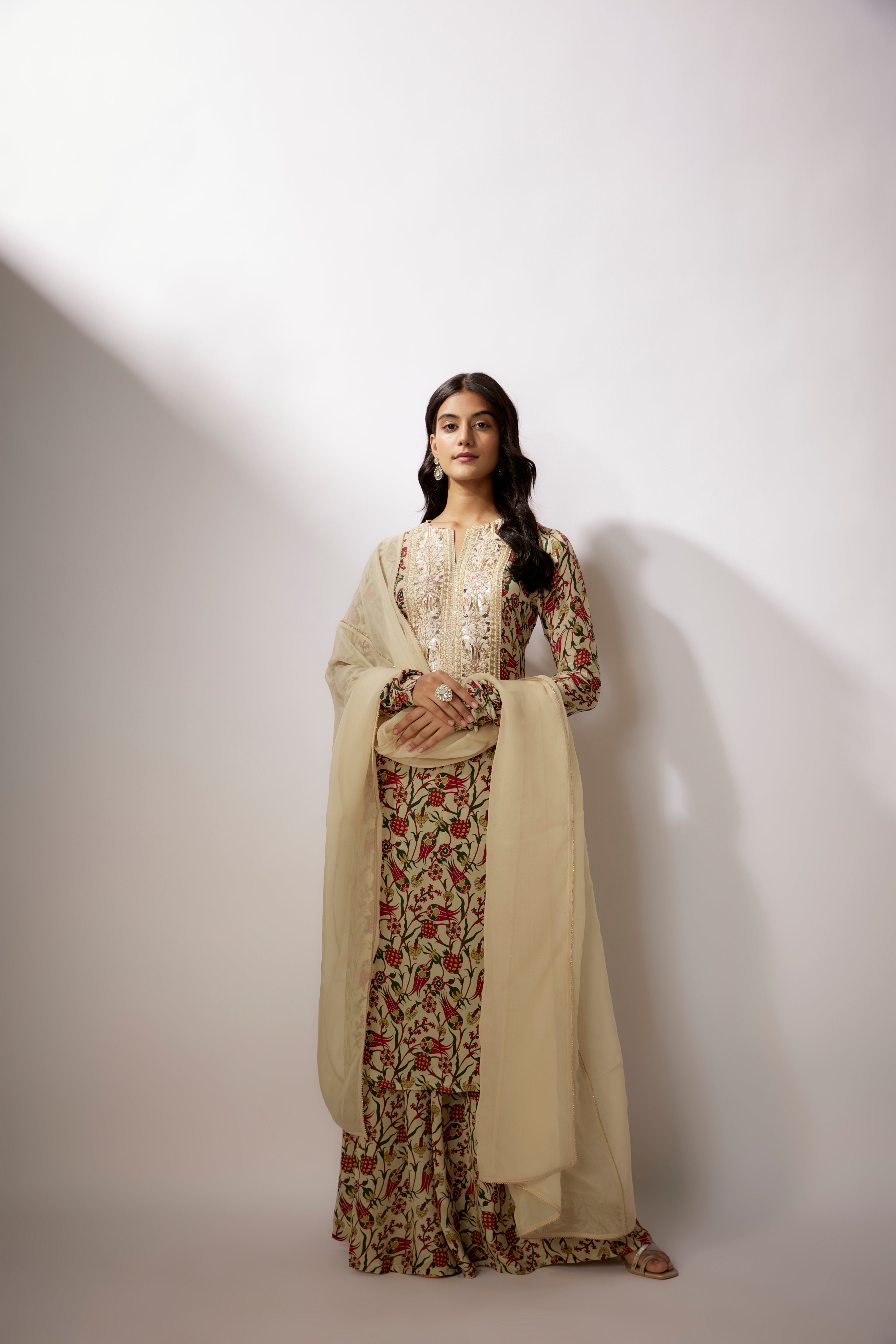 Featuring a beige printed kurta & pallazzo set in crepe fabric with zardosi and marodi work embroidery on the yoke. Comes with dupatta in organza with lace edging.