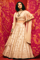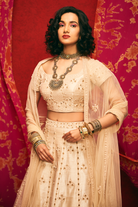 Beige raw silk lehenga set with tulle dupatta and cutwork corners.
