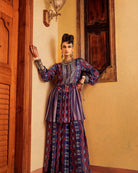 Featuring a blue printed peplum top in mal base with embroidery and tassel details. It is paired with matching printed pallazzos.