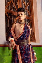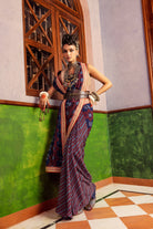 Featuring a blue printed saree in georgette base with embroiderey. It is paired with a embroidered blouse in silk base.