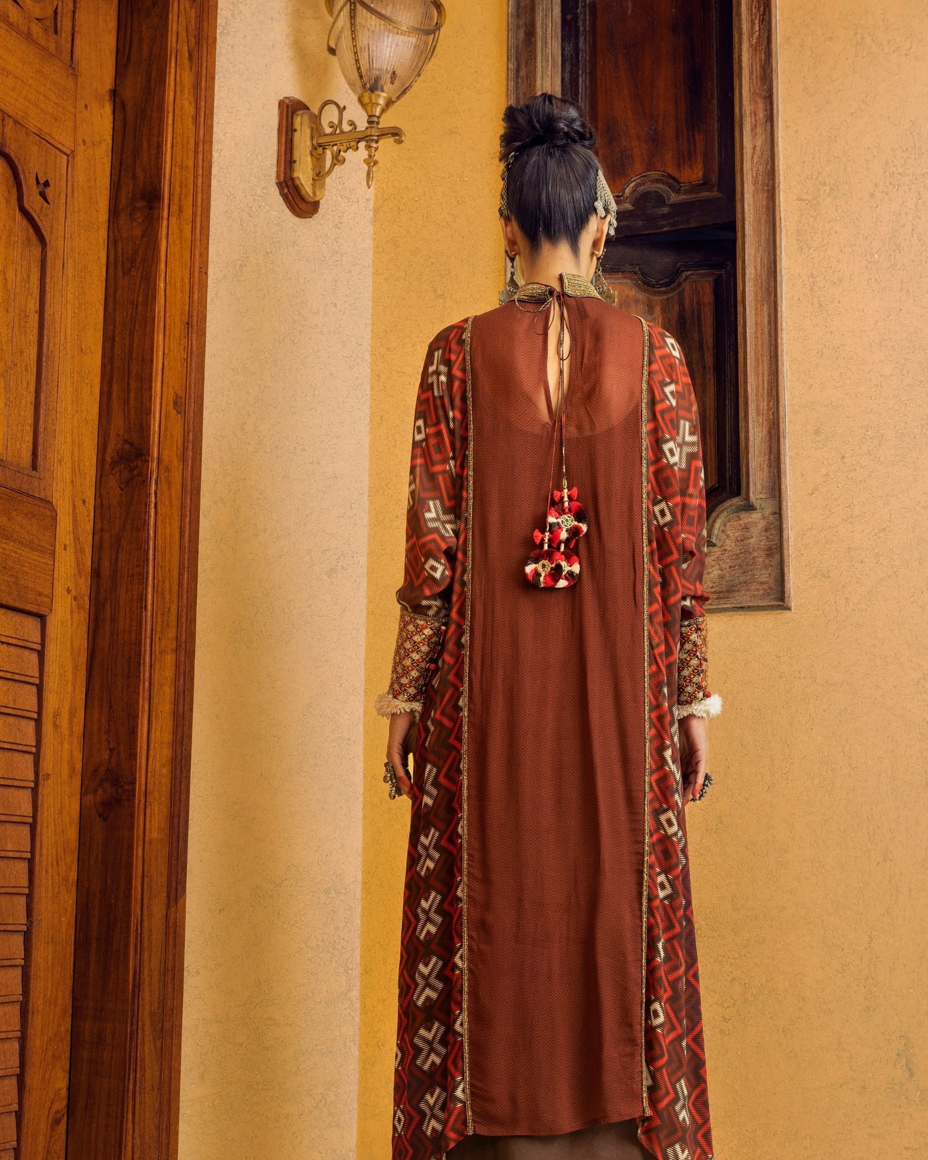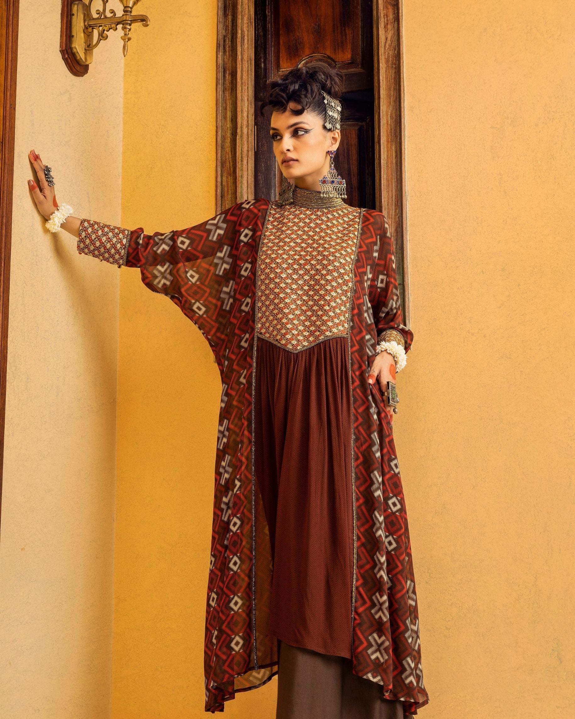 Featuring a brown printed and embroidered dress in georgette base. Bottoms shown are not a part of the set.