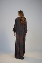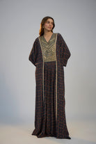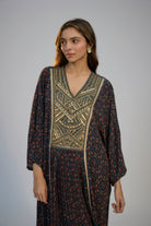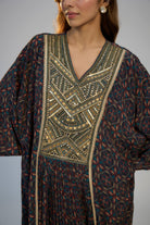 Featuring a dark blue base with multi-color print kaftan dress in crepe with sequins embroidery yoke and gota details.
