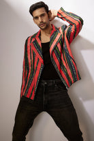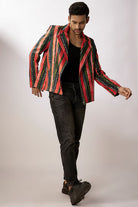 Featuring a dark blue and red jacket in dupion silk base with digital stripes print. Perfect wear for an evening party.