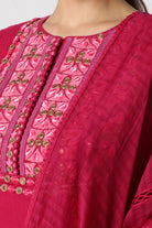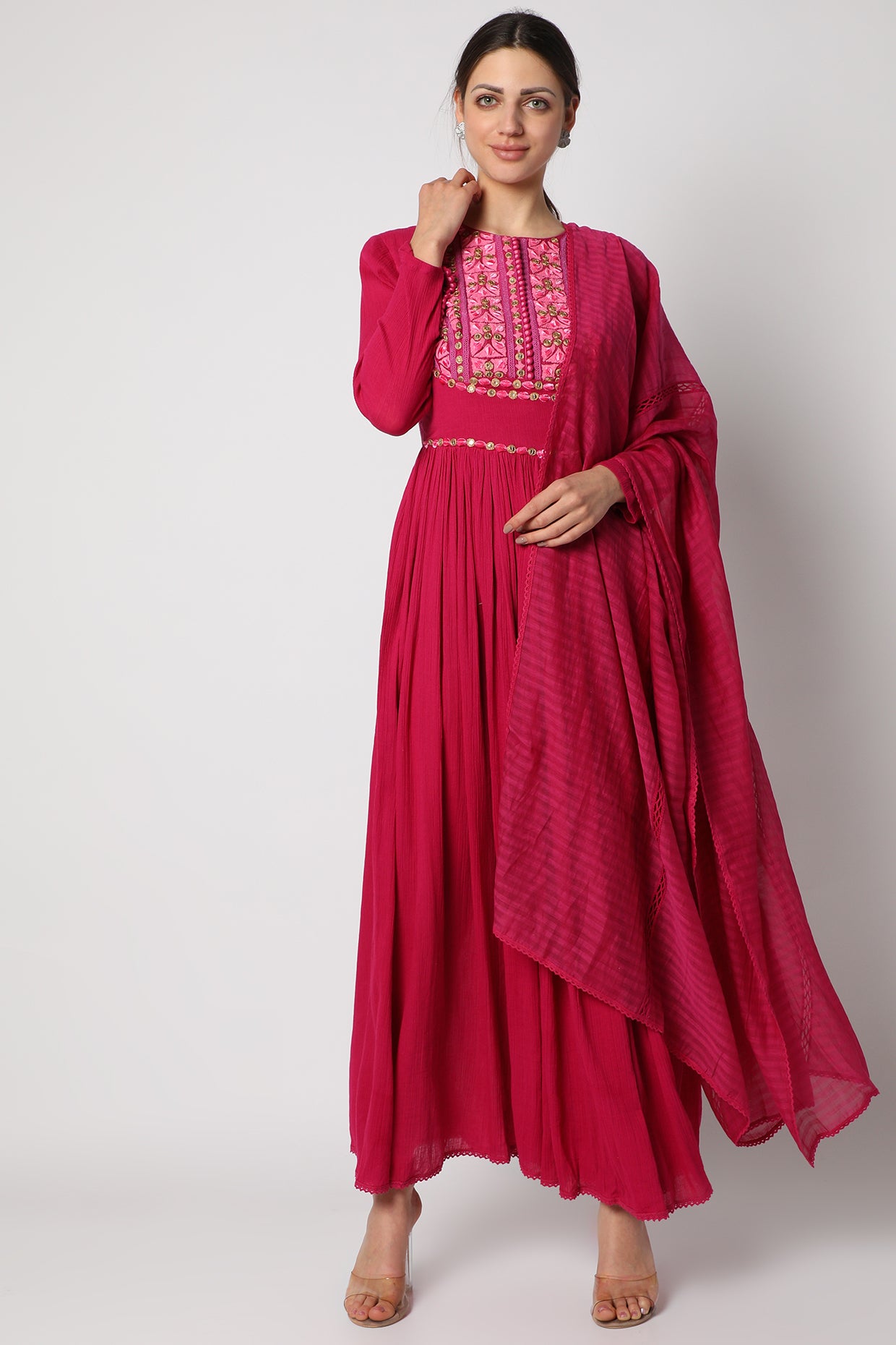 Magenta Anarkali dress in chanderi & crush cotton fabrics with hand jali work,sequins & dori embroidery and velvet techniques. Comes with matching dupatta.