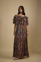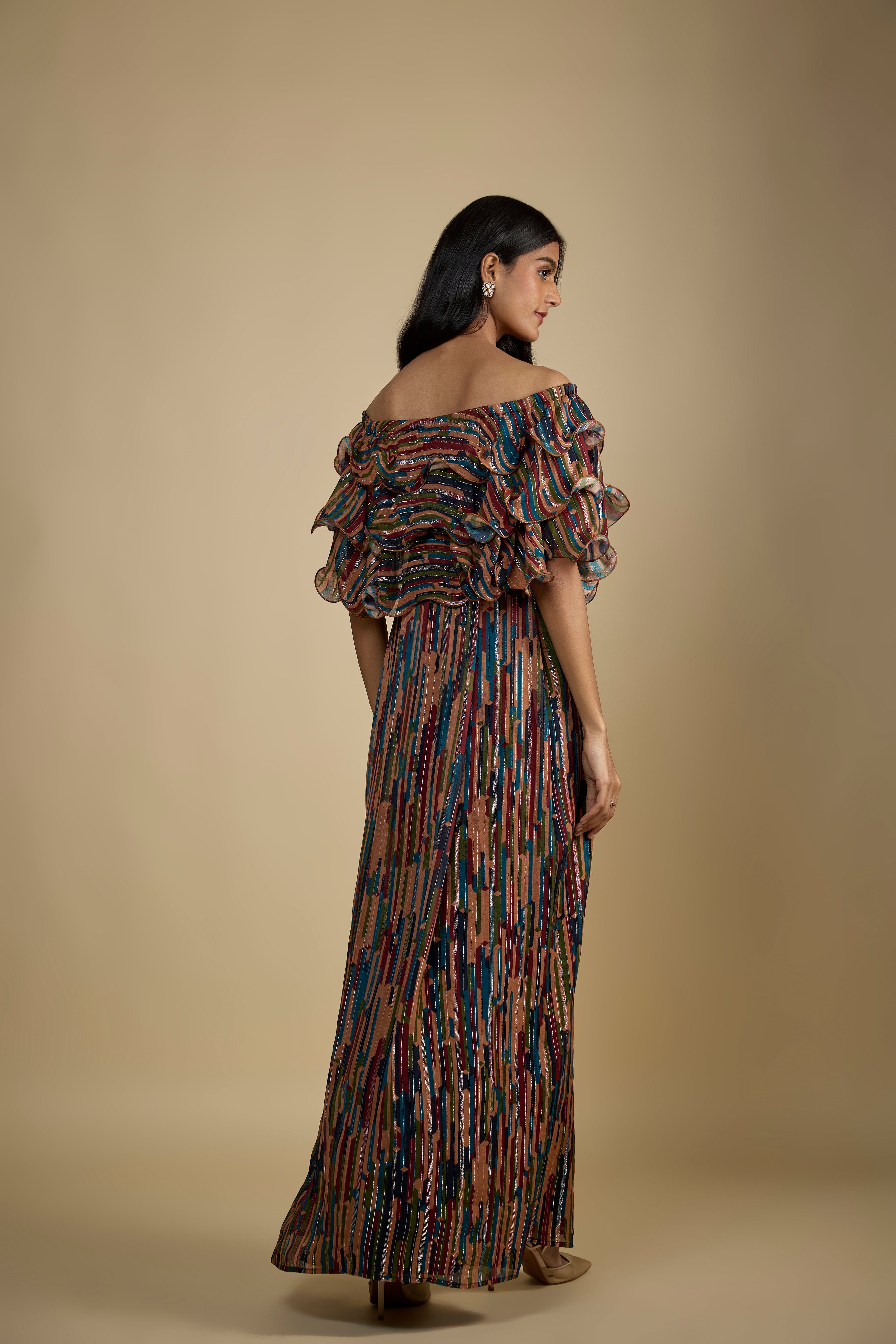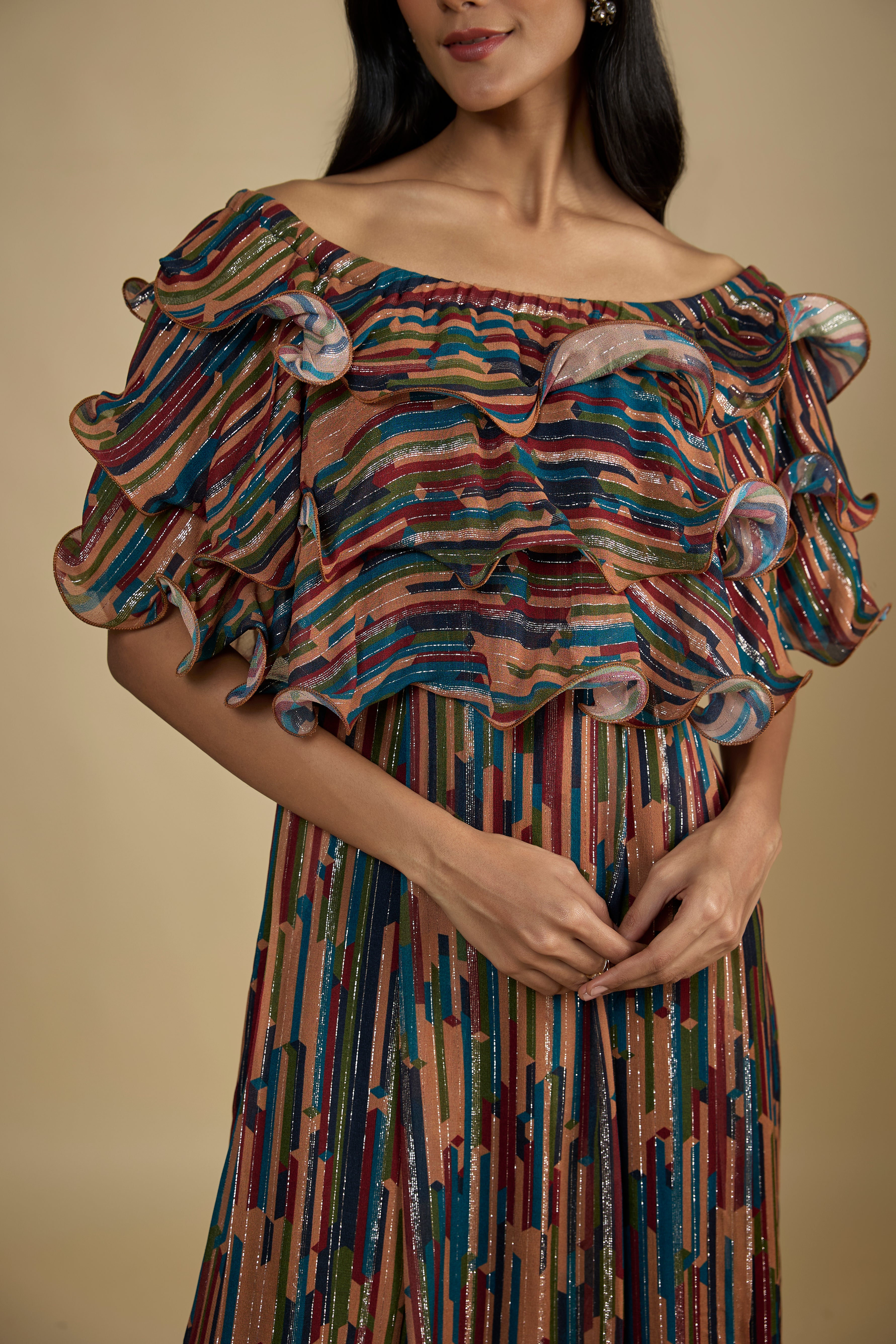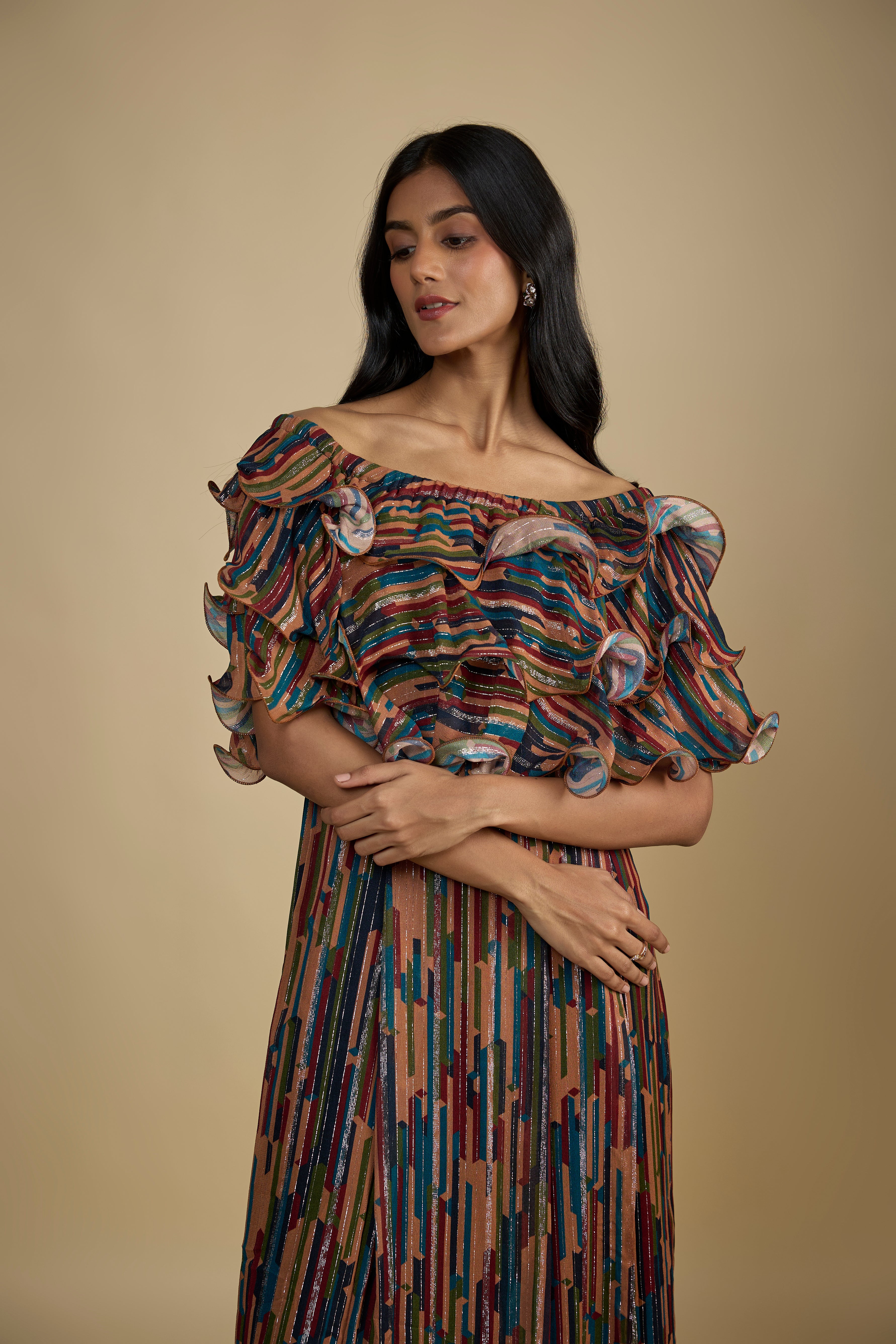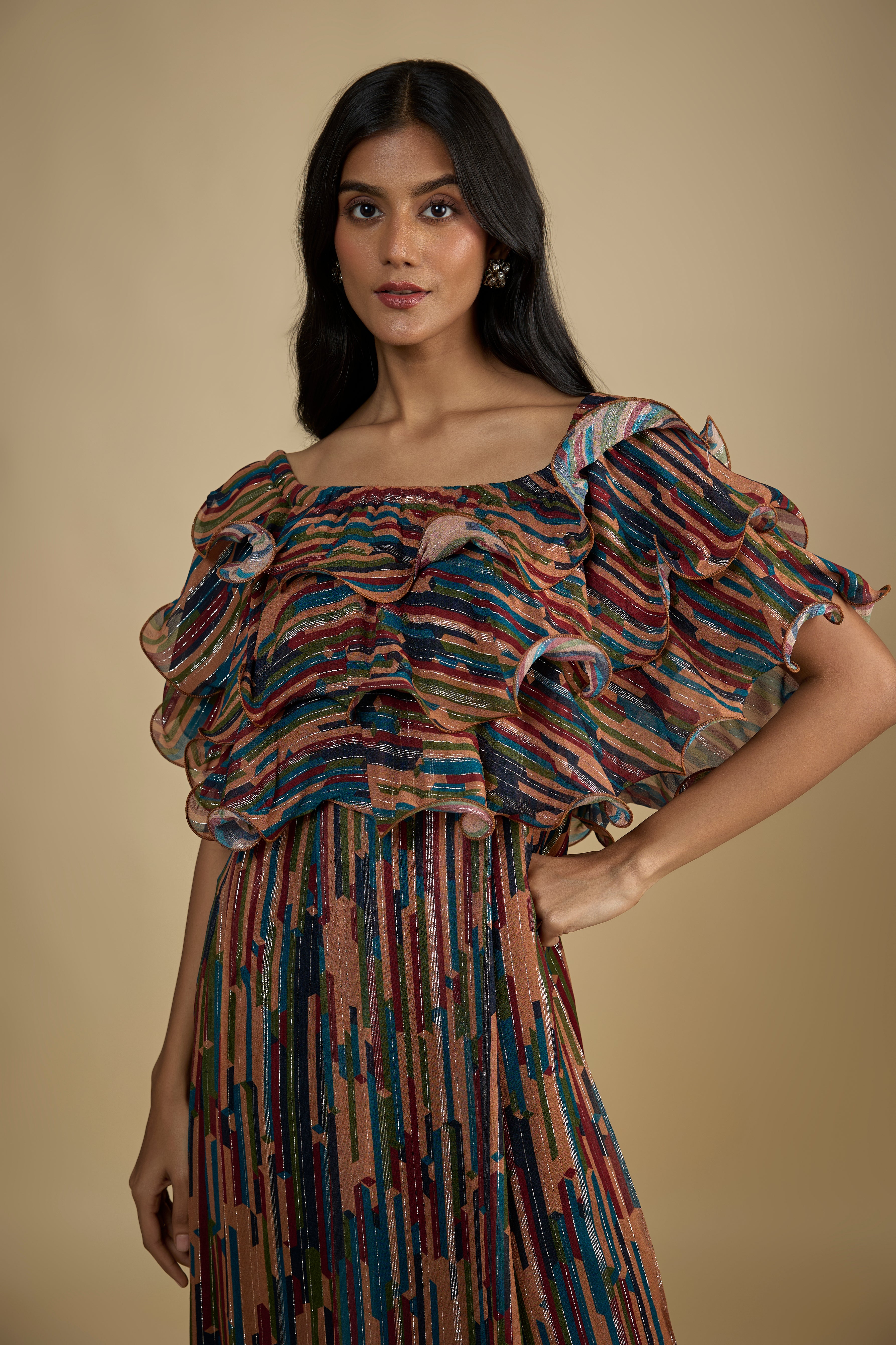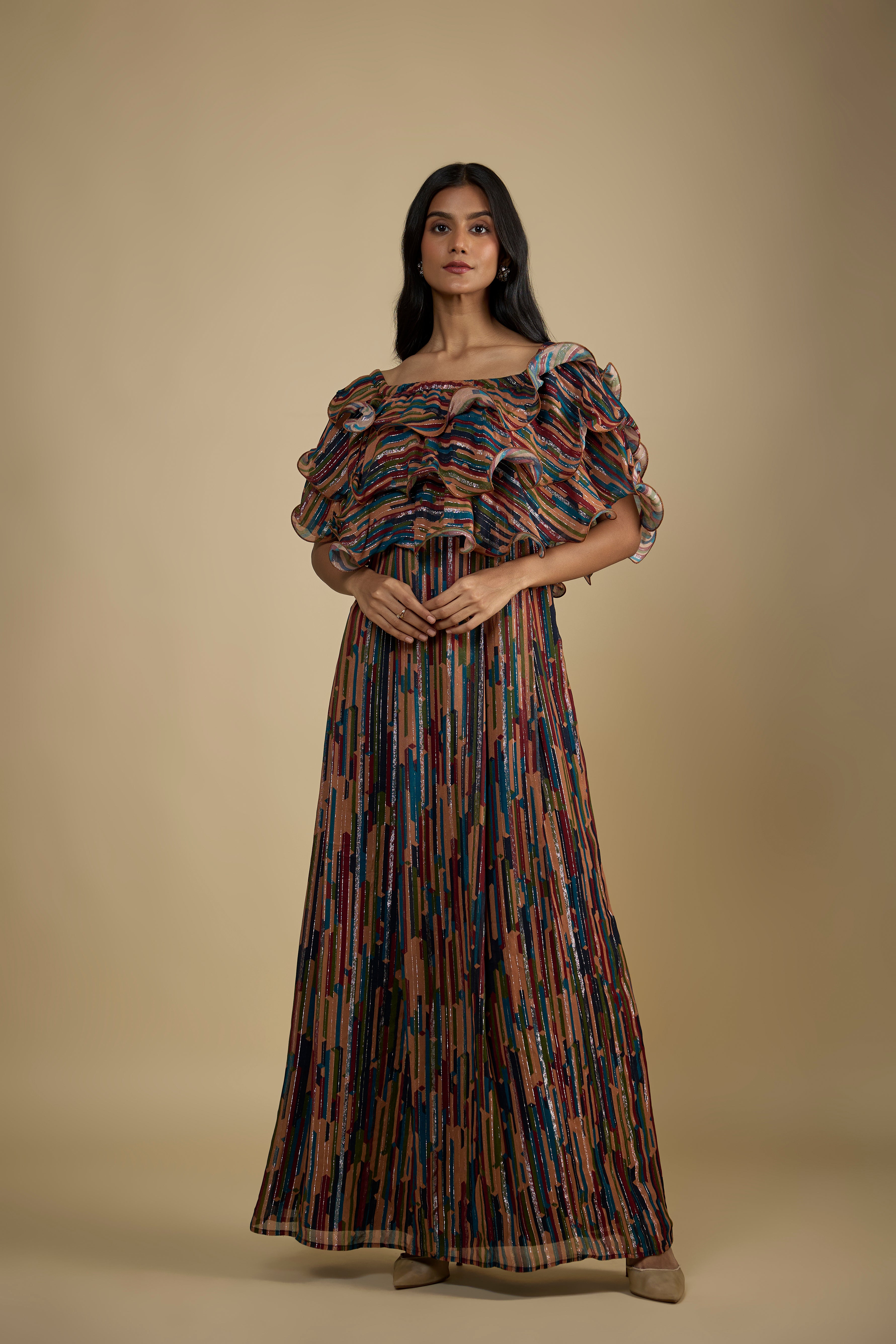 Featuring a multicolor printed ruffled dress in lurex georgette fabric.