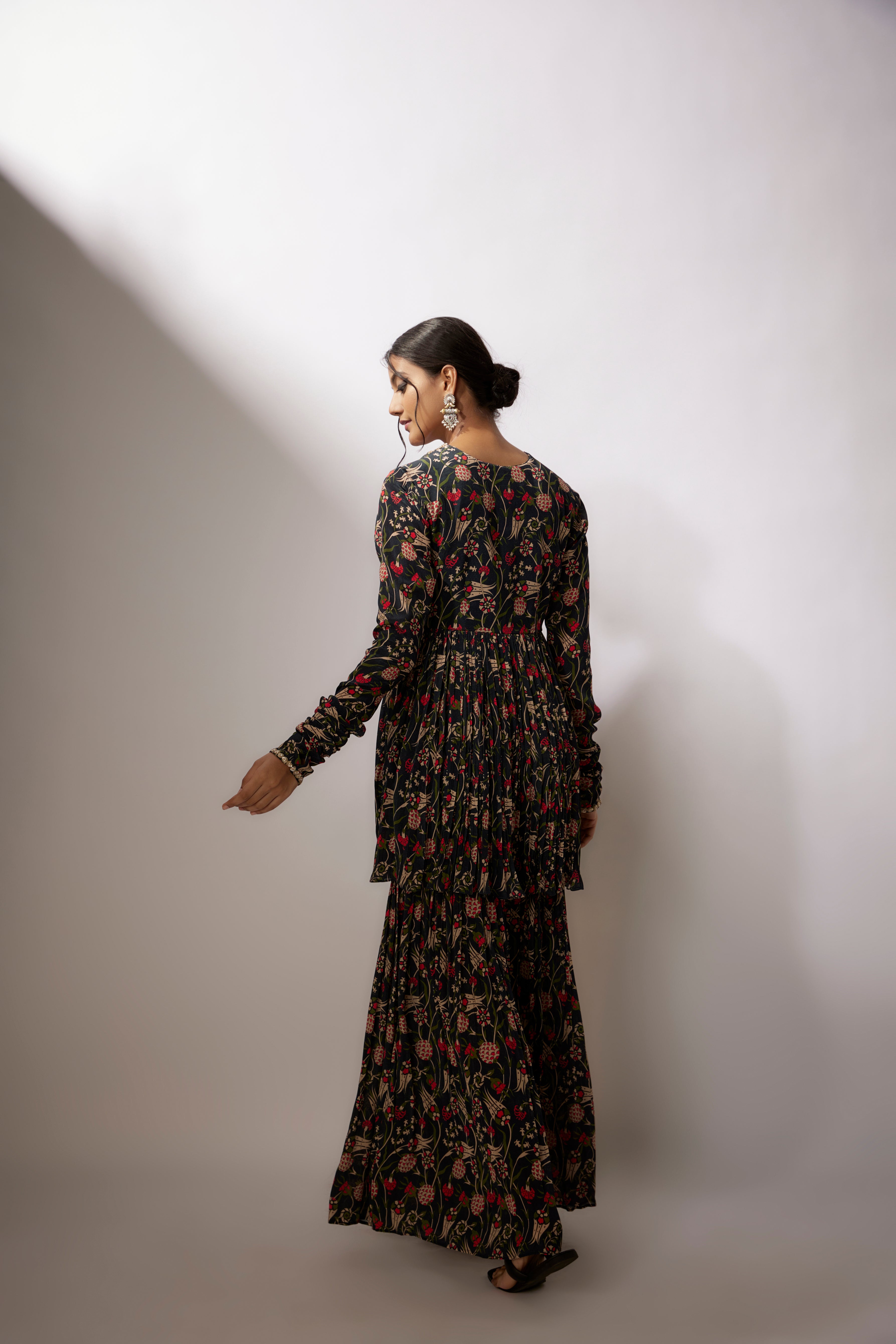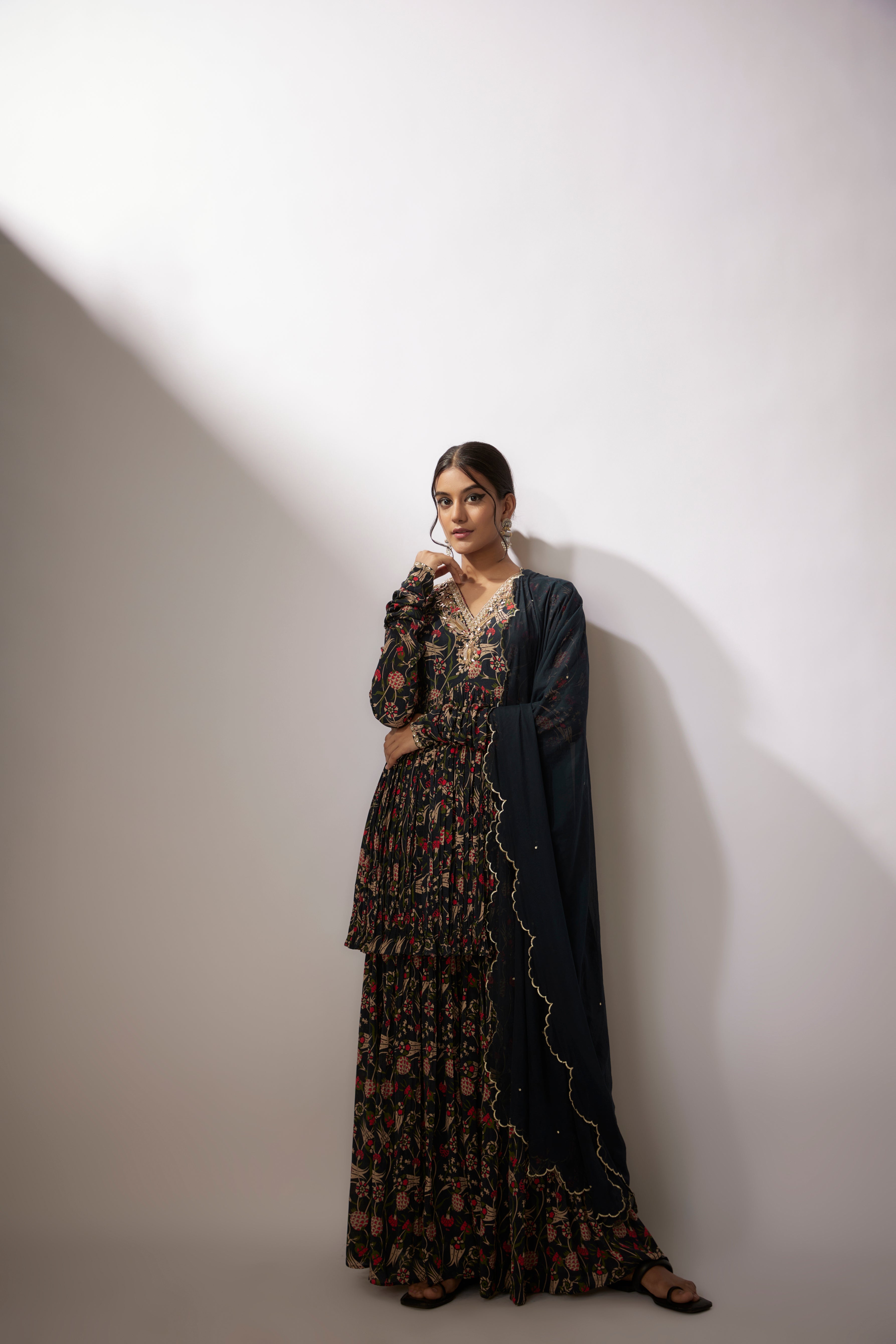 Featuring a navy blue printed kurta in crepe fabric with zardosi work on neck & cuffs. Comes with matching sharara pants in crepe and dupatta in net fabric with sequins & cutwork embroidery.