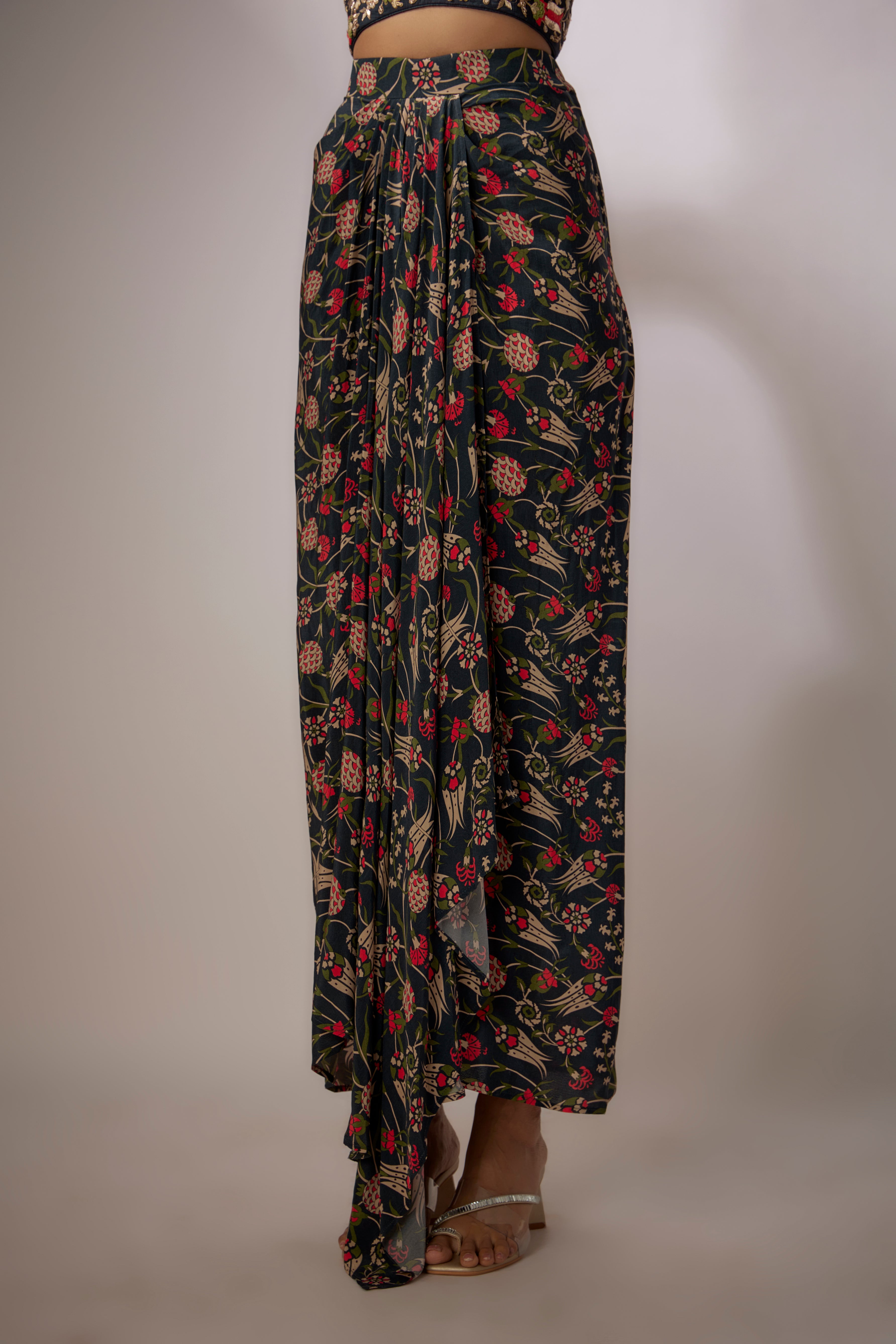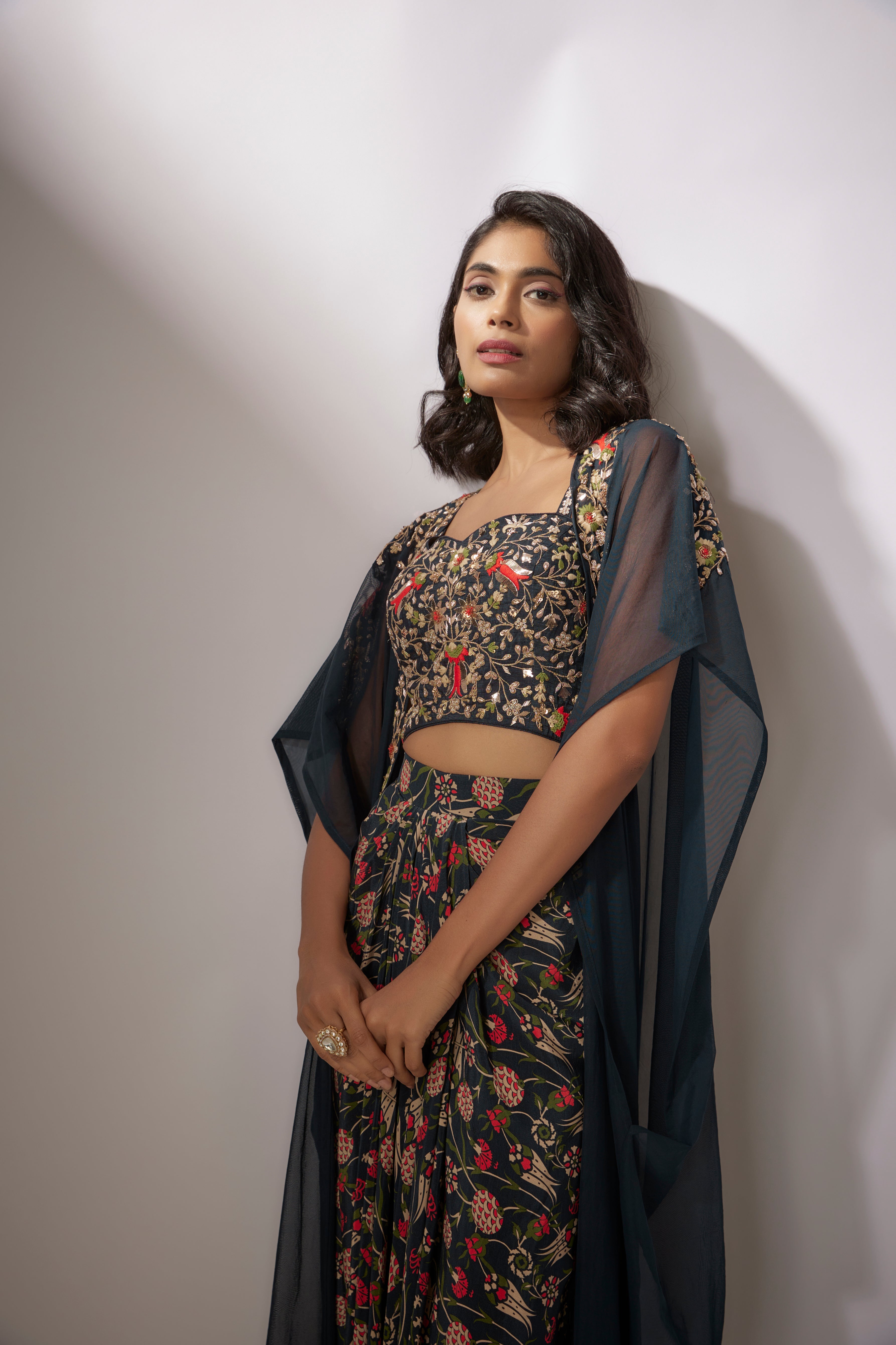 Featuring a Navy Blue printed blouse in dupion silk with zardosi embroidery & matching skirt in crepe, both having zip closure. Comes with navy blue zardosi embroidered dupatta in net fabric.
