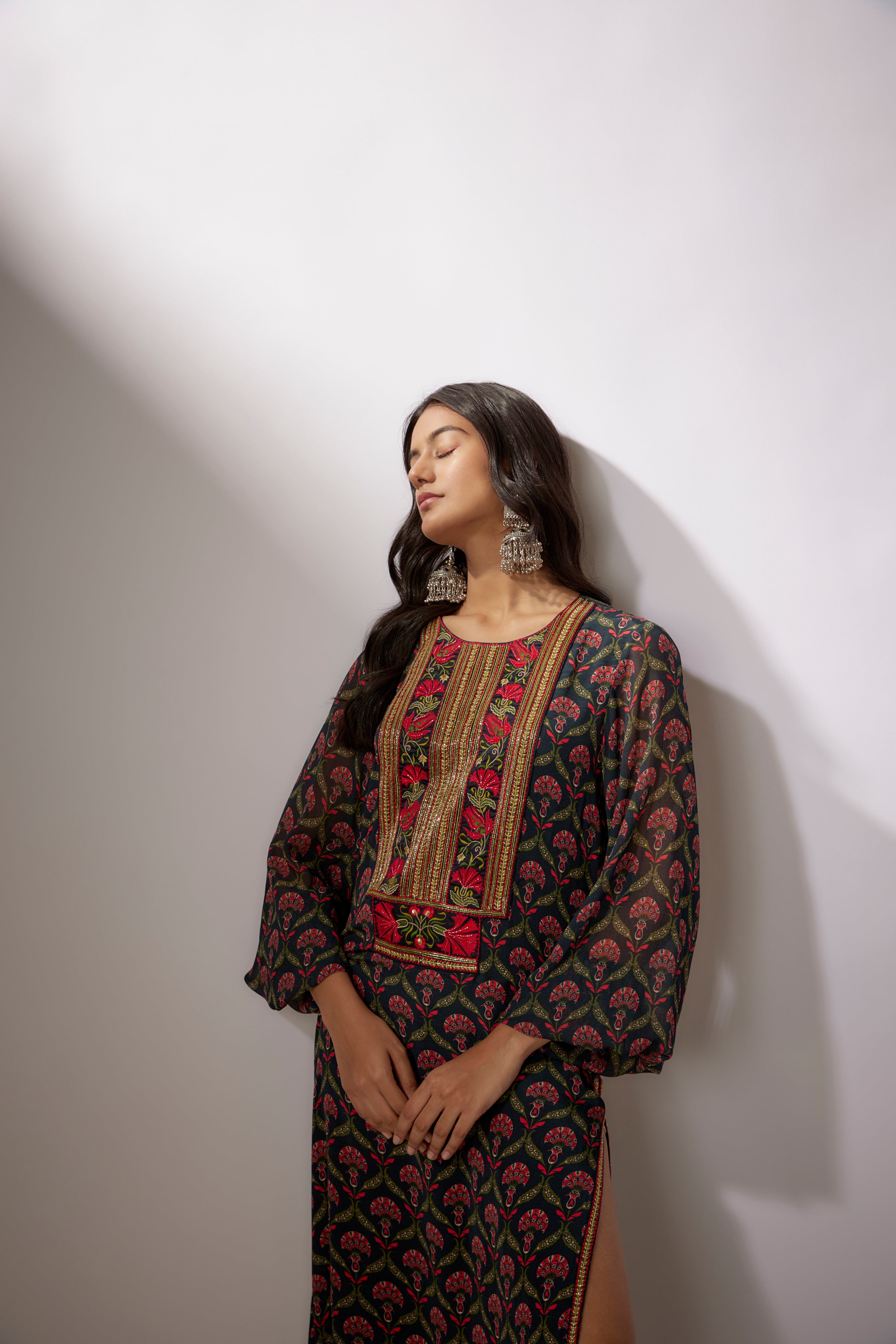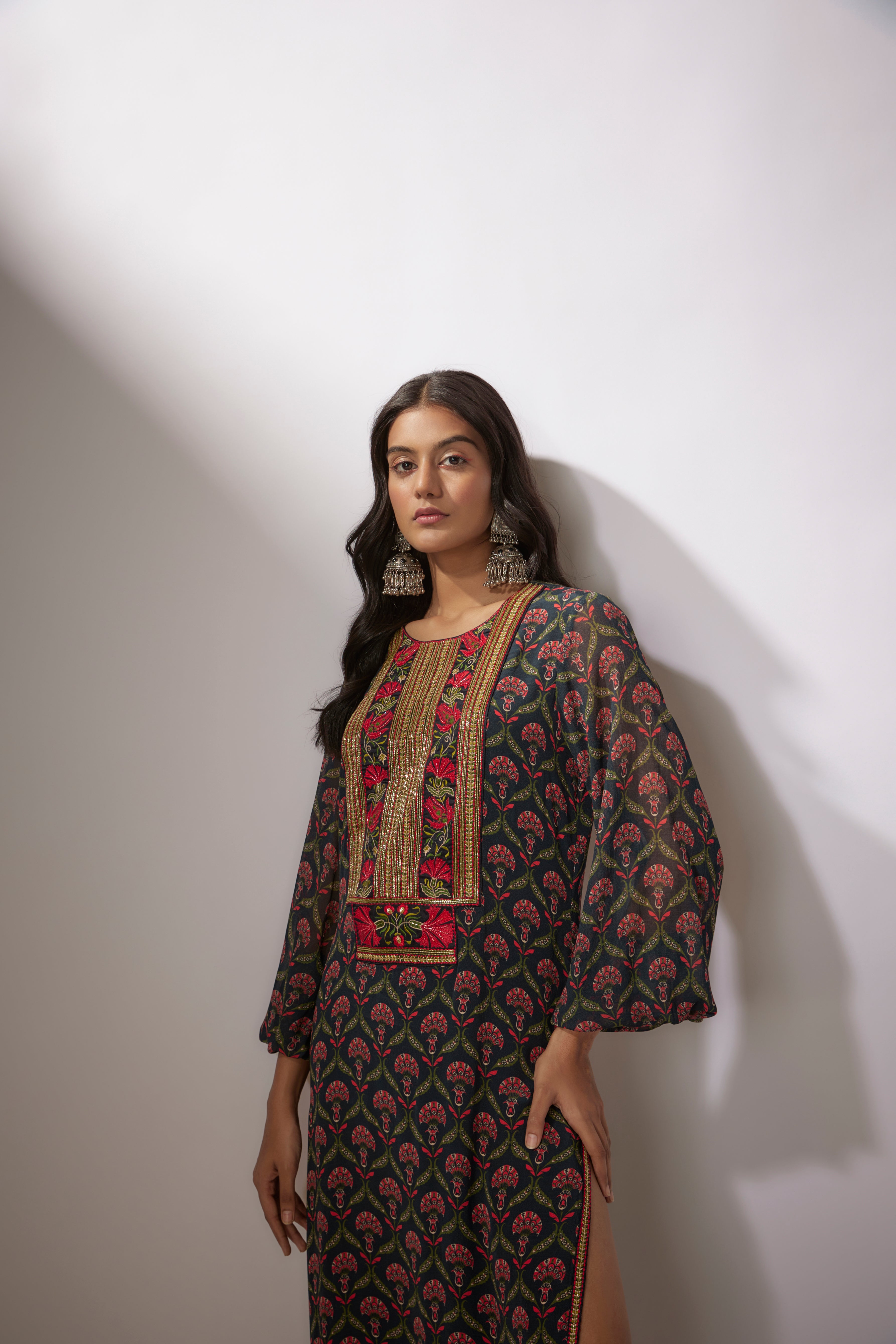 Featuring a Navy Blue kaftan in crepe fabric with threadwork & sequins embroidery.