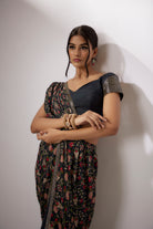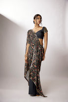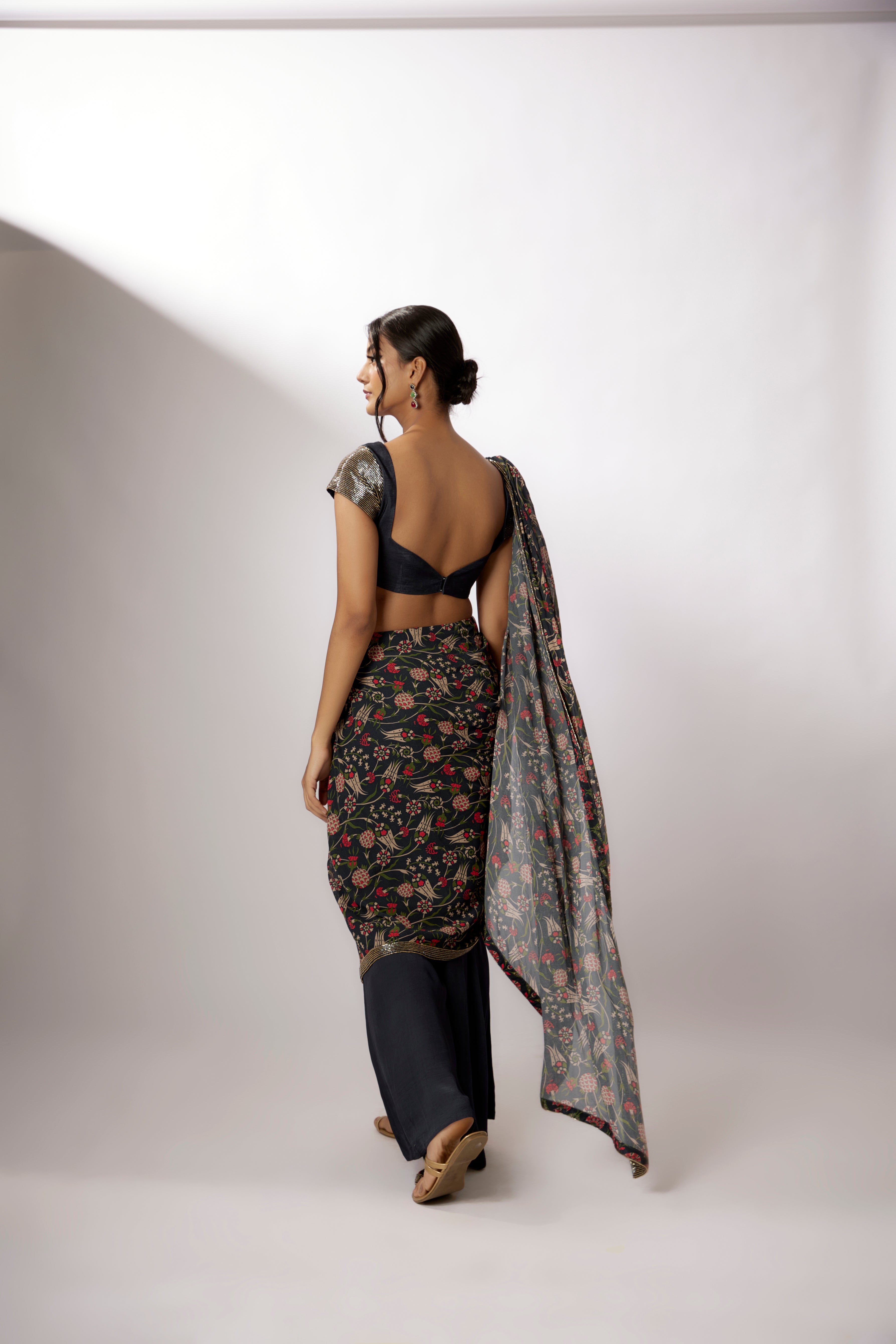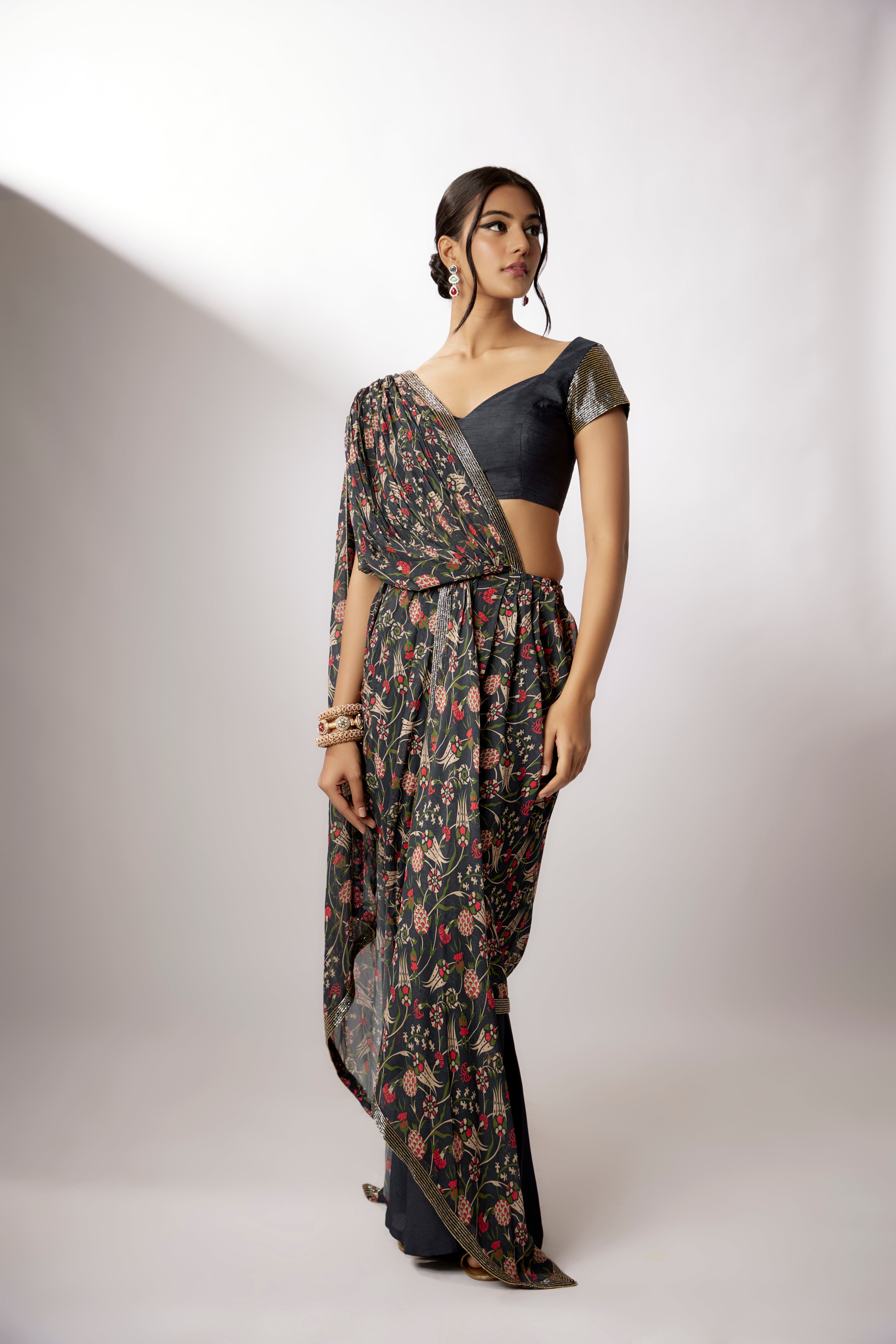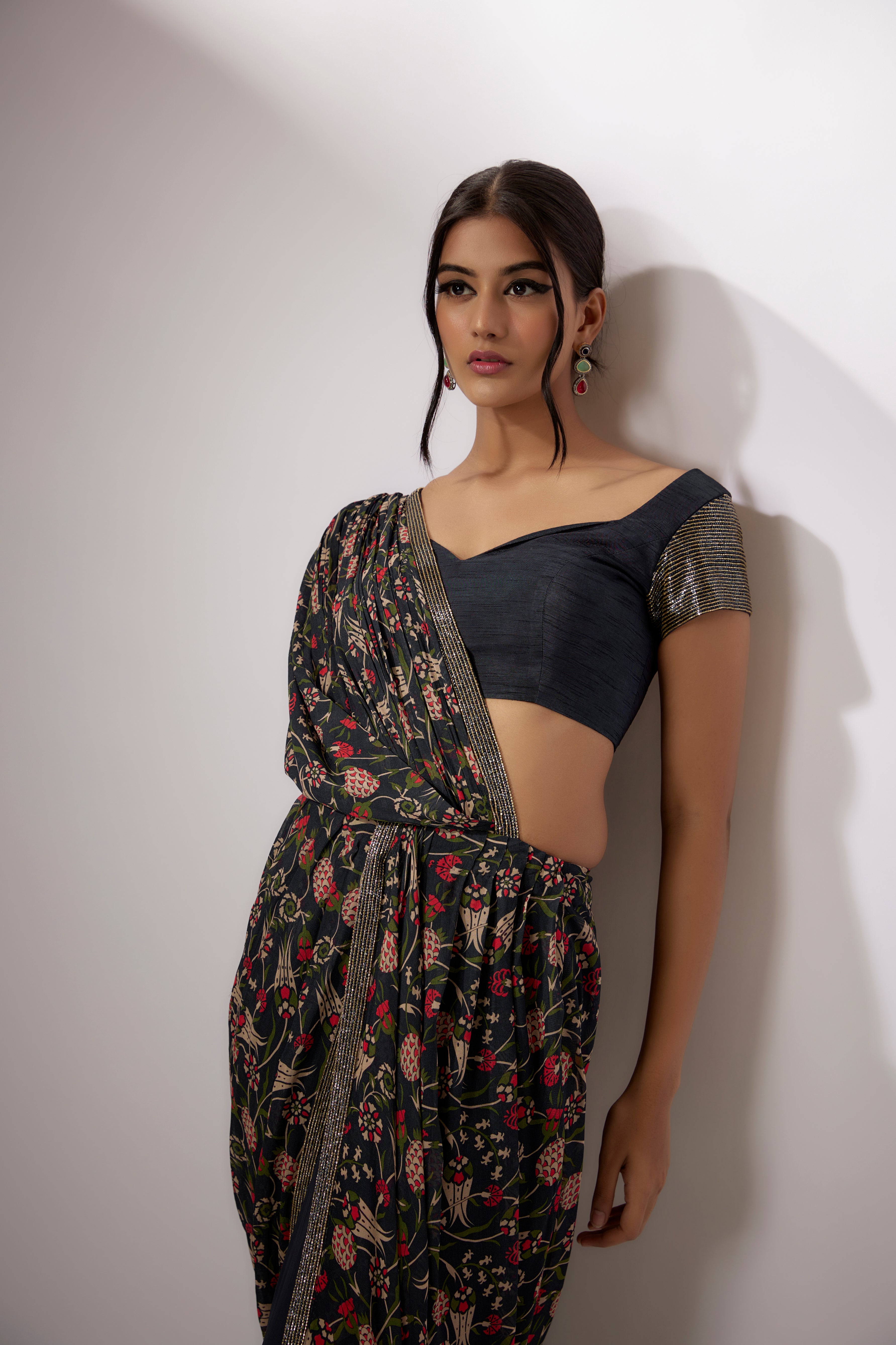 Featuring a navy blue printed pre-stitched saree in georgette fabric & navy blue blouse in dupion fabric. Comes with sequins embroidered on blouse sleeves & saree edges.