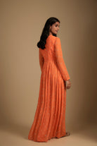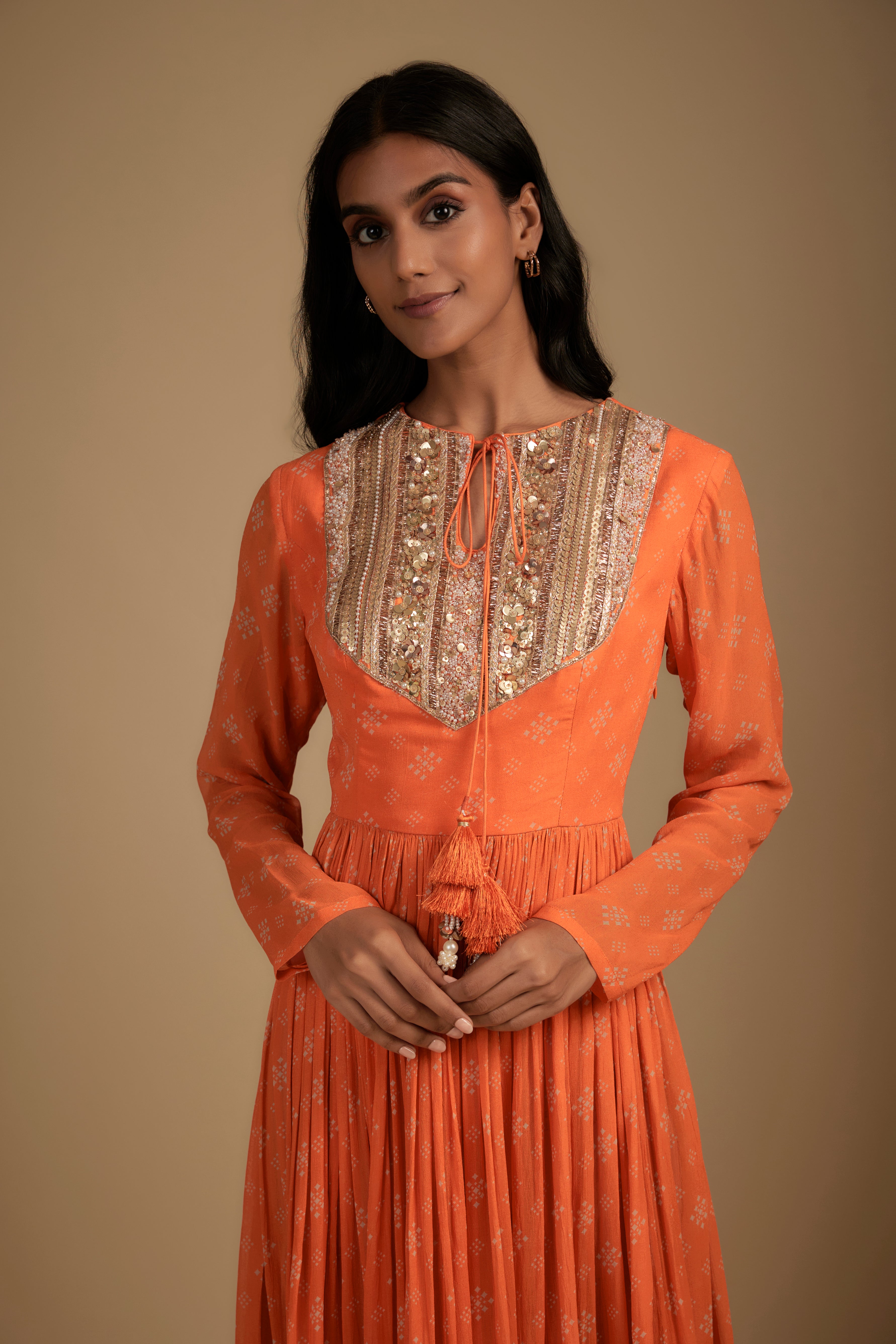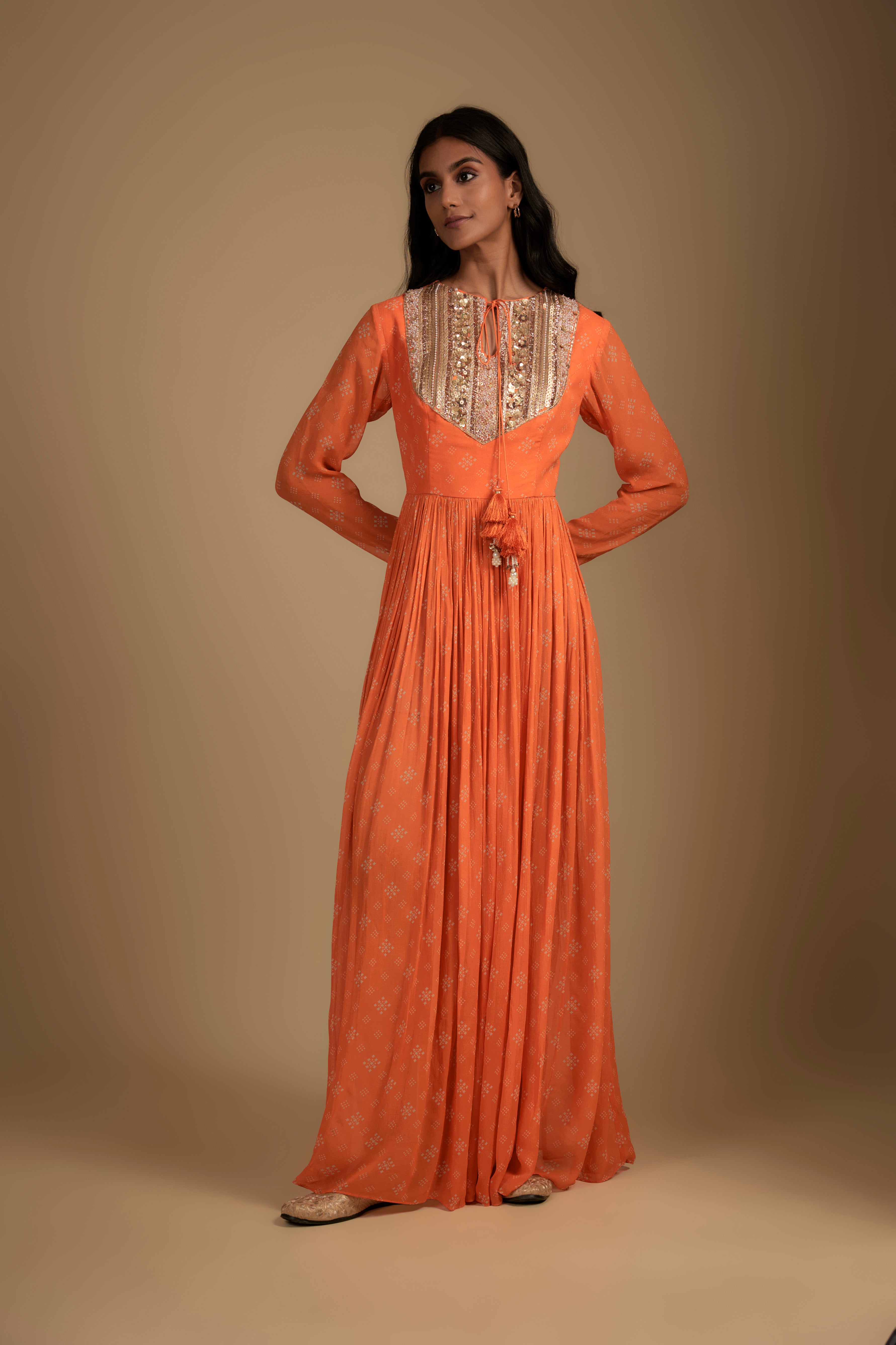 Featuring an orange printed maxi dress in crepe base. Sequence & Zardosi embroidery work with front tassels tie-up detailing. This product contains on one piece only.