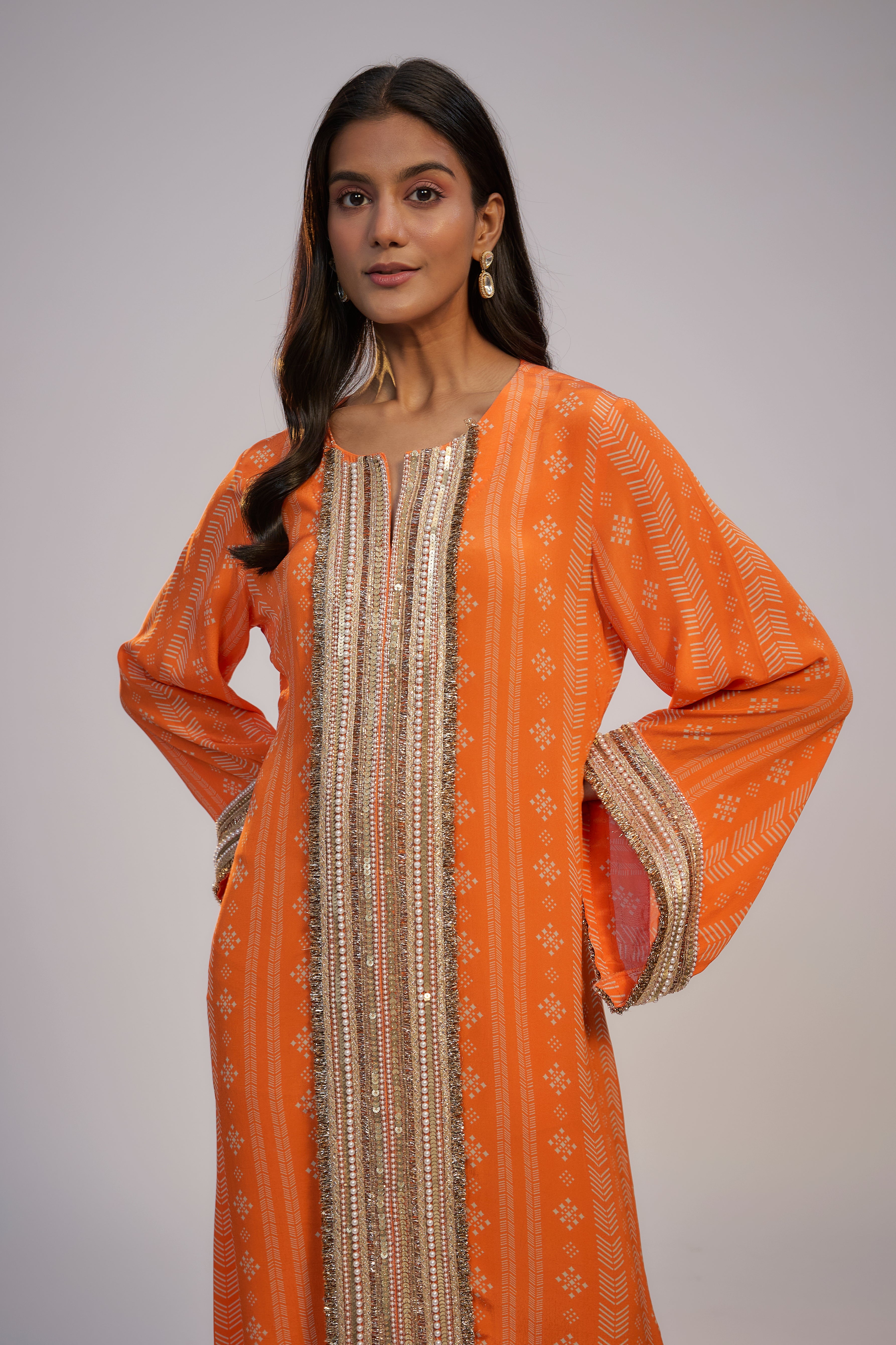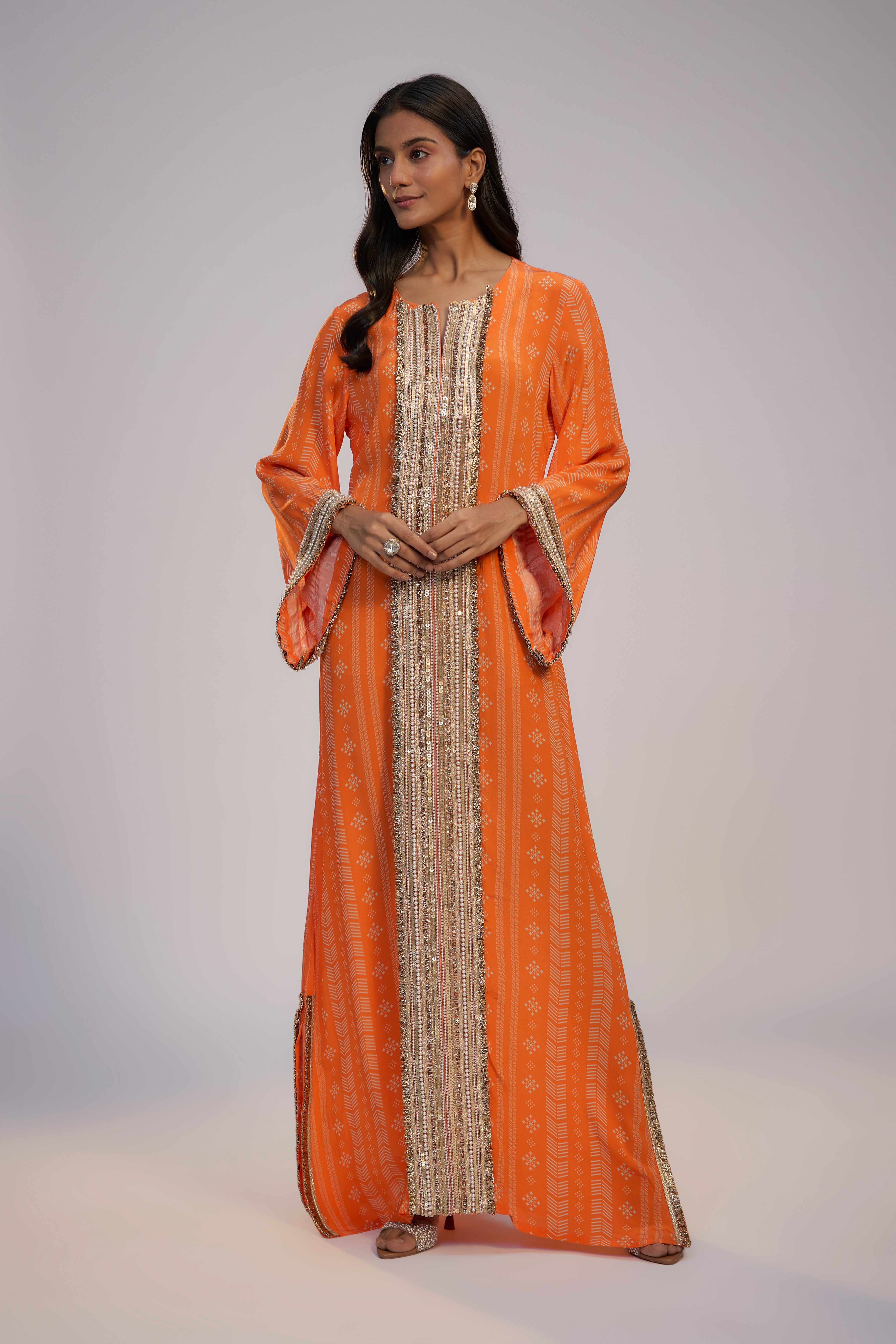 Featuring an orange crepe printed kaftan dress with sequins and pearl embroidery and gold fringe details.