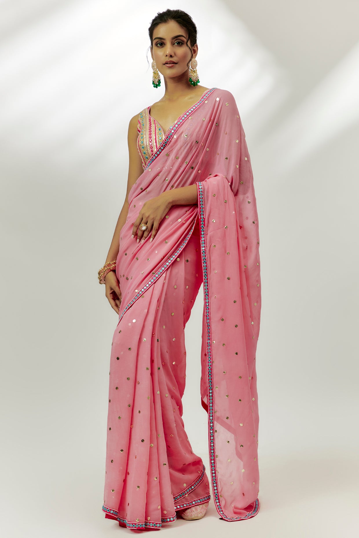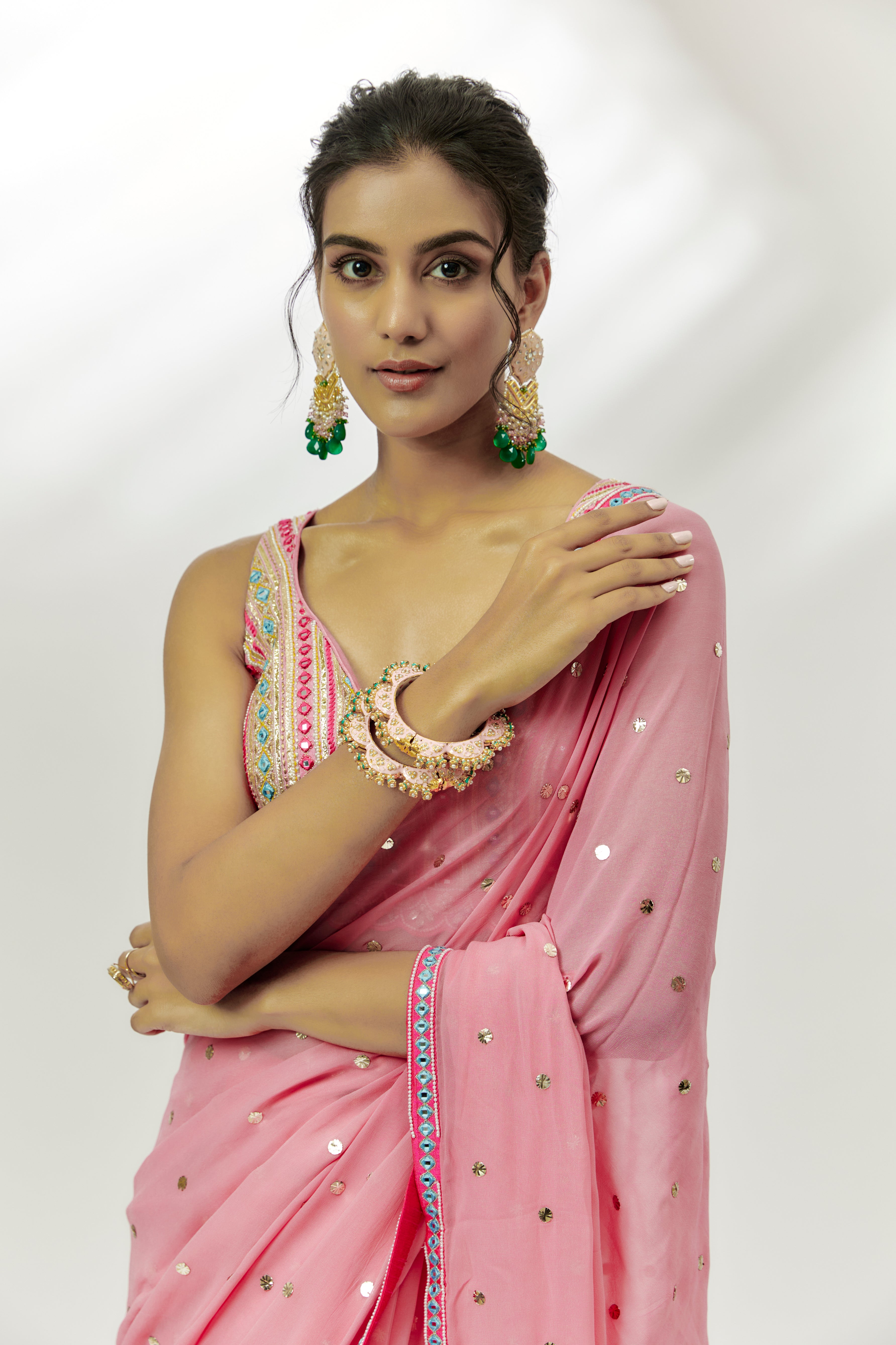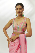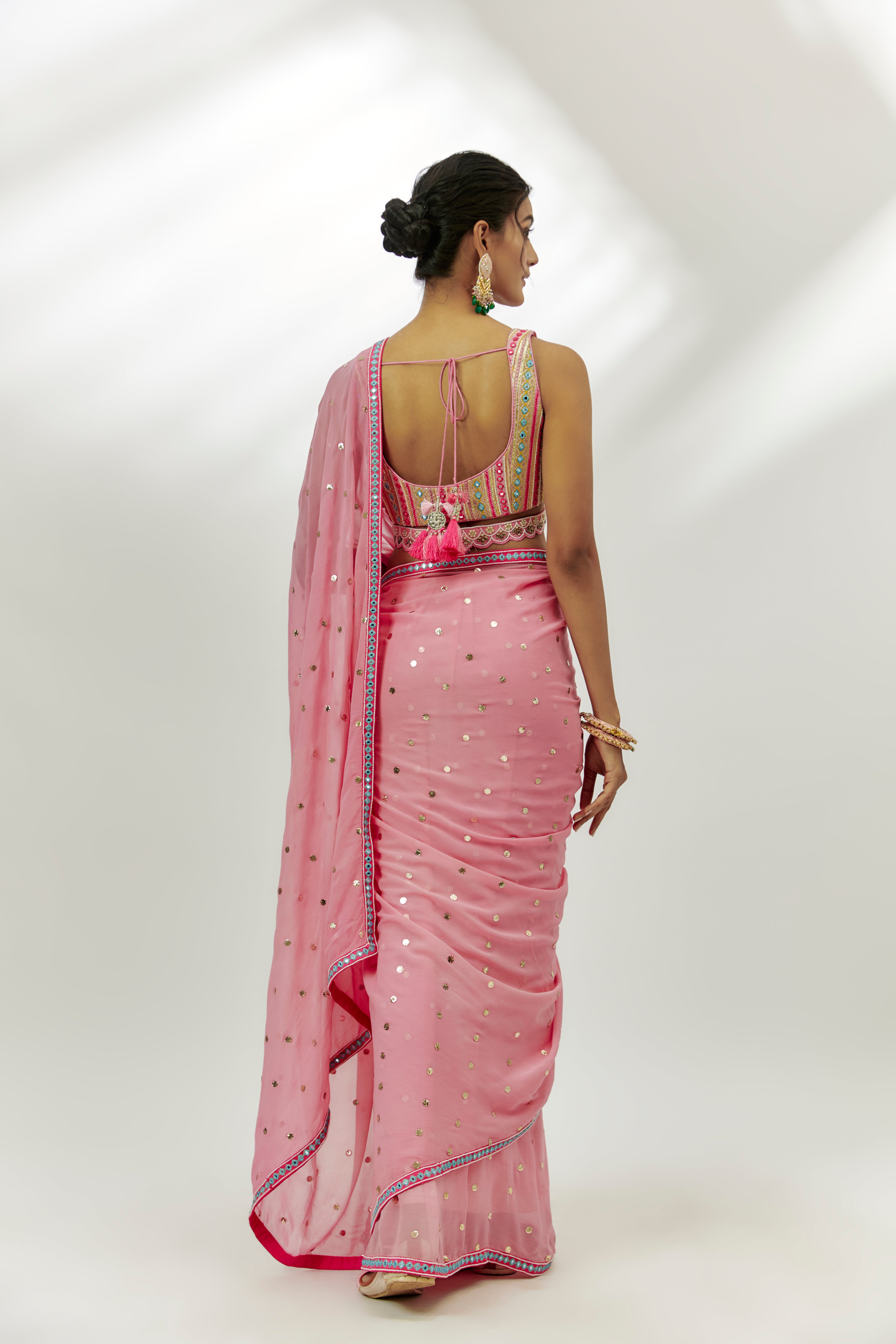 Featuring a pastel pink saree in georgette base with badla work. It is paired with a silk gota embroidered blouse. Accentuate with statement jewellery and heels for a festive occasion.