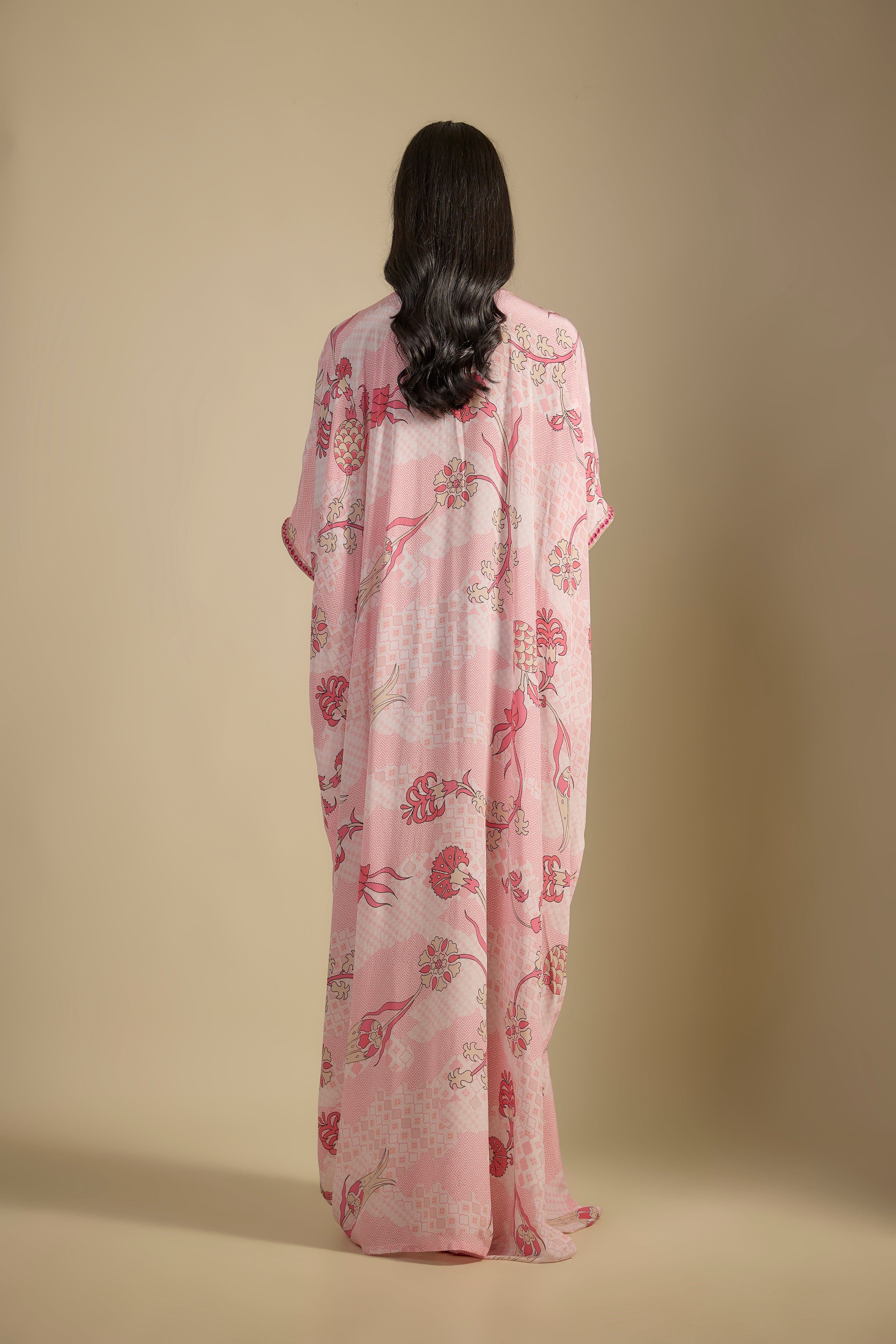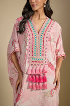 Featuring a pastel pink printed crepe kaftan dress with mirror & pearl embroidery with gota work and tassel details.