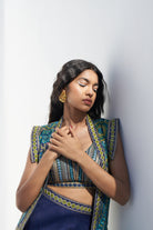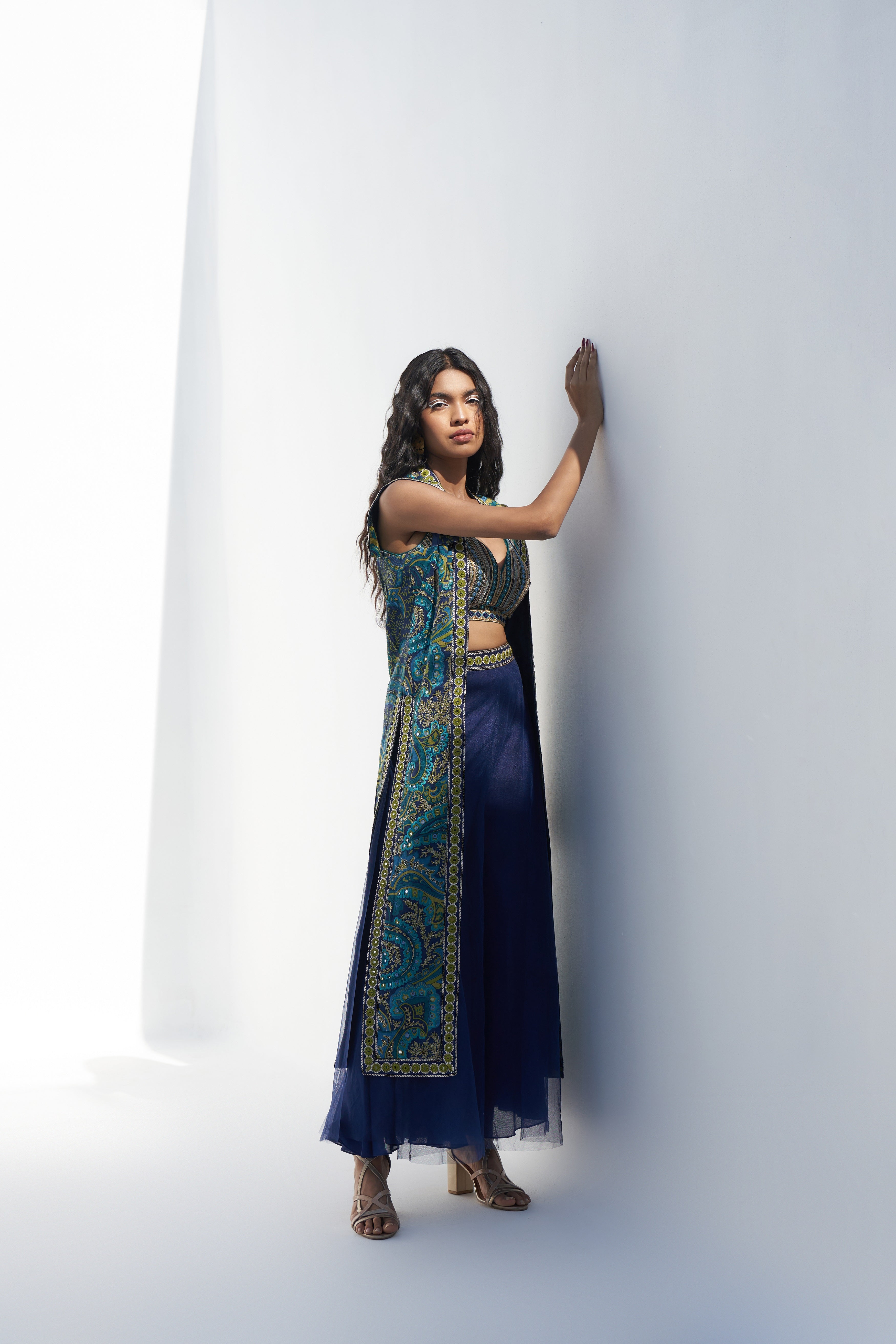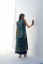 Blue- Green paisley printed sleeveless jacket with embroidered edges. This product contains only one piece.