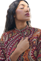 Paisley Printed Dupion Sherwani With Embroidered Highlights And Abla Work Edges.